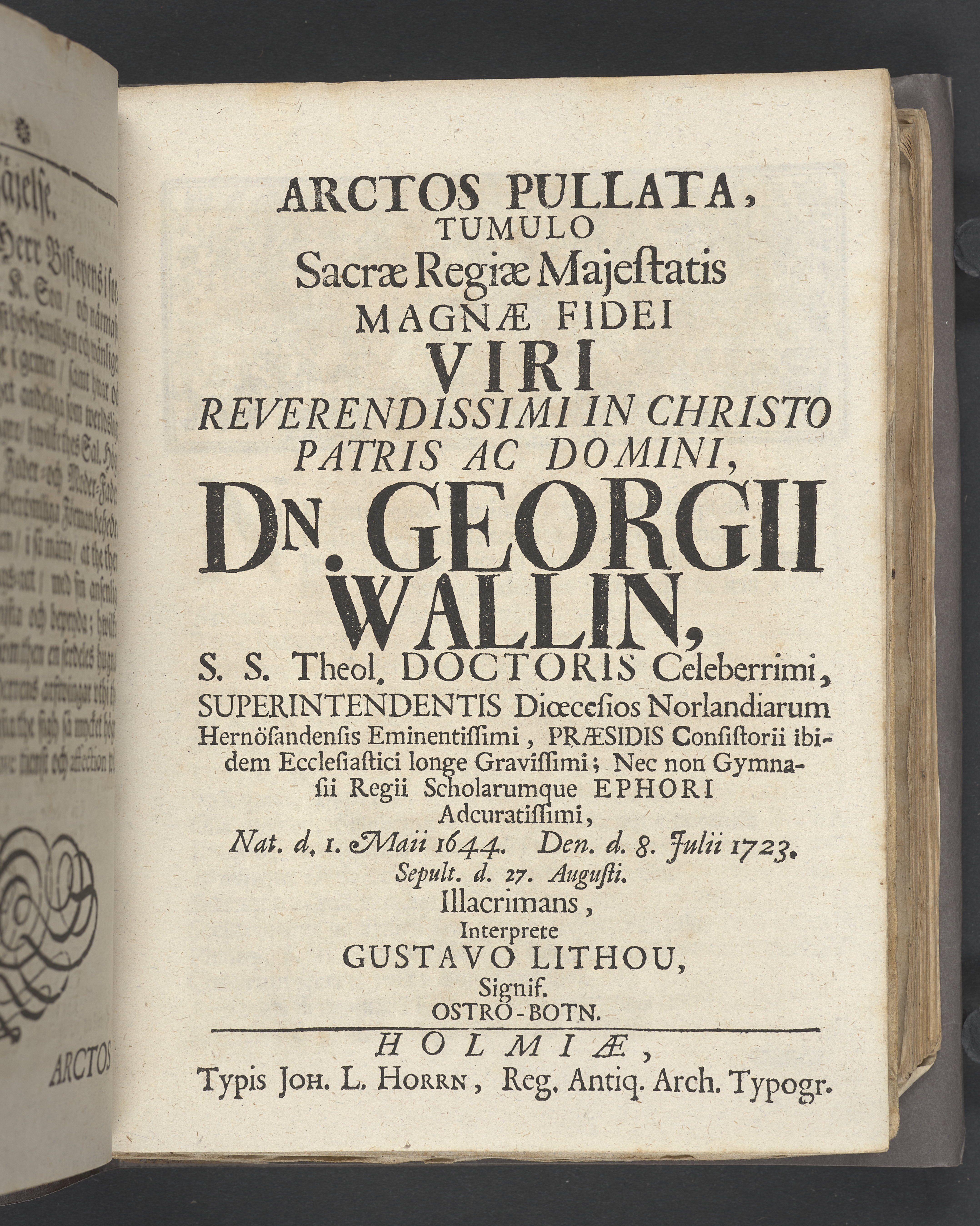 Arctos pullata, tumulo sacrae regiae majestatis magnae fidei viri ... Georgii Wallin, s.s. theol. doctoris celeberrimi, superintendentis dioecesios norlandiarum Hernösandensis ... nat. d. 1. maii 1644. Den. d. 8. julii 1723. Sepult. d. 27. augusti. Illacrimans, interprete Gustavo Lithou ... Holmiae, typis Joh. L. Horrn, reg. antiq. arch. typogr.