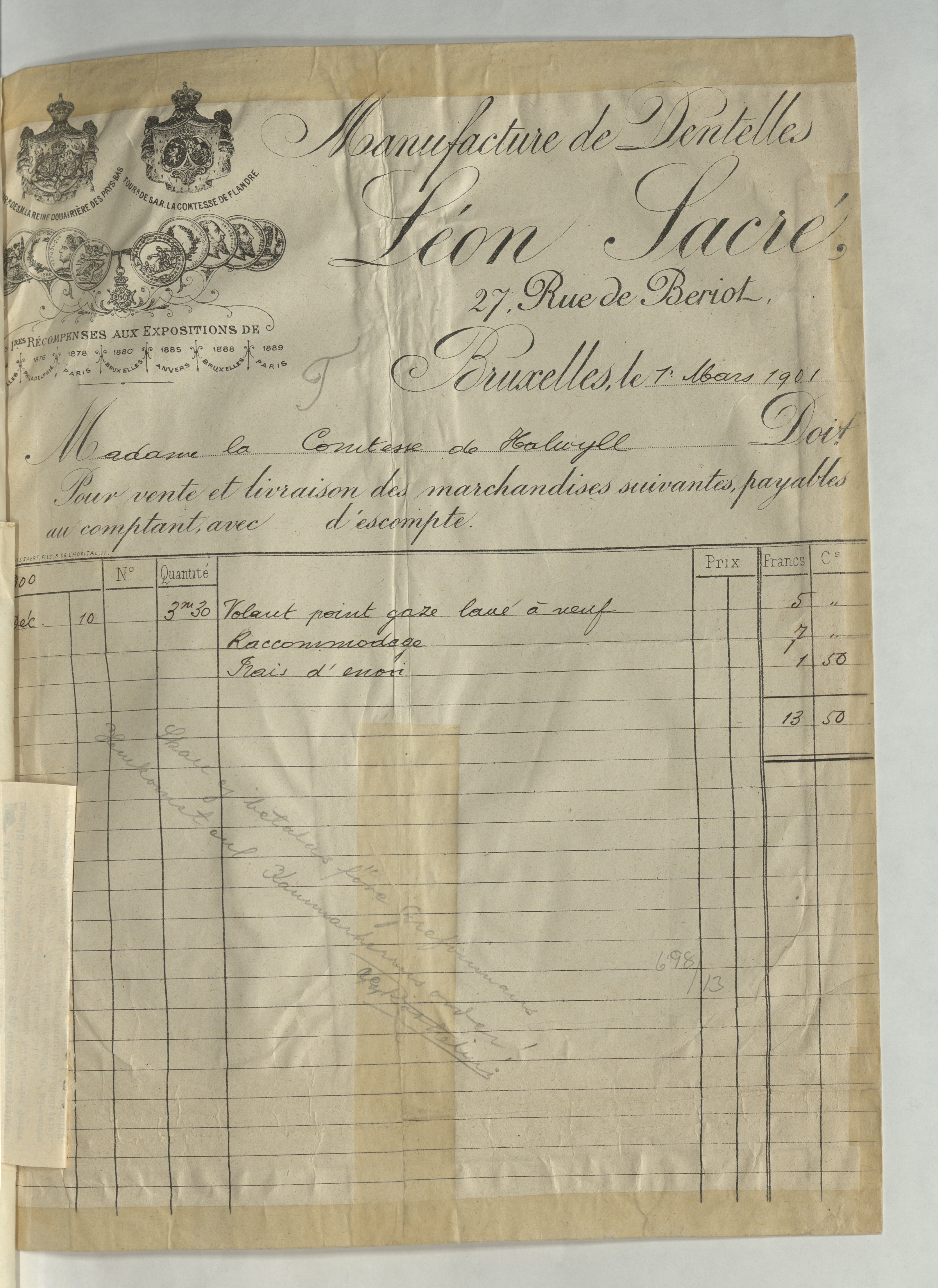 Kvitto från Léon Sacré, Manufactures de Dentelles, Bruxelles till Madame la Comtesse de Hallwyl, med en summa på 13:50 Francs. Bryssel 1 mars 1901.