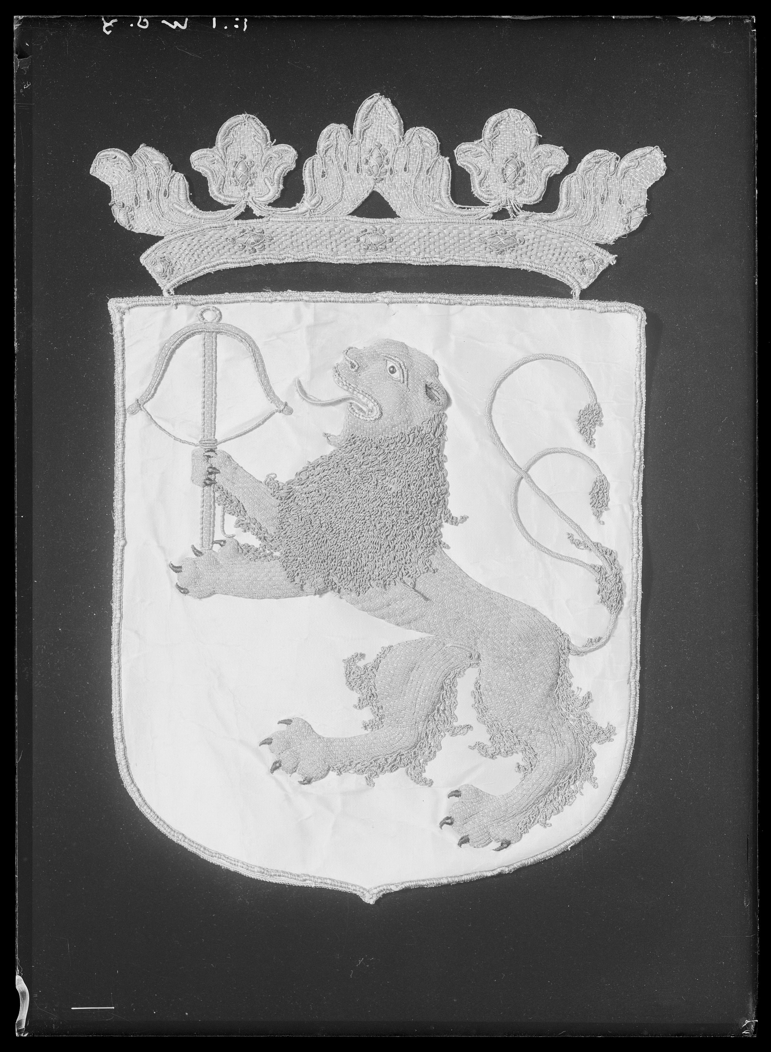 Vapenskölden är av gul sidenatlas kantad med en bård bestående av en tjock snodd av silverlan och gul silkestråd virad runtom en silkeskärna. Innanför snodden ligger en smal tvinnad silvertråd och ytterst är ett smalt vävt band av vit silkestråd och tunna silverlan samt silvertråd utdragen som i små öglor. Större delen av skölden täcks av ett applikationsbroderi i relief, föreställande ett stående dubbelsvansat lejon hållandes ett uppåtvänt armborst. Lejonet är broderat i läggsöm av ljust röd silkestråd och silvertråd. Mellan stygnen skymtar en botten av rött silkegarn. Hårbeklädnader dvs man och benhår samt svanstipp är av krusad ljusröd silketråd och silvertråd. Lejonet har ett öppet gap kantat av en snodd av silvertråd och vit silkestråd. Det sträcker ut tungan som liksom gapet är av ljusrött silkegarn. Små vita spetsiga tänder av något tunskuret benmaterial sticker fram. Lejonets öga är av en svart glaspärla, kantat av kantilj av silvertråd. Nosen är av silvertråd och vit silkestråd och örat markeras av en snodd av röd silketråd och silvertråd, ifyllt med svart silketråd. Lejonet har fyra klor på vardera tass. De är av svart silketråd. Svansarna är av tjockt snöre av ljusröd silketråd och silvertråd med svanstipparna är så som tidigare nämnt av krusat silketråd och silvertråd. Mellan framtassarna håller lejonet i ett uppåtvänt armborst av förgylld silvertråd nedsydd med stygn av vit silketråd. Kanter och detaljer utgörs av en snodd av silvertråd och vit silketråd. Skölden kröns av en grevlig krona som sitter fastsydd i två ändar. Den har en 32 mm bred kronring av förgylld silvertråd i läggsöm i ett schakmönster kallat gaufrure. Kronringen kantas av snoddar av silvertråd runtom silkeskärna samt ytterst i nedre kanten av ett smalt vävt band av smala silverlan och vit silkesrtåd och små öglor av silvertråd. På kronringen är broderat ovaler och romber av silverlan kring vilka är virat blå och röd silkestråd, kantade av tvinnad förgylld silvertråd och små prickar av kantiljer av förgylld silvertråd. Kronans spetsar föreställer stiliserade blad broderade i läggsöm av förgylld silvertråd, med tjocka kanter och av tvinnat silversnöre. Mitt på vardera blad sitter en romb eller en oval av silverlan kring vilka är virat röd och grön silkestråd. Vapnet är på baksidan klätt med beigefärgad linnelärft med påklistrat gulnat papper. Kronan täcks på baksidan av stygn. Mitt på baksidan av skölden står en påskrift med svart bläck: "Smålandt" och därunder med blyerts: "No 68".