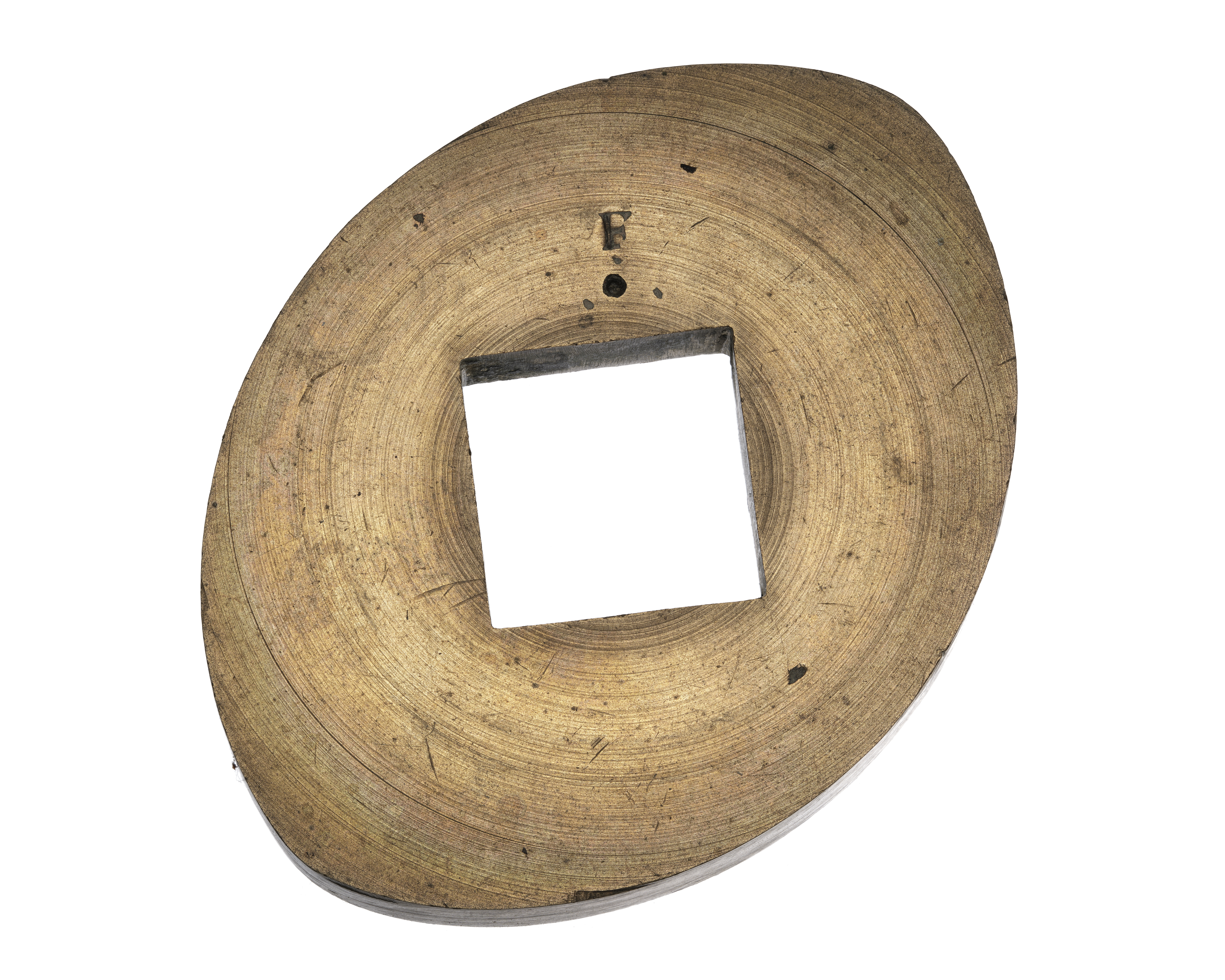 Kvadratiskt hål med 21,2 mm sida. Stämplad på ena sidan med en punkt och "F", på andra sidan med tre punkter.