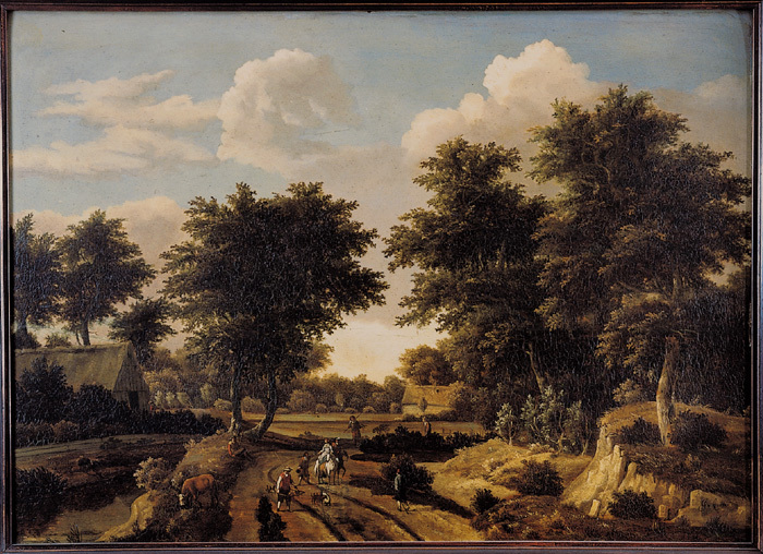 - På väg till falkjakten. I förgrundens midt en bred landsväg med djupa hjulspår och krökande sig i bakgrunden åt höger kring en buskbevuxen markremsa. Längst till höger en gräsbevuxen, med uppresta stenblock kantad plan kulle, å denna ett träd, vid hvars fot två buskar. Bakom kullen en något lägre, gräsbevuxen kulle med träd och buskar. Å vägen bakom markremsan två män; den bortre vänd åt vänster, till hälften skymd af buskarna, i gråbrun hatt, röda tröjärmar och gråbruna kläder; den främre mannen vänd framåt, bärande ett långt spö å högra axeln samt en mörk fågel å vänstra handen, i gråbrun hatt och rock samt rödbruna knäbyxor. Mera i förgrunden framför en buske en bortåt gående man med en käpp i vänstra handen, i röd mössa, lång blågrön rock, hvita strumpor och mörka skor. Något längre i bakgrunden ett framåt ridande par; damen till vänster, på en hvit häst, i röd mössa, ljusblå öfverklädning och lång gulbrun underklädning; mannen på en gråbrun häst, i mörk hatt med hvit plym samt brun rock. Till vänster om damen en stående man, med vänstra handen räckande henne en mörk fågel, i den högra hatten, med långt brunt hår, i gulbruna kläder och hvita strumpor. Något framför honom mellan hjulspåren tre hundar, en hvit och två bruna. (Framför hundarna två öfver-målade figurer.) Till vänster därom en man (falkeneraren), vänd framåt, gående inuti en stor rektangulär ram, som hänger horisontalt på två öfver axlarna liggande band; å ramen åtta bruna fåglar (falkar) med röda hufvor; mannen med mörkt hår, i grågul hatt, röd väst, hvita skjortärmar, mörkbruna knäbyxor, hvita strumpor samt gråbruna skor. Vid vänstra vägkanten en gräsbevuxen vall med enstaka buskar. Å vallen en betande rödbrun ko med hvitt hufvud; längre bort en sittande man, hållande ett spö i vänstra handen, den högra mot marken, i grå hatt, röda tröjärmar och gråbruna kläder. Bortom honom två träd. Nedanför vallen en smal kanal med bortre strandkanten afspeglad i vattnet, å denna en sittande man, hållande ett metspö, bakom honom en framstupa liggande man, till vänster en buske. Därbakom en delvis synlig stor lada under halmtak, med långsidan mot åskådaren och högra gafveln af stående gråa bräder samt med dörröppning. Framför denna en stående kvinna i grå hätta och röd tröja. Framför ladan låga träd och buskar samt därframför ett grått plank af liggande bräder. Bakom ladan höga träd. I mellanplanet ett träskliknande , vatten i gråbrunt och blågrönt. Till höger där-bortom en gulgrå mindre lada under halmtak, omgifven af buskar och låga träd. I bakgrunden träd och buskar samt främst å stranden två otydliga figurer. Mark, träd och buskar hållna i mörkbrunt och grågrönt till ljusare gult. Himlen upptill ljusblå med gråhvita moln, nedtill täckt af dylika moln. Ljuset från vänster. Å baksidan en liten rektangulär ljusbrun papperslapp, hvarå skrifvet med mörkt bläck (orig. 2/i): På trä (ek). Höjd: 0.6 m.; bredd: 0.84 m. Anm. Å taflans midt en horisontalt'gående limfog, synlig å baksidan. Isaac KOENE, f. omkring 1650 i Haarlem, d. 1713; sannolikt lärjunge af JACOB Ruys-dael; landskapsmålare; hans taflor äro försedda med staffage af B ARENT Gael (f. omkring 1620 i Haarlem samt verksam ännu 1687). Enligt Alfred von Wurz-bach : »Niederländisches Kiinstler-Lexikon», Erster Band, Wien und Leipzig 1906. Se Olof Granberg: »Inventaire général des trésors d'art, peintures & sculptures, principalement de maîtres étrangers (non Scandinaves) en Suède», Tome I, Stockholm 1911, n^ 22 (sid. 6; plansch 50, Tome III). j Ram (ny): Af päronträ, brunbetsad och polerad på blindram af furu. Profil som figuren (orig. 8/i): Glas. Höjd: 0.82 m.; bredd: 1.055 m. Inköpt af Wilhelmina von Hallwyl, f. Kempe, å auktion i H. Bukowskis Konsthandel (innehafvare C. U. Palm), Arsenalsgataq 2 D, Stockholm, 26 och 27 Februari 1904. Katalog 156 n:r 513, se räkning 2 Mars 1904. Betald 2 Mars 1904, se Hushållsbok (här uppförd på Februari 1904) och Toilettbok (här uppförd på Februari 1904). Pris: Kr. 355, se räkning. Kända tidigare ägare: 1. Kungl. sekreteraren Carl Fredrik Otto Geijer, f. 3 November 1827, d. 14 December 1901. 2. Kungl. sekreteraren Carl Geijers arfvingar. Af dessa försåld å auktion i H. Bukowskis Konsthandel 18 och 19 Mars 1902 (katalog 145 n:r 132). 3. Bibliotekarien Johan Olof Granberg, f. 24 September 1858. Af honom inköpt å sistnämnda auktion för Kr. 81 (enligt anteckning i katalogen). Af bibliotekarien Olof Granberg försåld å förstnämnda auktion. Ramen förfärdigad efter beställning af Wilhelmina von Hallwyl, f. Kempe, 25 Oktober 1905 hos snickaren C. H. Benckert J:r, Regeringsgatan 63, Stockholm, se räkning 13 November 1905. Betald 15 November 1905, se Rescontra (Walther von Hallwyl). Pris: Kr. 50, se räkning.