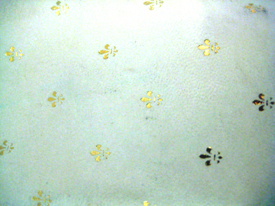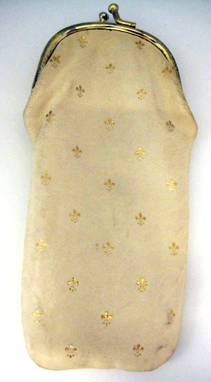 Vit läderpåse, dekorerad med spridda liljor i guldtryck. Mässingsbyglar med knäppen.Fodrad med ljusbrunt kläde.