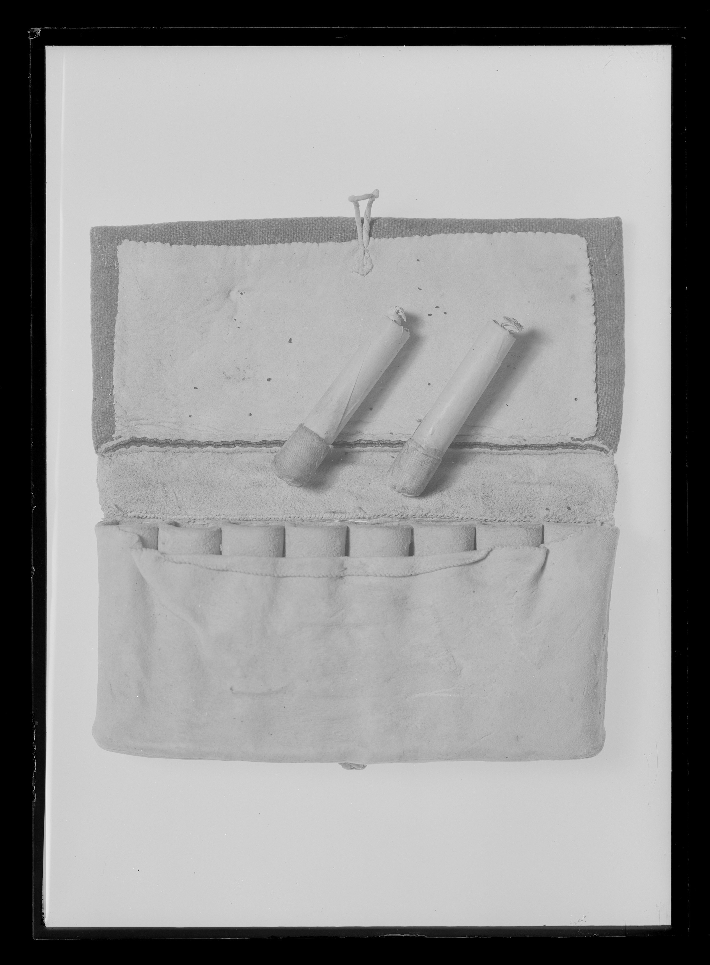 Rektangulär och rak patronväska, taska eller patronkök av vitt sämskskinn med patronbehållare av veckat ljust läder, sammanlagt åtta behållare. I en av behållarna en patron av papper. Lock av styvare skinn som klätts med blågrönt kläde. I nederkant finns en tvinnad rem som bildar en ögla att fästa i en knapp av flätat skinn som finns på vänskans undersida. På baksidan en påsydd ficka av tunnt sämskskinn samt mot sidorna raka och avlånga hylsor också av sämskskinn att fästa i exempelvis ett bälte.