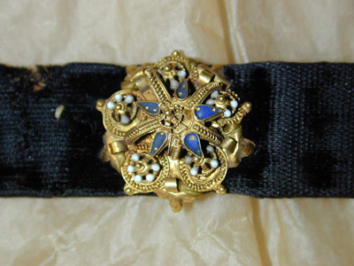 Hattband av svart sammet, dubbelvikt. Söm på baksidan. En skarv. På bandet är 12 guldknappar fastsydda med 2-3 cm mellanrum. Knapparna är genombrutna, sirade, förhöjda i mitten och med emaljdekor. På baksidan stämplade IM = Jakob Mores d. ä, guldsmed i Hamburg, död ca 1612. Se nr 2376 sid 132 i Marc Rosenberg, Der Goldschmiede Merkzeichen, 1923, del II. Tre partofsar av guld och silvertråd fastsydda med drygt 200 mm mellanrum.