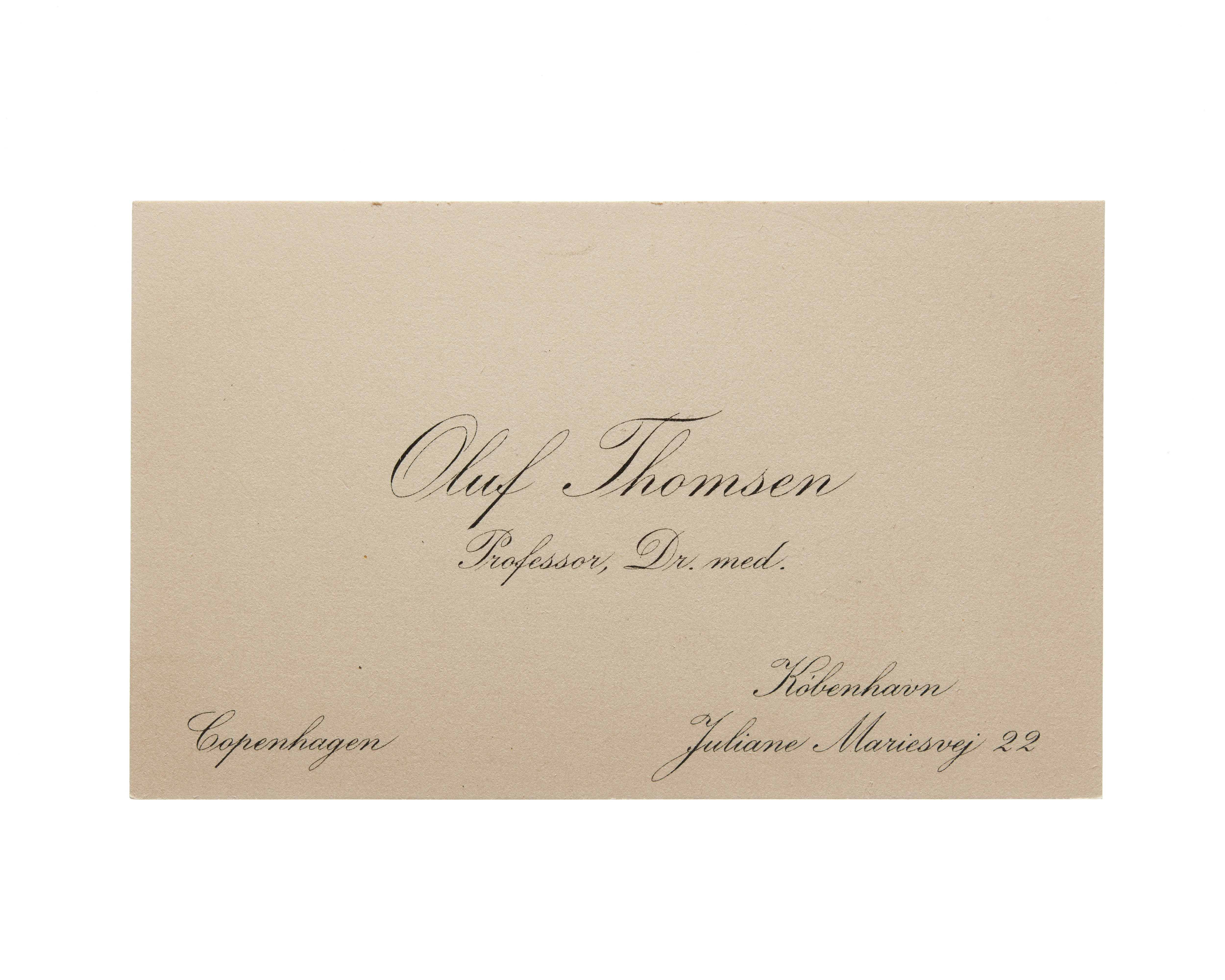 Ett visitkort från Professor, Dr. med. Oluf Thomsen, daterat 1930. Adress (nedre vänstra hörnet) Copenhagen, (nedre högra hörnet) Kobenhaven, Juliane Mariesvej 22.