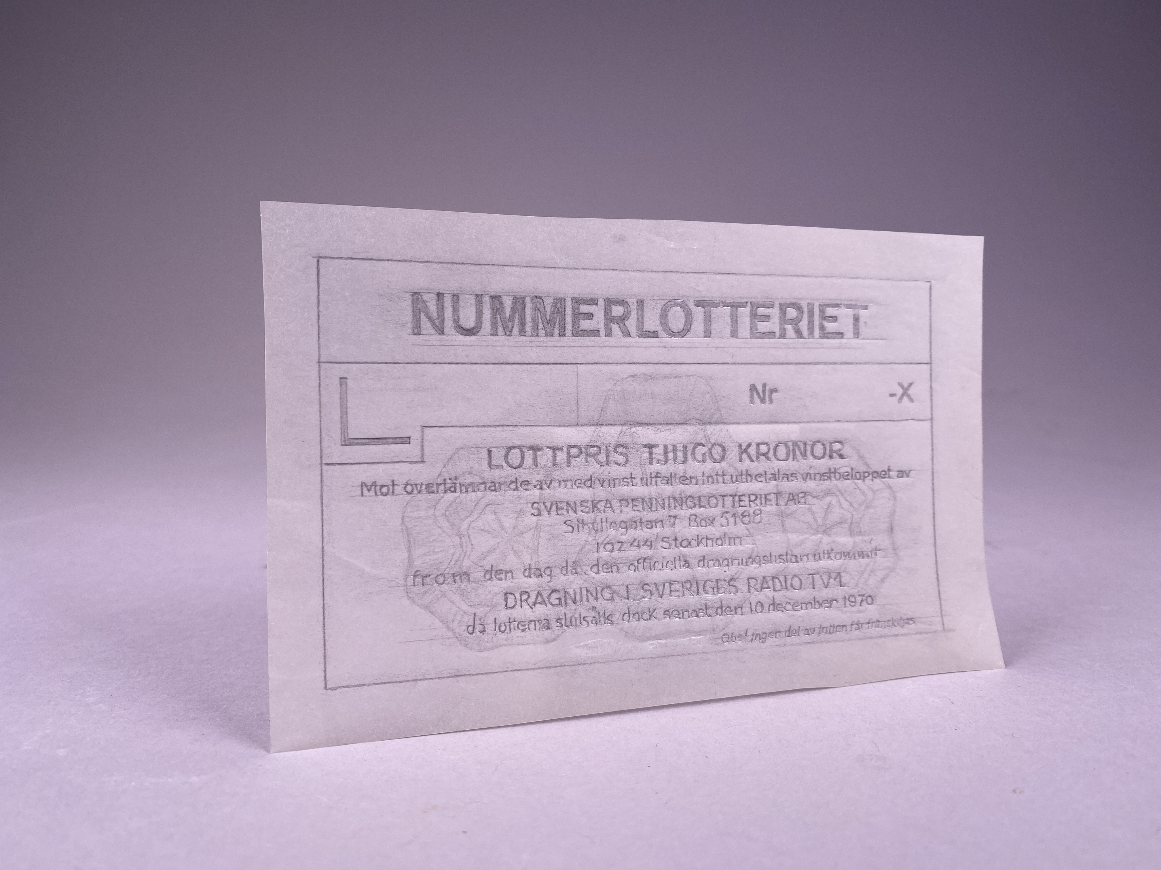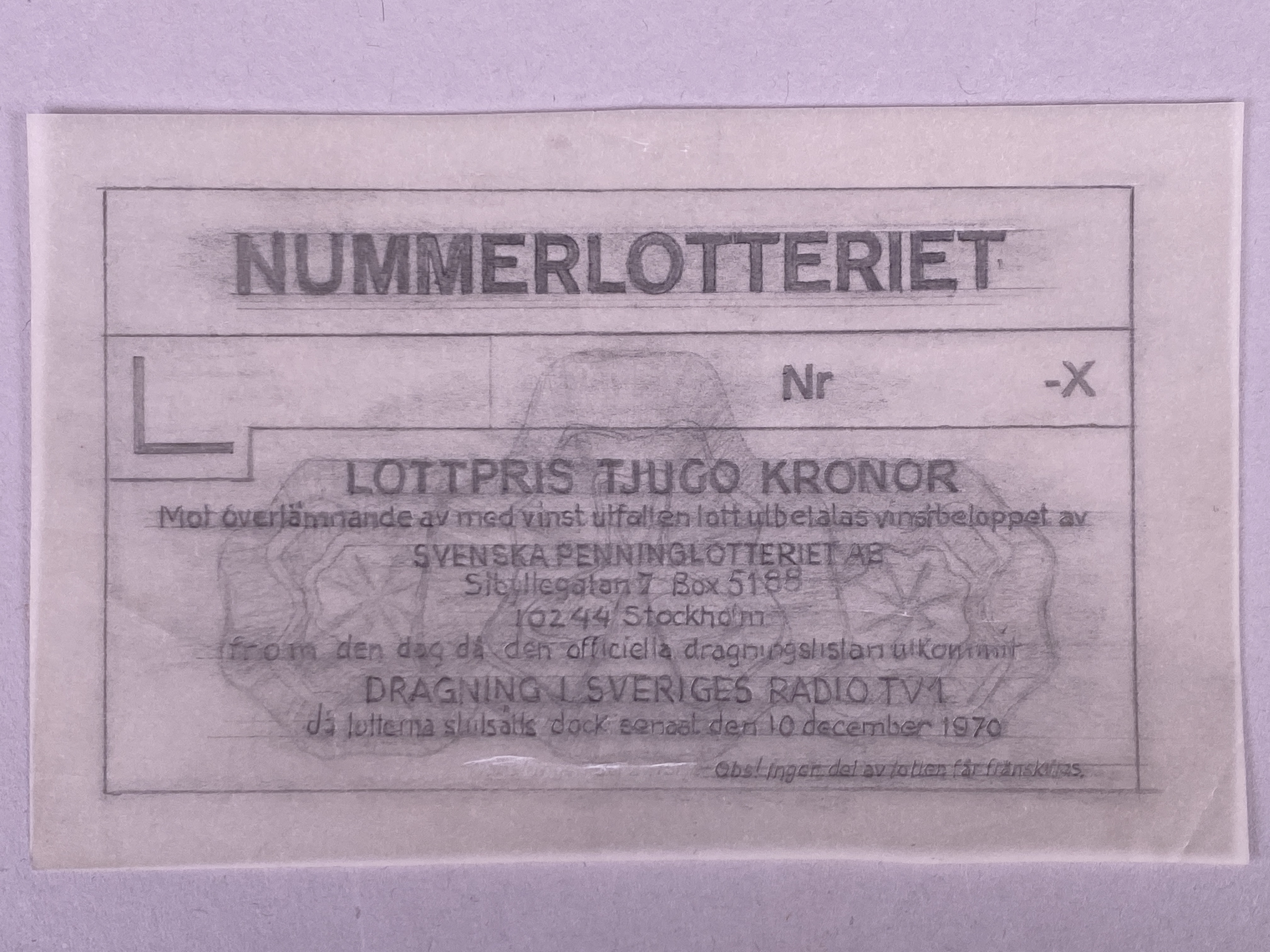 Tryck på vaxpapper ifyllt med grafitpenna. Designförslag på lott med dragningsdatum (senast) den 10 december 1970.
