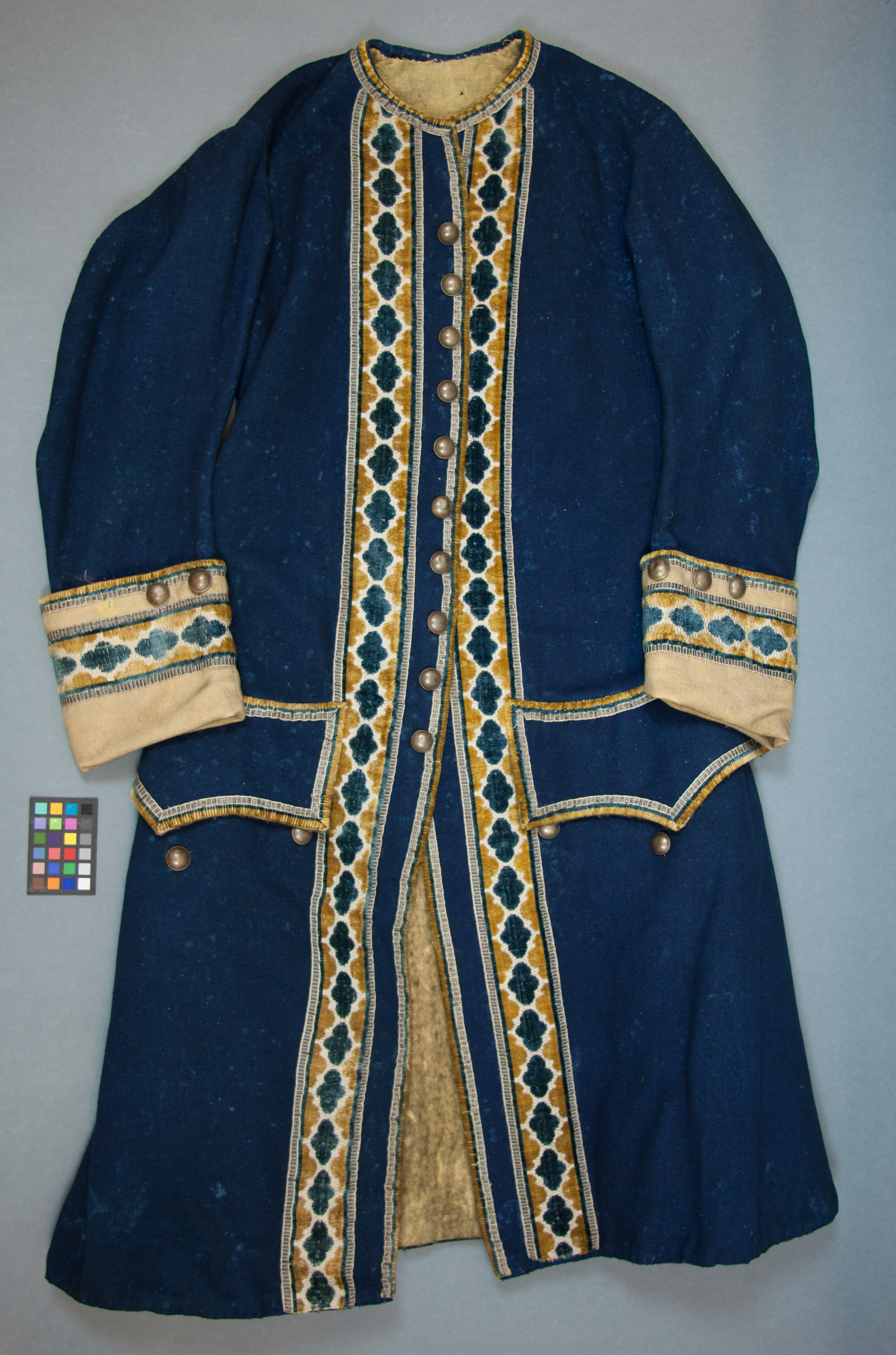 Hela framstycken samt ett skuret ryggstycke. Invändigt är avskuren i midjan från vilken två stycken skört utgår. Rocken är sydd i mörkblått kläde och fodrad med gul boij? utom ärmarna som är fodrade med gult linne. Rundskuren halslinning, runt om kantade med ett smalt vävt band i färgerna gult, blått och silver. Samma smla band förtsätter längs med framslån och utgör kantning på ärmuppvik och ficklock. 40 mm in på båda sidor av den främre kantslån sitter ett bredare mönstervävt band i samma färger som det smala, detta band är 65 mm brett. Påsydda ficklock med fickpåse i gult linne. Under ficklocken sitter tre stycken släta, runda och bukiga knappar i mässing (diameter 18 mm), på den vänstra saknad dock den yttersta. Långa ärmar som består av två delar. Uppvik på manchetten, uppviket är sytt i gult kläde och dekorerat med samma band som rocken i övirgt. Allra högst upp på uppviket sitter det tre stycken knappar (se ovan). På ryggen i midjan sitter det två stycken knappar i anslutning till skörten, de inre skört kanterna kantas av samma breda vävda band som på framsidan i färgerna gult, blått och silver. Dessa banad bildar en uppåt-/nedåtsträvande vinkel i mitten på ryggen och följer sedan de båda inre kanterna på skörten nedåt. Skörten är mycket vid och har därför sammanfogats med hjälp av en knapp på vardera sida (se ovan).