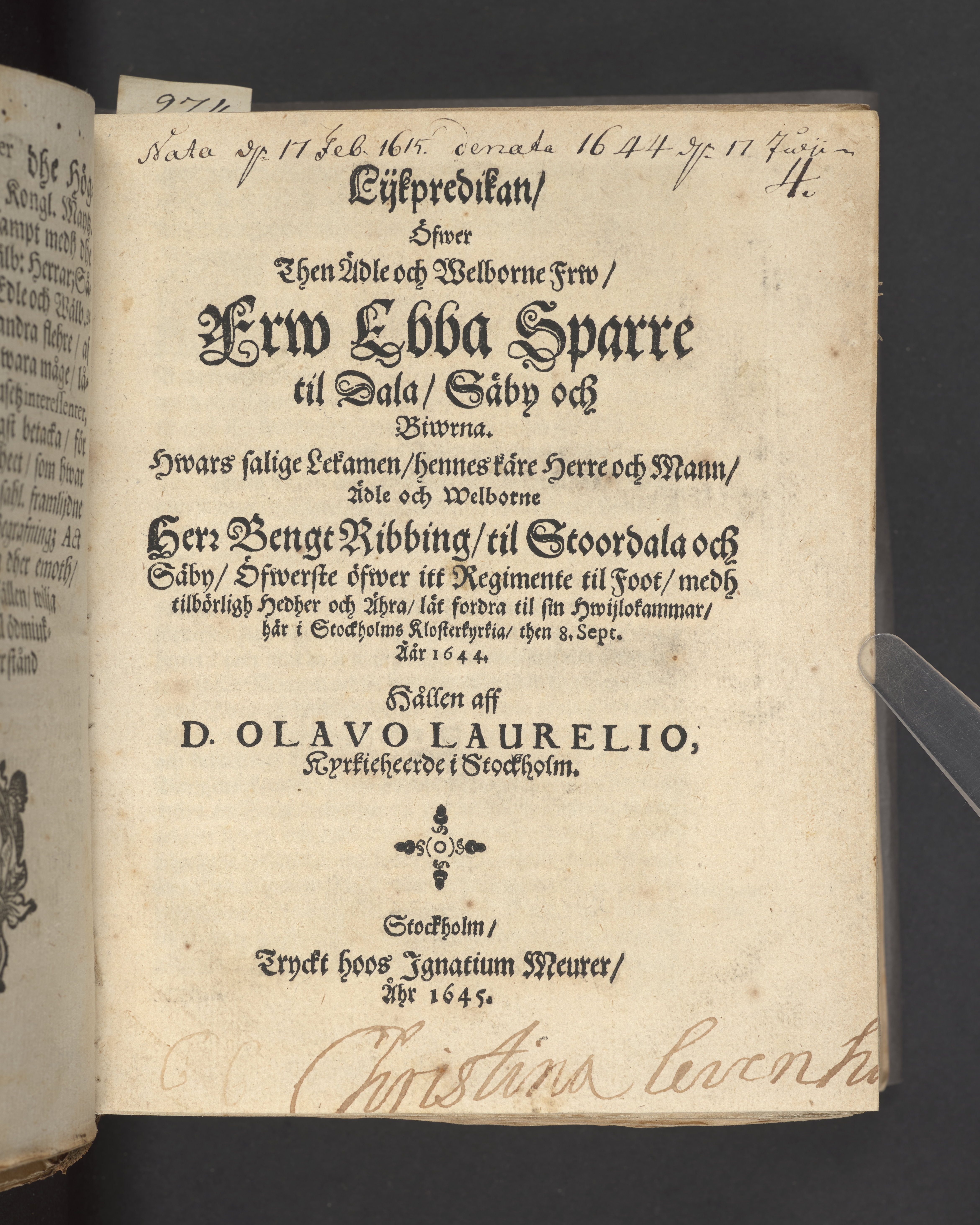 Lijkpredikan, öfwer then ädle ooch welborne frw Ebba Sparre til Dala, Säby och Biwrna. Hwars salige lekamen, hennes käre herre och mann herr Bengt Ribbing, til Stoordala och Säby, öfwerste öfwer itt regimente til foot, medh tilbörligh hedher och ähra, låt fordra til sin hwijlokammar, här i Stockholms klosterkyrkia, then 8. sept. åår 1644. Hållen aff d. Olavo Laurelio, kyrkioheerde i Stockholm. Stockholm, tryckt hoos Ignatium Meurer, åhr 1645.