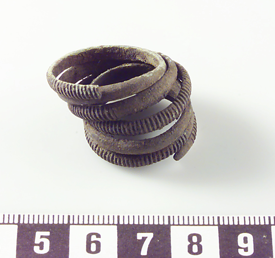 Spiral i sex varv. Varannan spiral med strierad dekor. Ena änden avbruten. Deformerad.