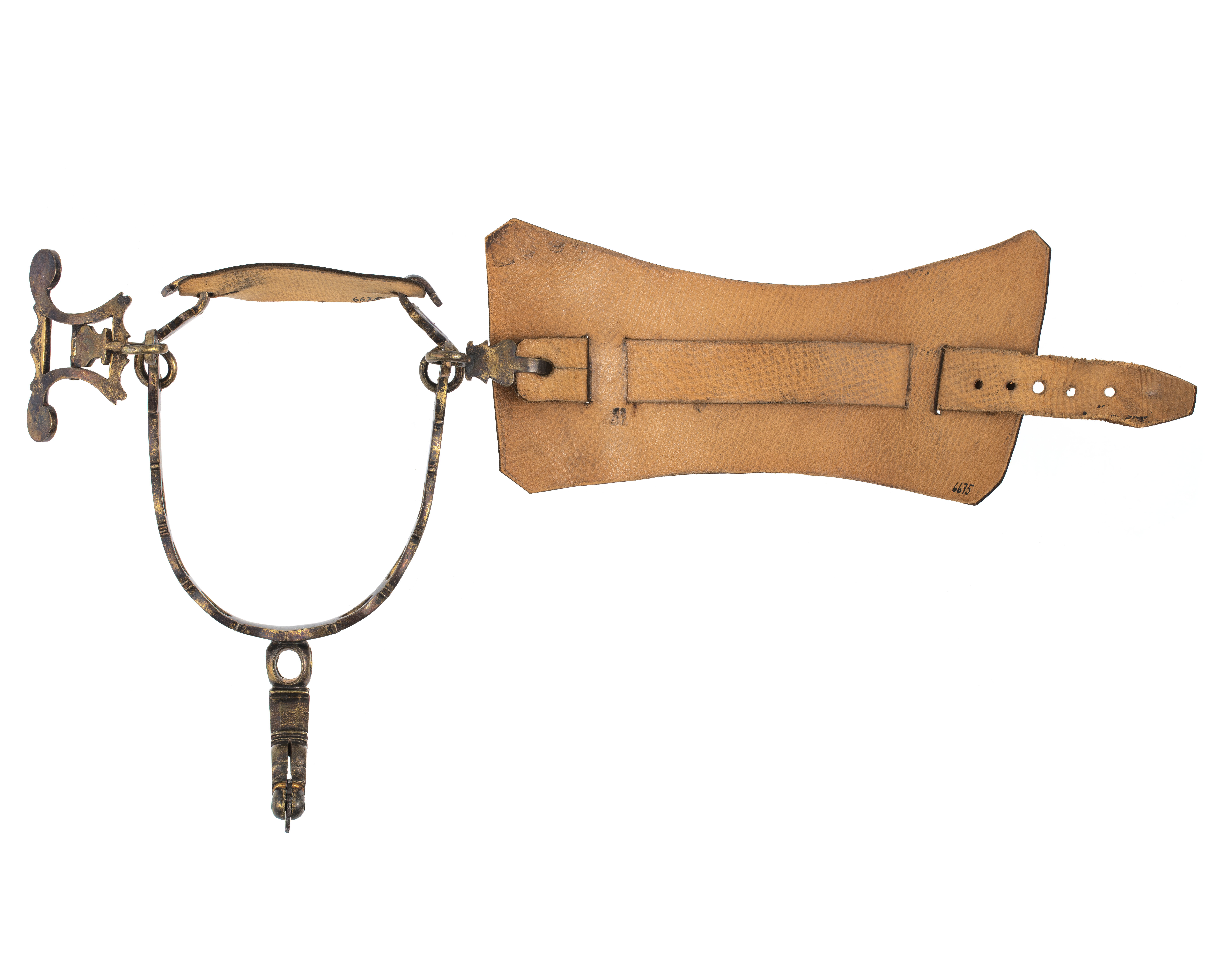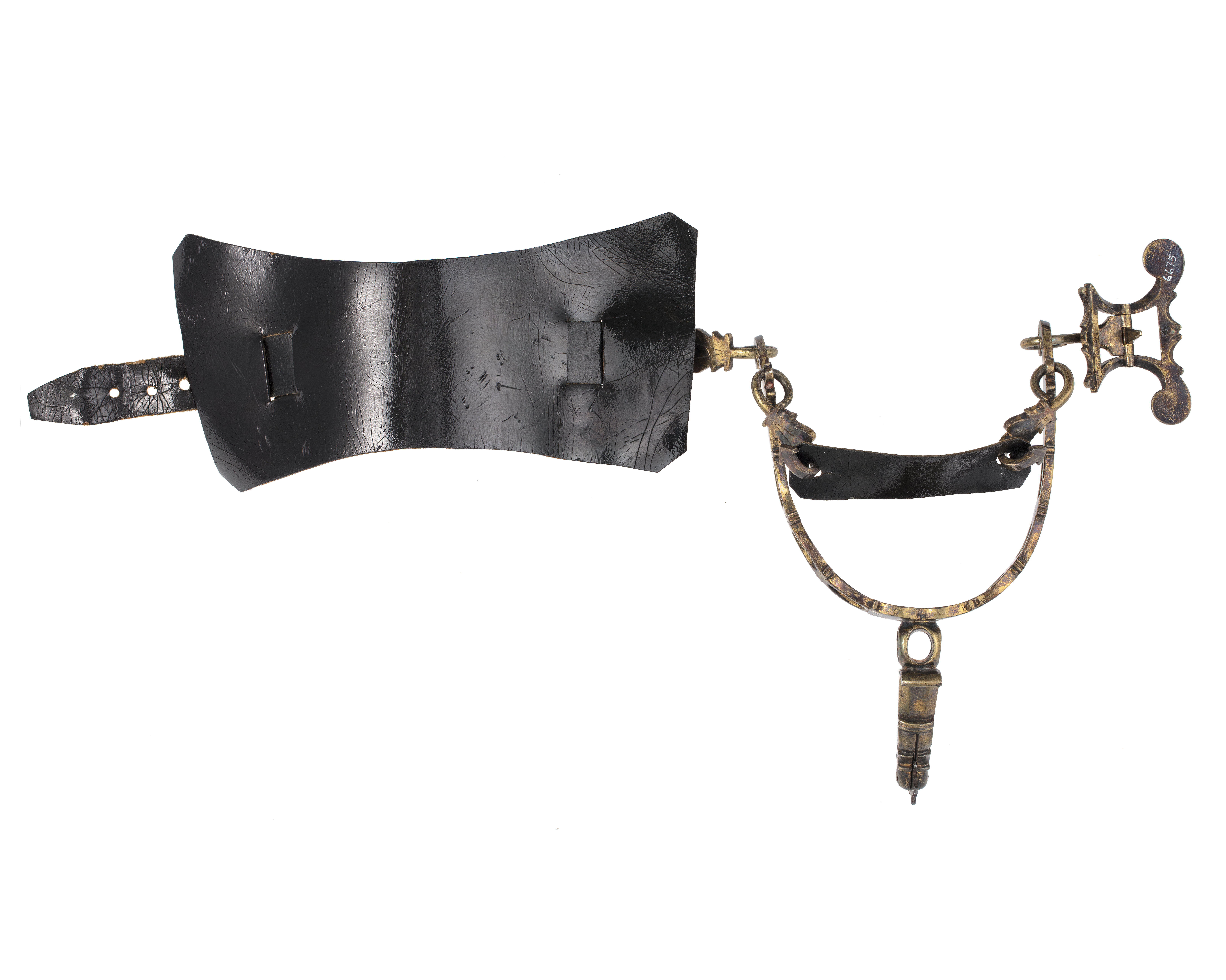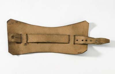 Sporrläder av svart blankt skinn. Baksidan av ofärgat, ljusbrunt skinn. Sporrlädret är rektangulärt, smalast på mitten och utvidgat i sidorna, det har formen av en rosett (timglas). En rak läderrem med 5 runda hål i ena änden och ett "knapphål" i den andra änden är fäst i sporrlädret Den träs genom två hällor som bildas genom att lädret är slitsat på fyra ställen. På baksida finns stämplat ett "M" samt spår av ytterligare stämplade bokstäver eller siffror. På baksidan finns också en märkning, skriven med bläck: 6675.