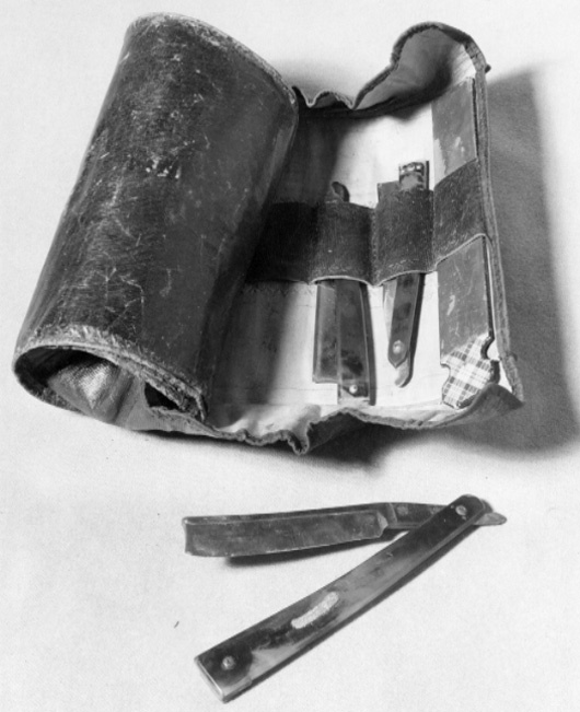Strigel av papp(?), bladet lackerat, gul botten med svarta och röda rutor, klädd med brunt skinn.
