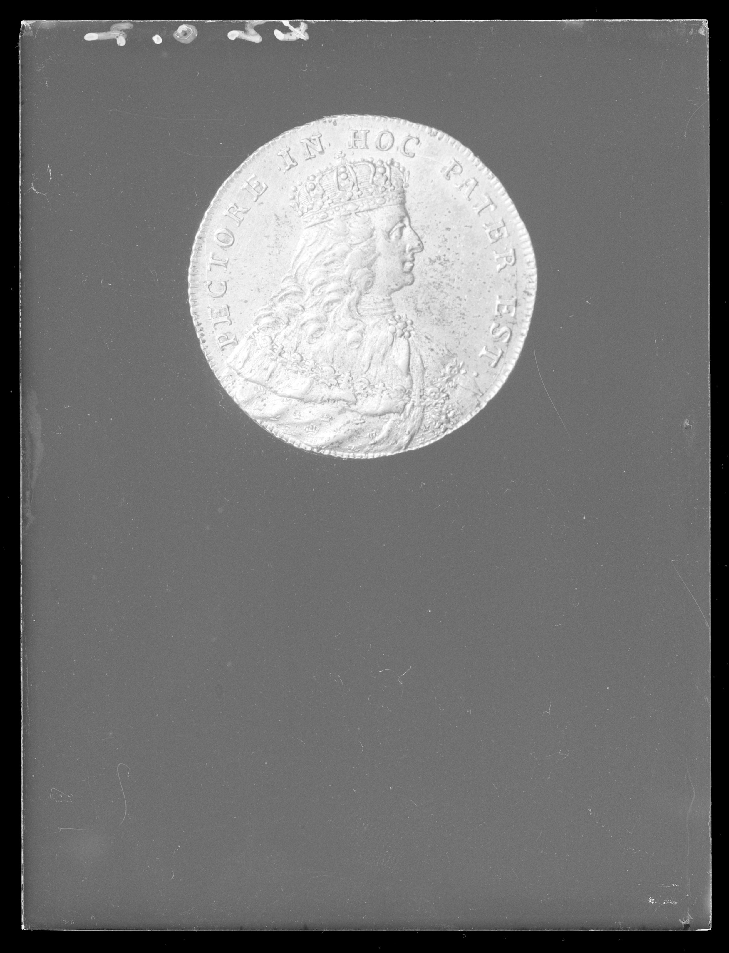 Kastpenning från konung Adolf Fredriks (1710-05-14 - 1771-02-12) kröning i Stockholms storkyrka 1751-11-26. Oregelbundet runt silvermynt, 7:e storleken. Åtsida: Adolf Fredrik, profil h, långt hår, krona, mantel, serafimerkedja, signatur på mantelkanten: "F", text: "PECTORE IN HOC PATER EST". Frånsida, text: "ADOLPH.FRID. // SVEC.GOTH.VAND. // REX // CORONAT.HOLMIAE // D.26.NOVEMBER. // 1751.". Räfflade kanter, snedräfflad rand.