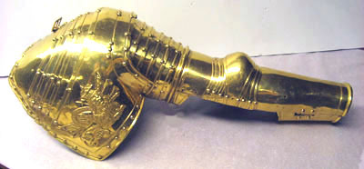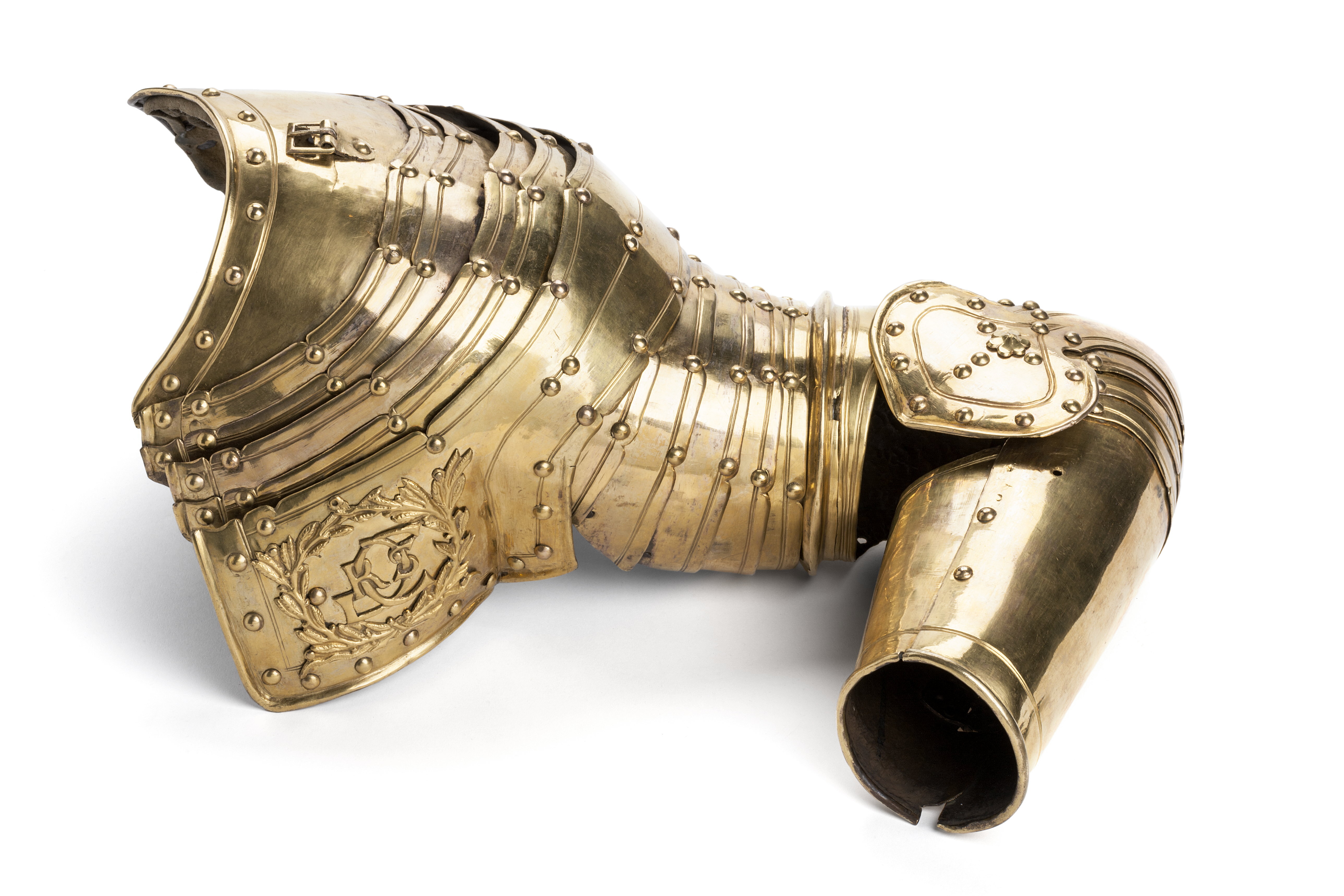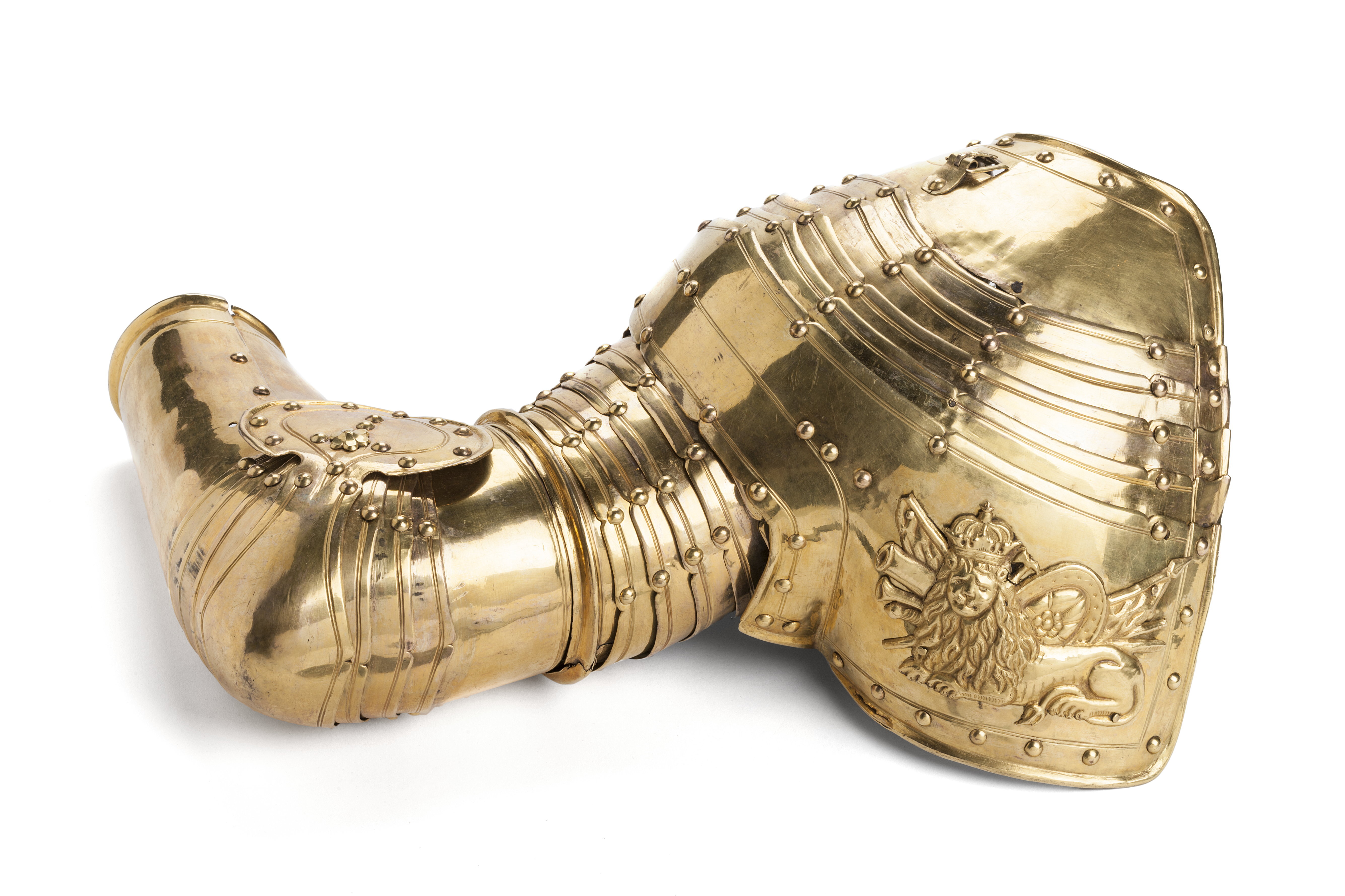 Riksrådet Johan Gyllenstjernas rustning af förgylld messing med knappformiga nithufvuden består af:
