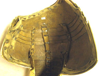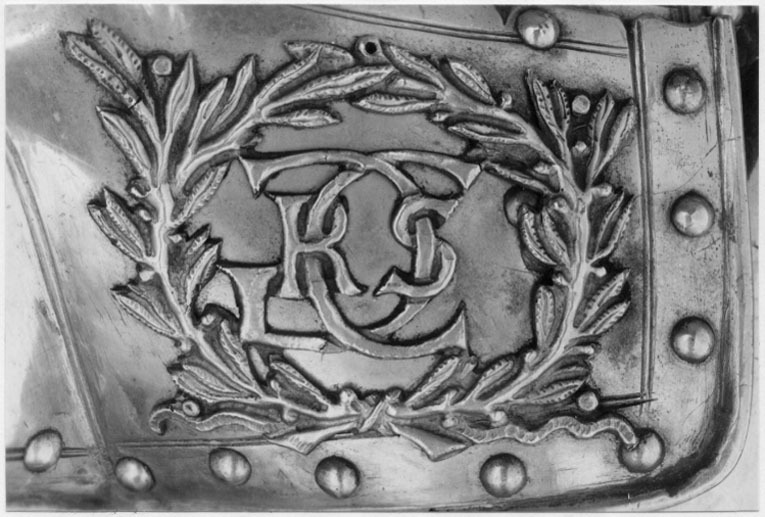 ryggharnesk, hvarå finnes fastnitade en genombruten plåt med bokstäfverna C.G.R.S, omgifvna af en lagerkrans och palmqvistar - axelsleifer af skinn, öfverklädda med guldtyg, hvarå 8 st. messingsskållor äro fastnitade,
