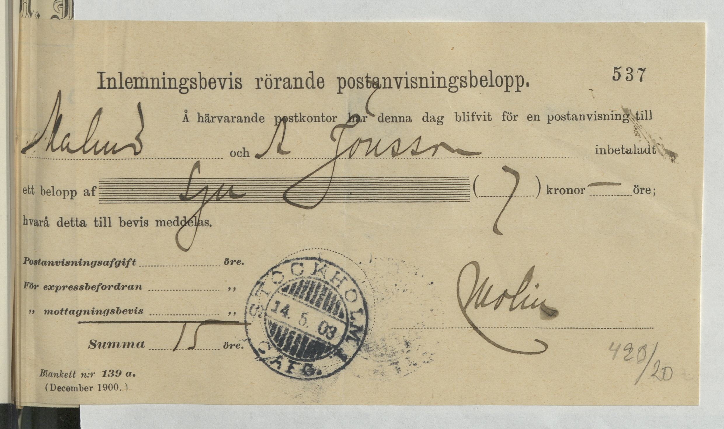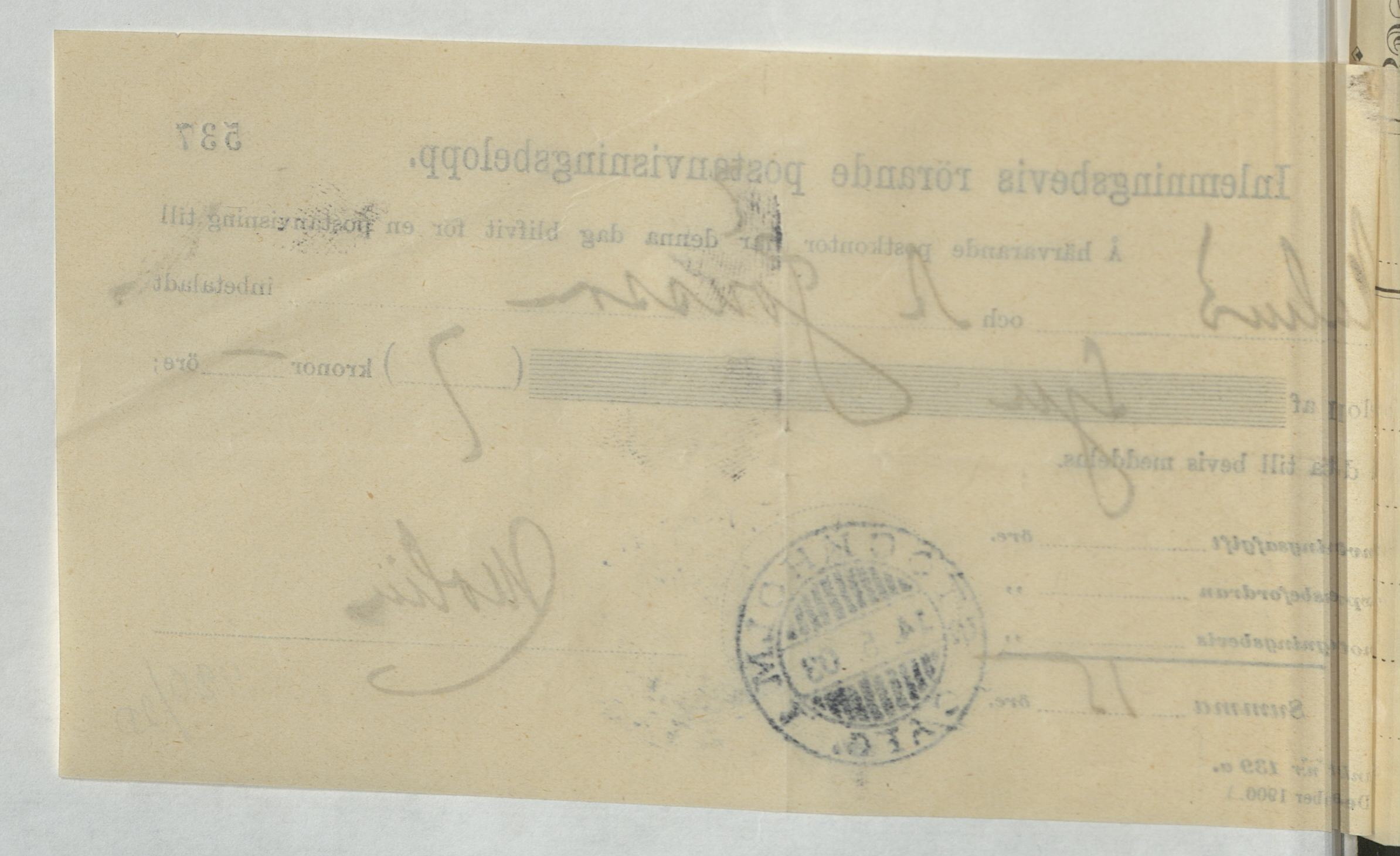 Inlämningsbevis rörande postanvisningsbelopp till N. Jönssons Skoetablissement
