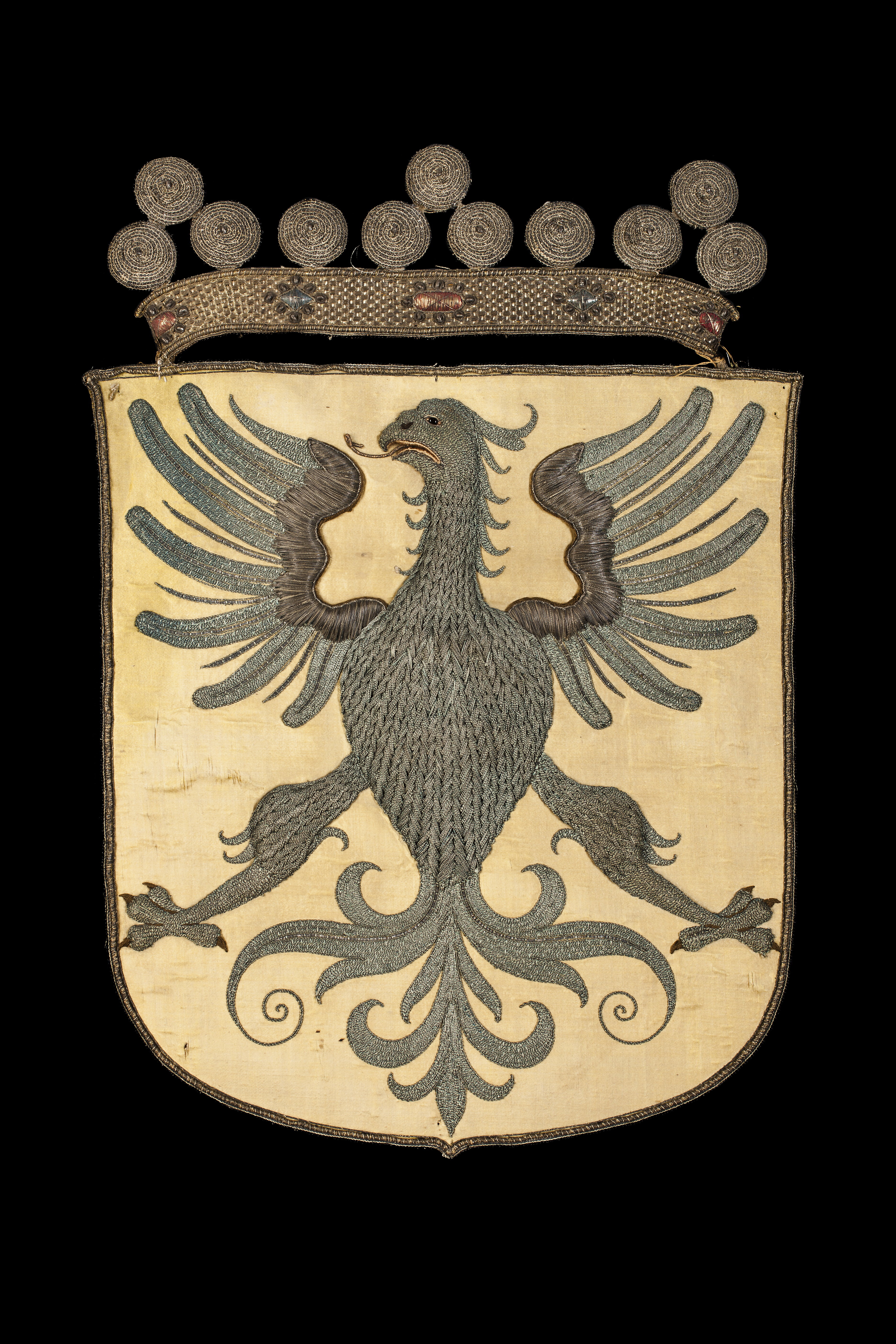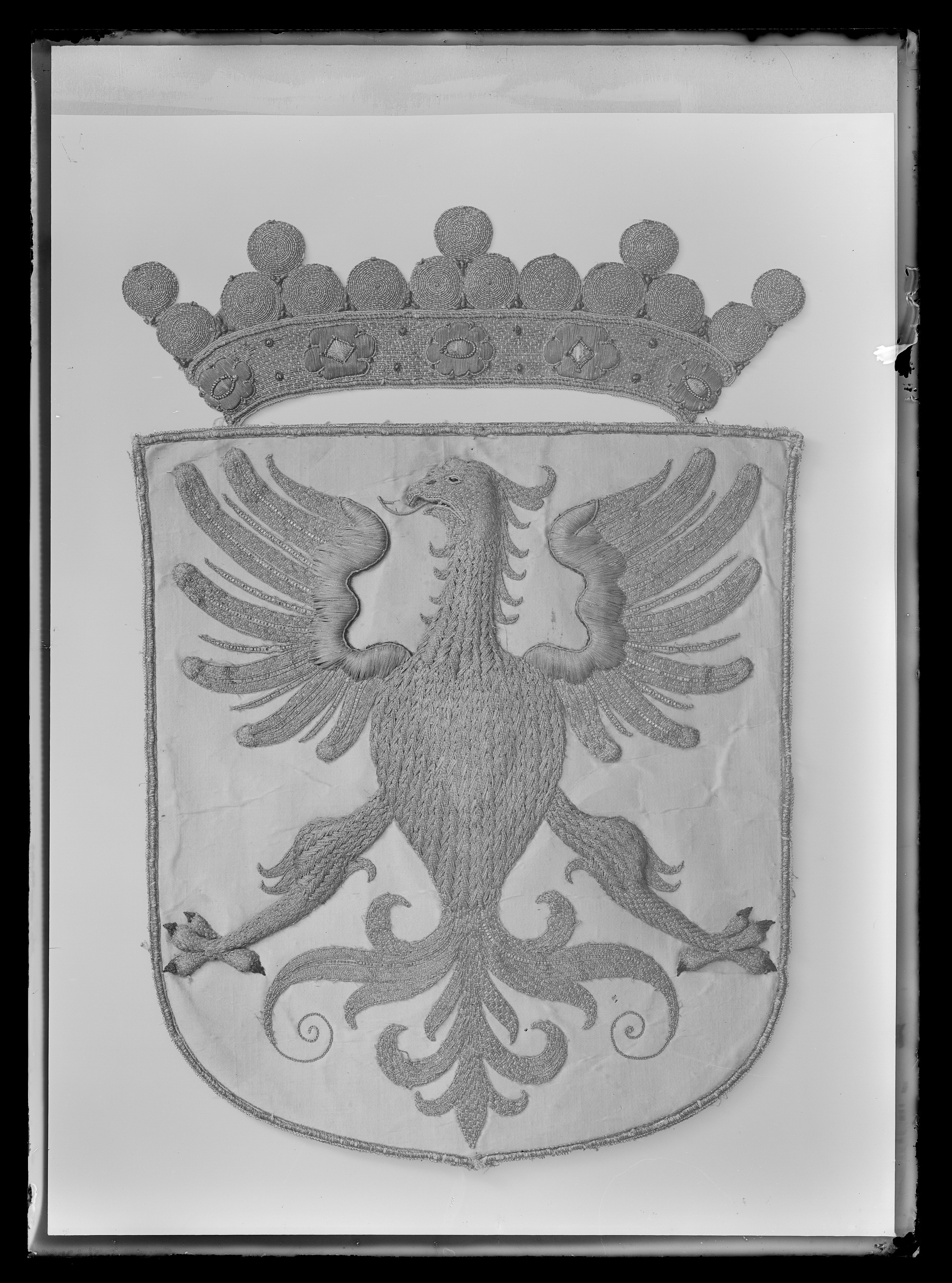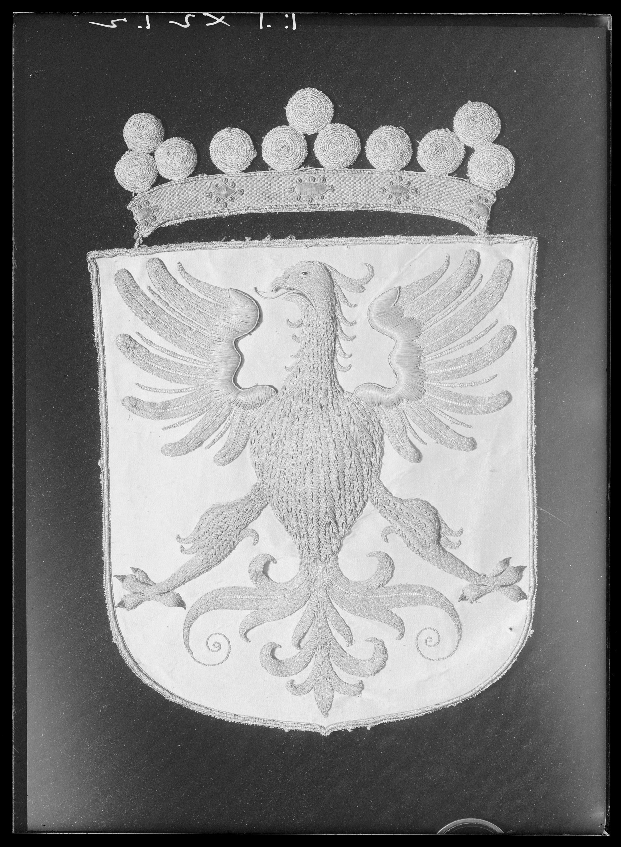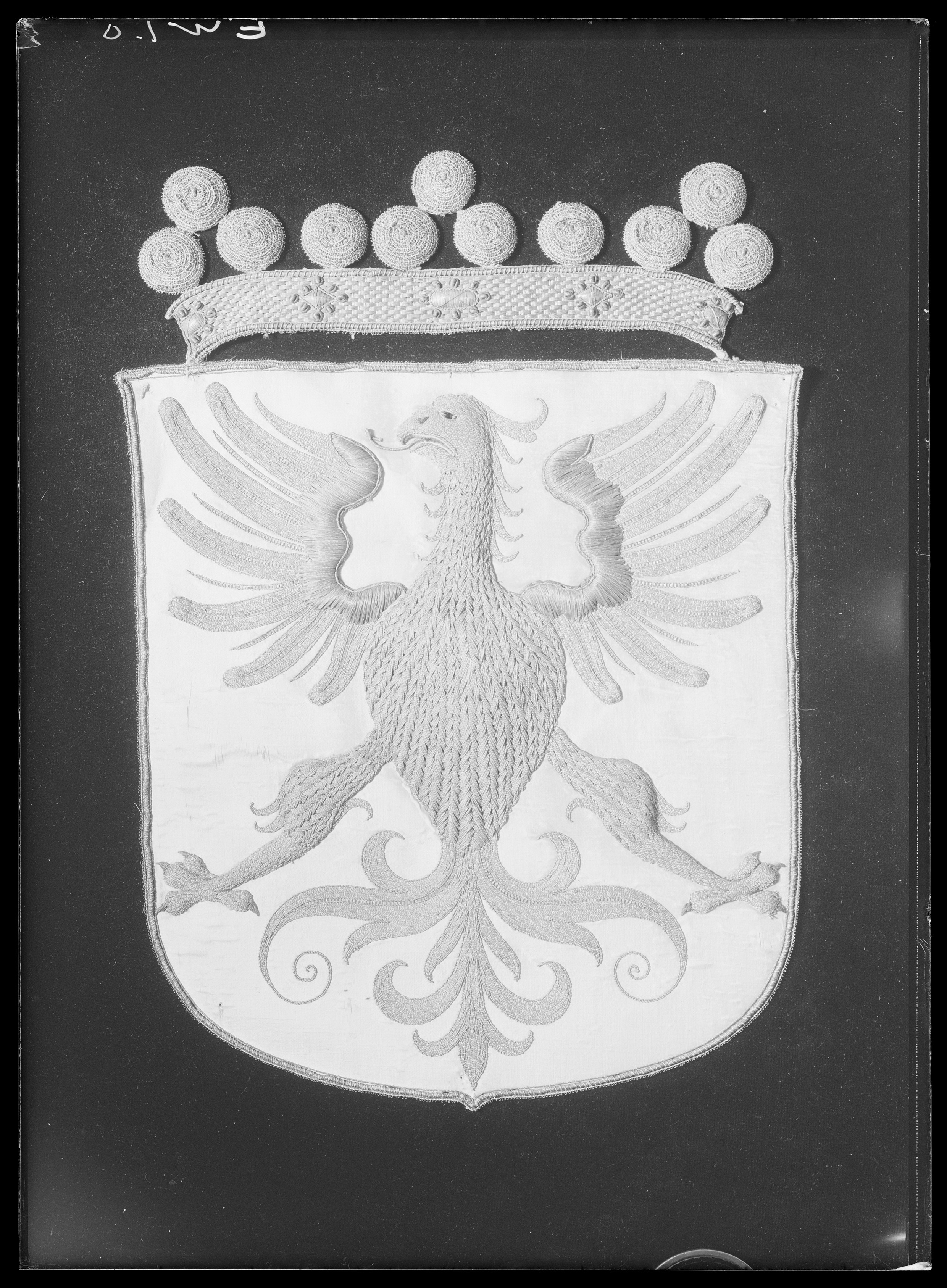 Begravningsbanér av gul atlas kantad av guldtråd med en upphöjd guldkant av tvinnad guldtråd. På banéret ett vapen, en örn med utspärrade vingar. Örnen är broderad i upphöjd relief med blå, svart och röd silkestråd, silvertråd och silverlan. Skölden kröns av en friherrelig krona som är 315mm bred och 105mm hög. Kronans ring är av silvertråd i ett vävmönster tillsammans med gul silkestråd. På kronans ring sitter fem ornament som ska föreställa ädelstennar. Dessa är broderade av silverlan som målats blå och röd. Runtom "ädelstenarna" förekommer pärlsticksarbete. Ovanpå ringen är broderat elva pärlor av silvertråd. Banéret är fodrat med naturfärgat linne på vilket papper med tryckt text är fästat. Troligen för att stärka konstruktionen. Papperet har tryckt text på båda sidor och tycks komma från en handbok för kvinnor i hemmet. Till banéret hör även en banderoll med två nedhängande tungor. Banderollen är i dubbla lager av guldfärgad taft och med ett foder av naturfärgat linne och med kanter bestående av tvinnad guld, silver och silkestråd. På banderolen står en identisk text på båda sidor broderad i svart silkestråd: "G:WERMELANDT". "16" "60". (Värmland 1660)