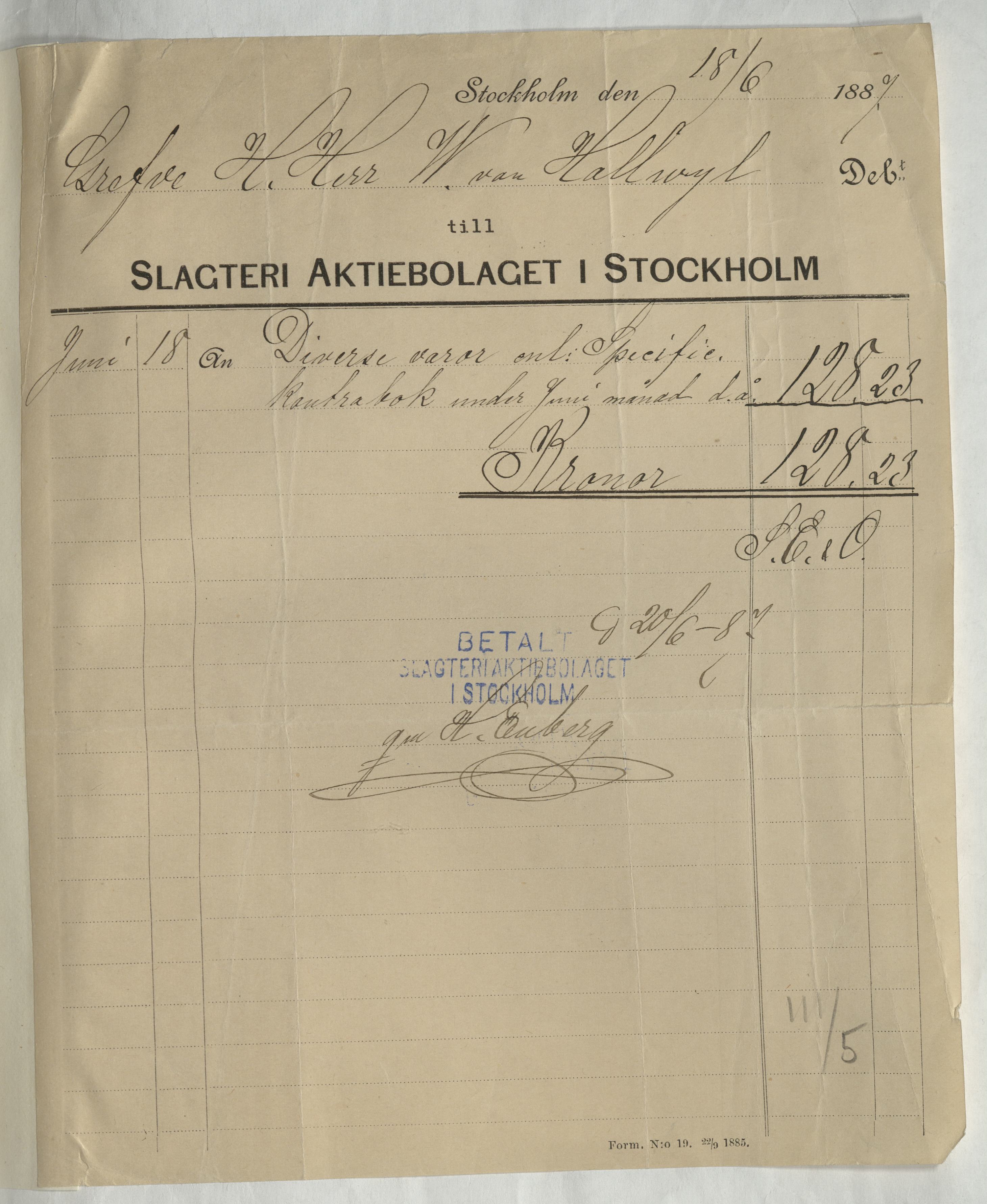 Kvitto från Slagteri Aktiebolaget i Stockholm