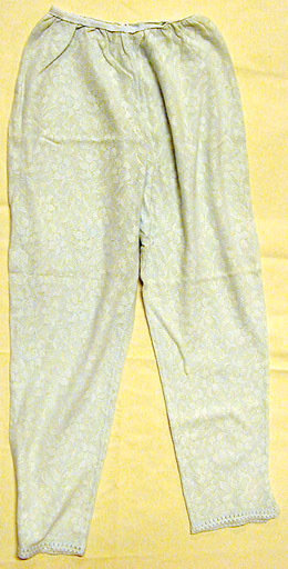 Byxor, blekt turkosgröna av 55% ull och 45% orlon med maskinstickat mönster av blommor påstjälkar med blad. Hellånga ben, sydda i två våder var (mätta vid grenen). Vardera framvåd,b: 340 mm, bakvåd: 320 mm. Benen snäva nedtill med litet sprund, l: 60 mm och genombrutenfransliknande bård. I midjan resår. I grenen infodringar av ljusblå bomullstrikå. Mitt bak i midjan etikett:"Hanro // MADE IN SWITZERLAND // MITIN // 55% WOOL // 45% ORLON // M". Storlek: medium.