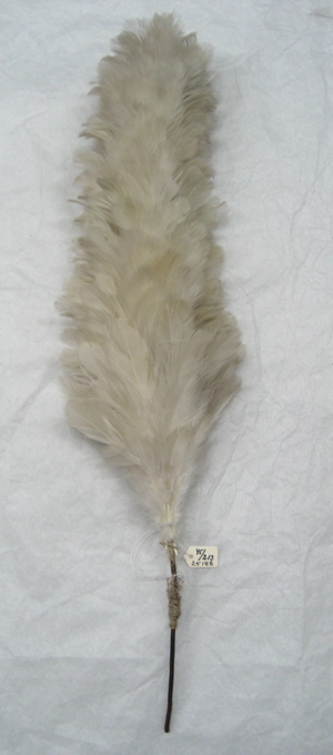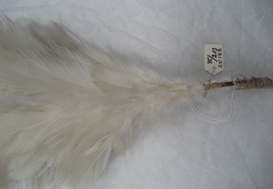 Rak ståndarplym av vita, klippta tuppfjädrar. Fjädrarna är sammanfästade på ett rakt skaft av stål. Vid skarven mellan fjädrar och skaft är virat med gråvit tråd.