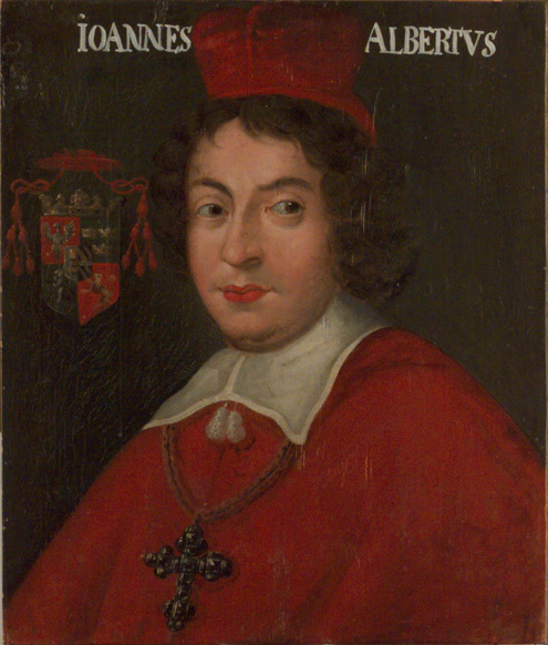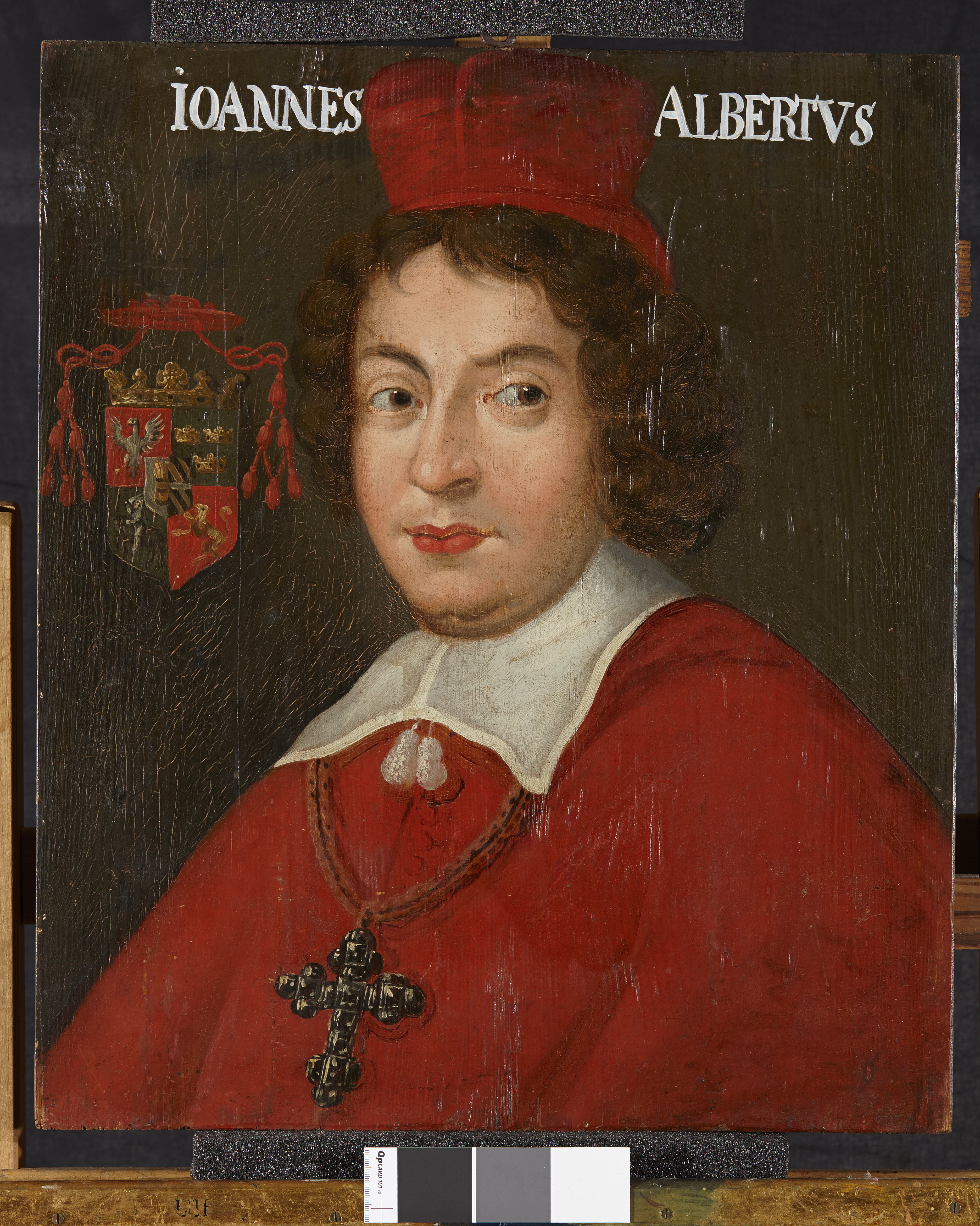 Bröstbild, fas vänster. Halvlångt brunt hår, röd mössa , röd dräkt, vit rabatkrage, kors i guldkedja runt halsen. Mörk bakgrund, till vänster vapensköld under röd kardinalshatt. Fyrdelad sköld, fält 1: en vit örn mot rött, fält 2: tre gyllene kronor mot grönt, fält 3: en silverfärgad ryttare mot grönt, fält 4: en guldfärgad stående grip mot rött. Tudelad hjärtsköld med t.v. en gyllene sädeskärve mot silver, t.h. guldfärgade balkar mot svart bakom silverfärgad bjälke. Inskrift: "IOANNES ALBERTUS". På baksidan otydlig text, möjligen "Johannes IV" samt "no 26" med krita. Pannåns baksida rödbetsad, två tvärgående slanor. Saknar ram.