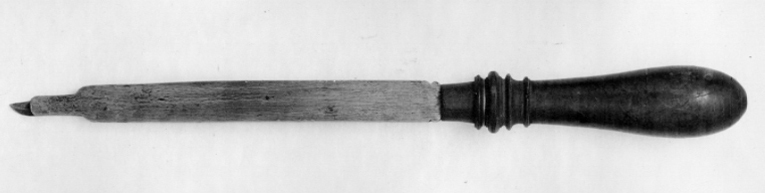 Spetsstål med en åt vänster böjd, fågelnäbbsformig spets. Klinga med rektangulärt tvärsnitt, vid skaftet dekorerad på båda sidorna med ett tvärstreck. Svarvat, profilerat, kägelformigt skaft, dekorerat med en större vulst, omgiven av två mindre, samt en mindre vulst kring skaftets smalaste del. Mått: L 341, skaft L 140, största diam: 34,0.