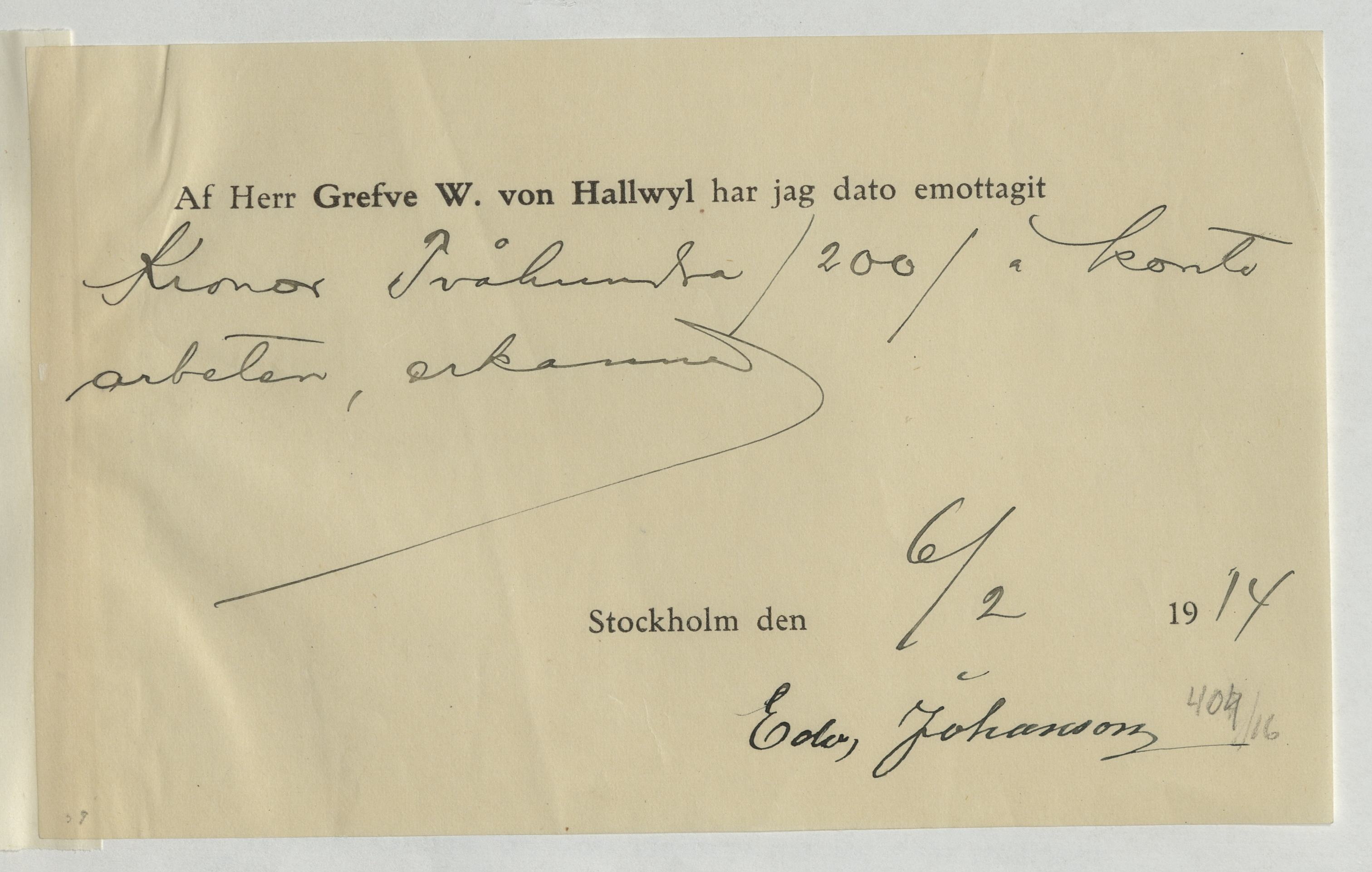 Kvitto från Edv. Johanson, Snickare. Gällande betalning för utfört arbete.