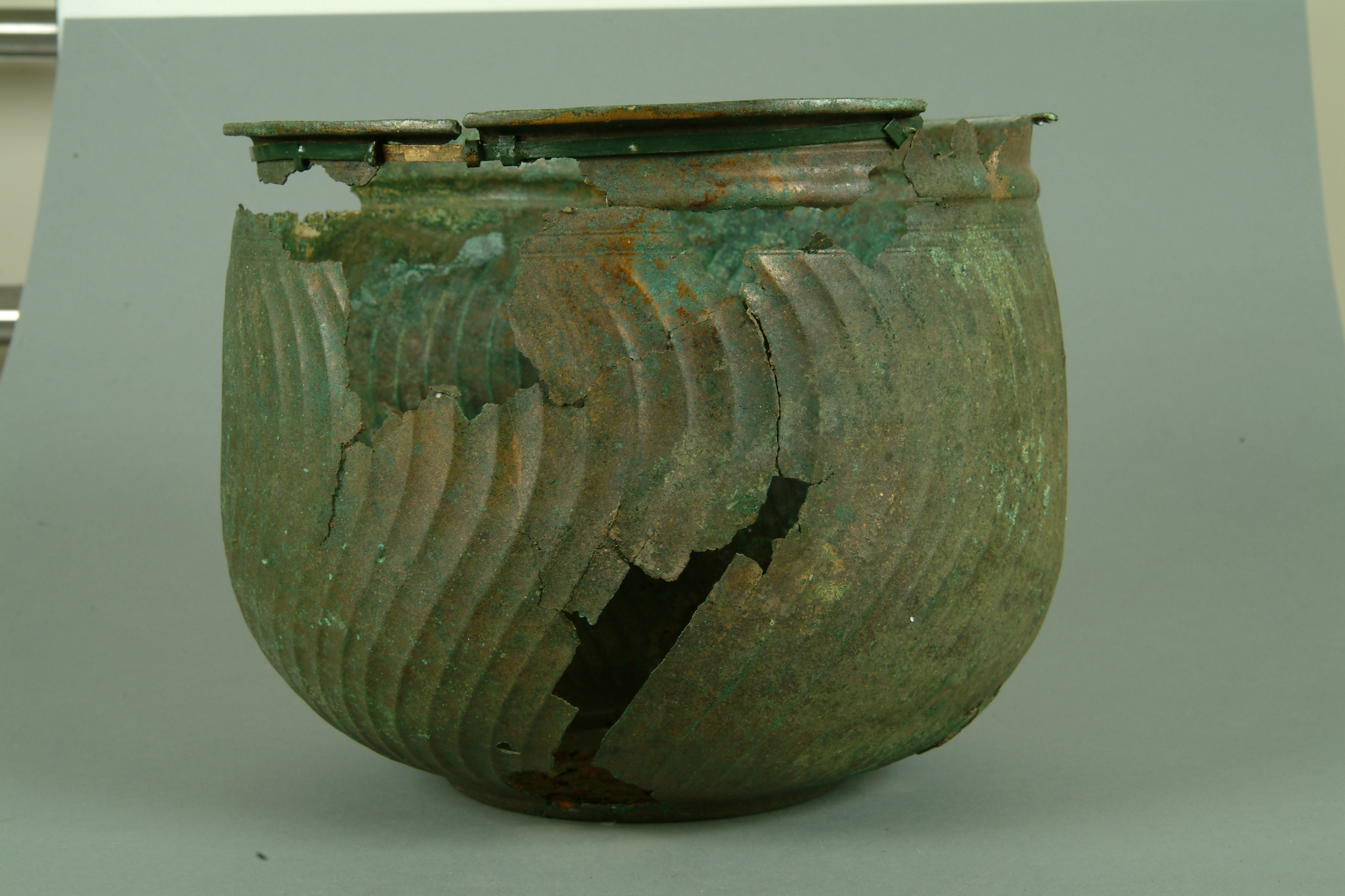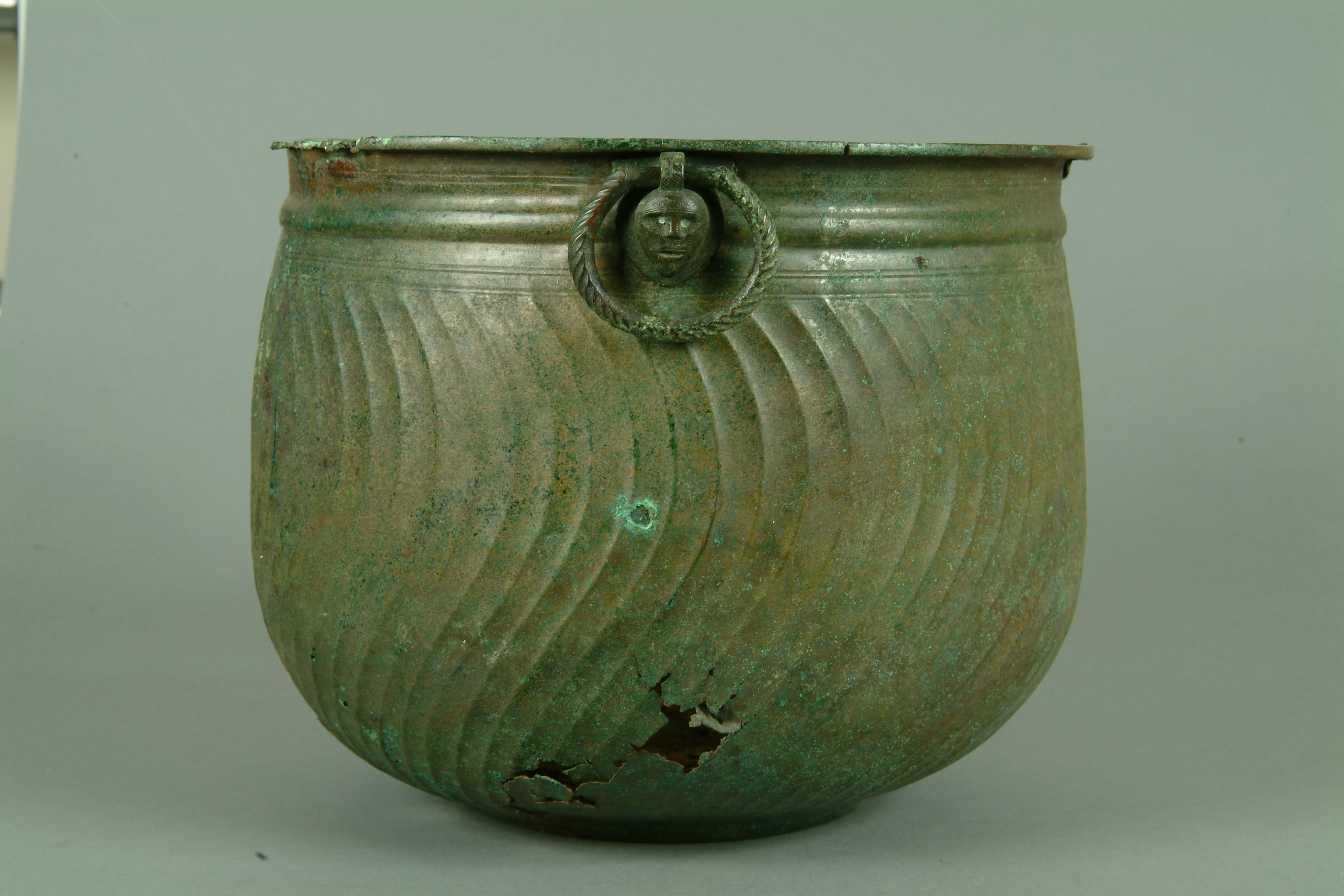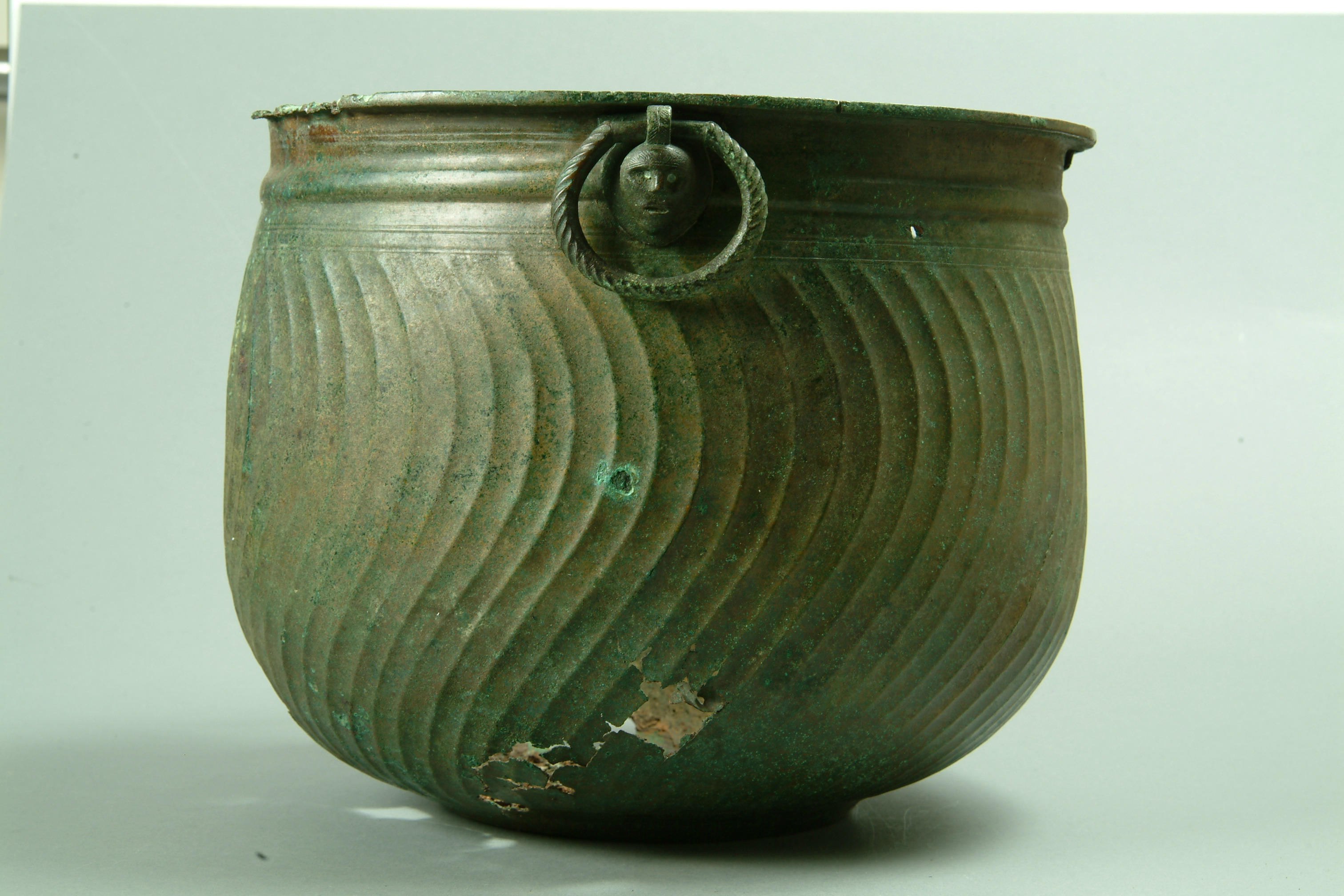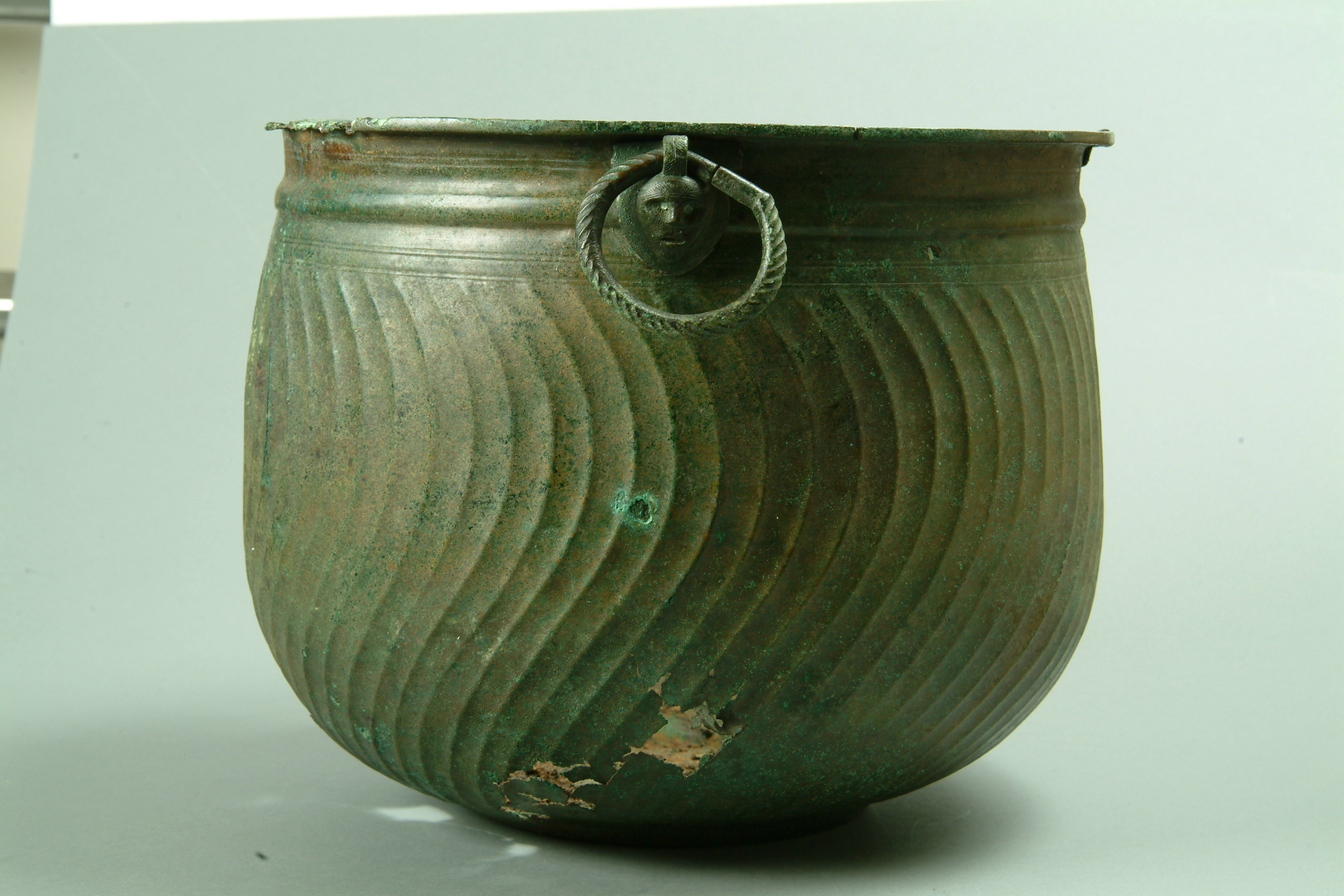 Kannelerat kärl av brons, del av dryckesservis. Buken dekorerad med rundade kannelurer. Under mynningen har det suttit två handtag, varav det ena sitter kvar in situ. Handtagens fästen är i form av ansikten sedda en face med en bärring. Mynningspartiet är dekorerad med vågräta ränder och en vulst. Mynningskanten är utvikt. Kärlet har en liten fot. På undersidan av botten finns dekor av koncentriska cirklar. Eggers typ E46. Dateringen ligger i äldre romersk järnålder: B2.