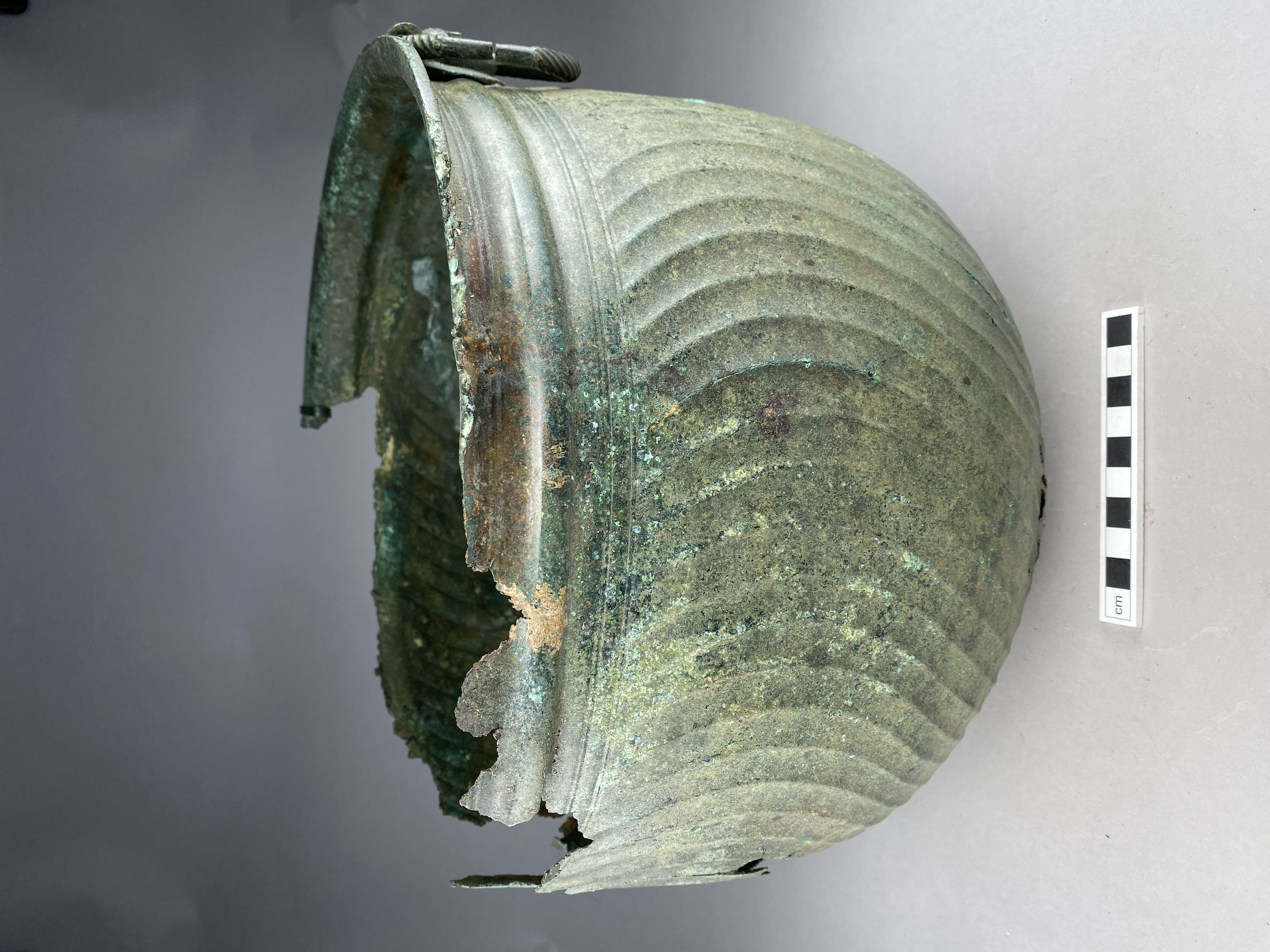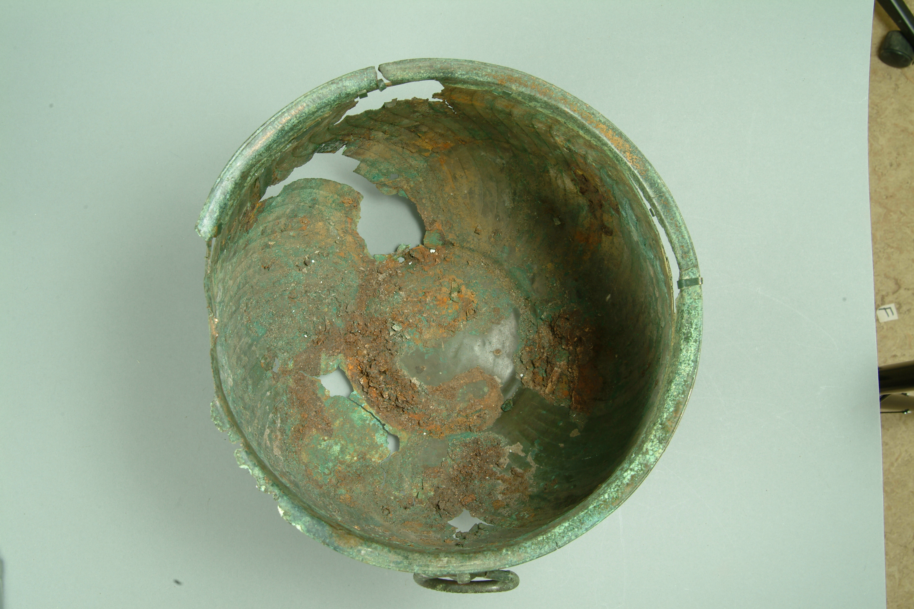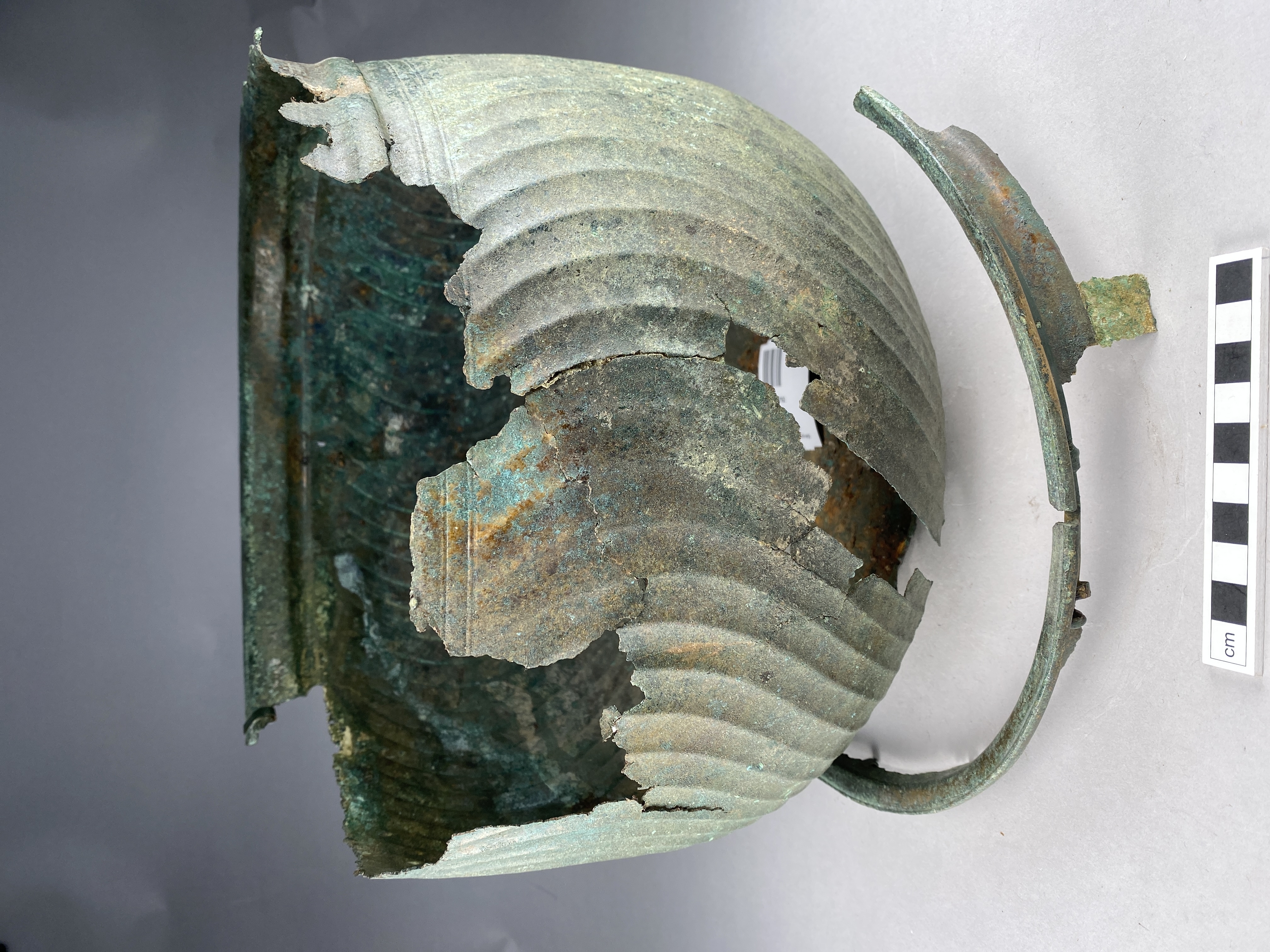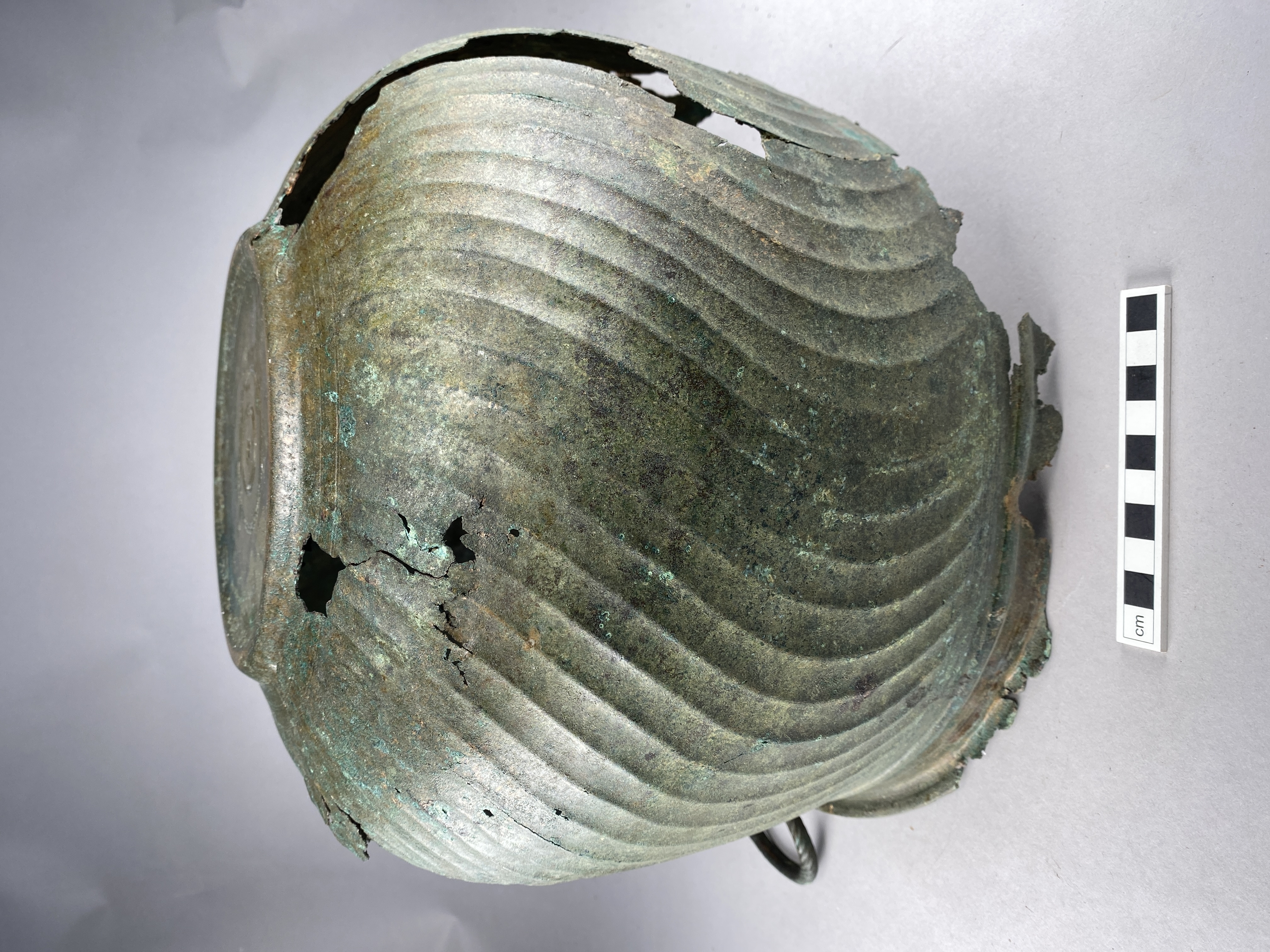 Kannelerat kärl av brons, del av dryckesservis. Buken dekorerad med rundade kannelurer. Under mynningen har det suttit två handtag, varav det ena sitter kvar in situ. Handtagens fästen är i form av ansikten sedda en face med en bärring. Mynningspartiet är dekorerad med vågräta ränder och en vulst. Mynningskanten är utvikt. Kärlet har en liten fot. På undersidan av botten finns dekor av koncentriska cirklar. Eggers typ E46. Dateringen ligger i äldre romersk järnålder: B2.