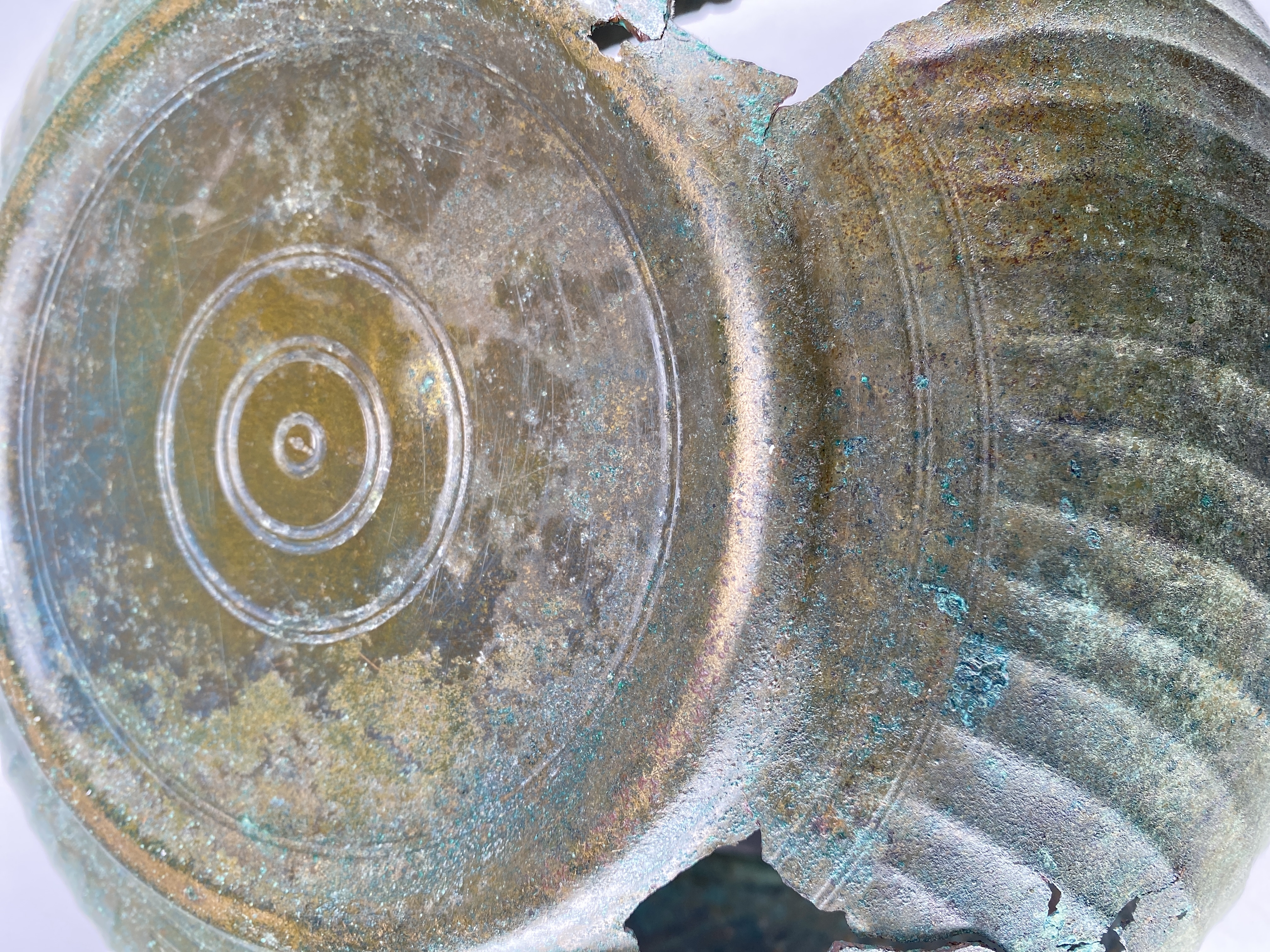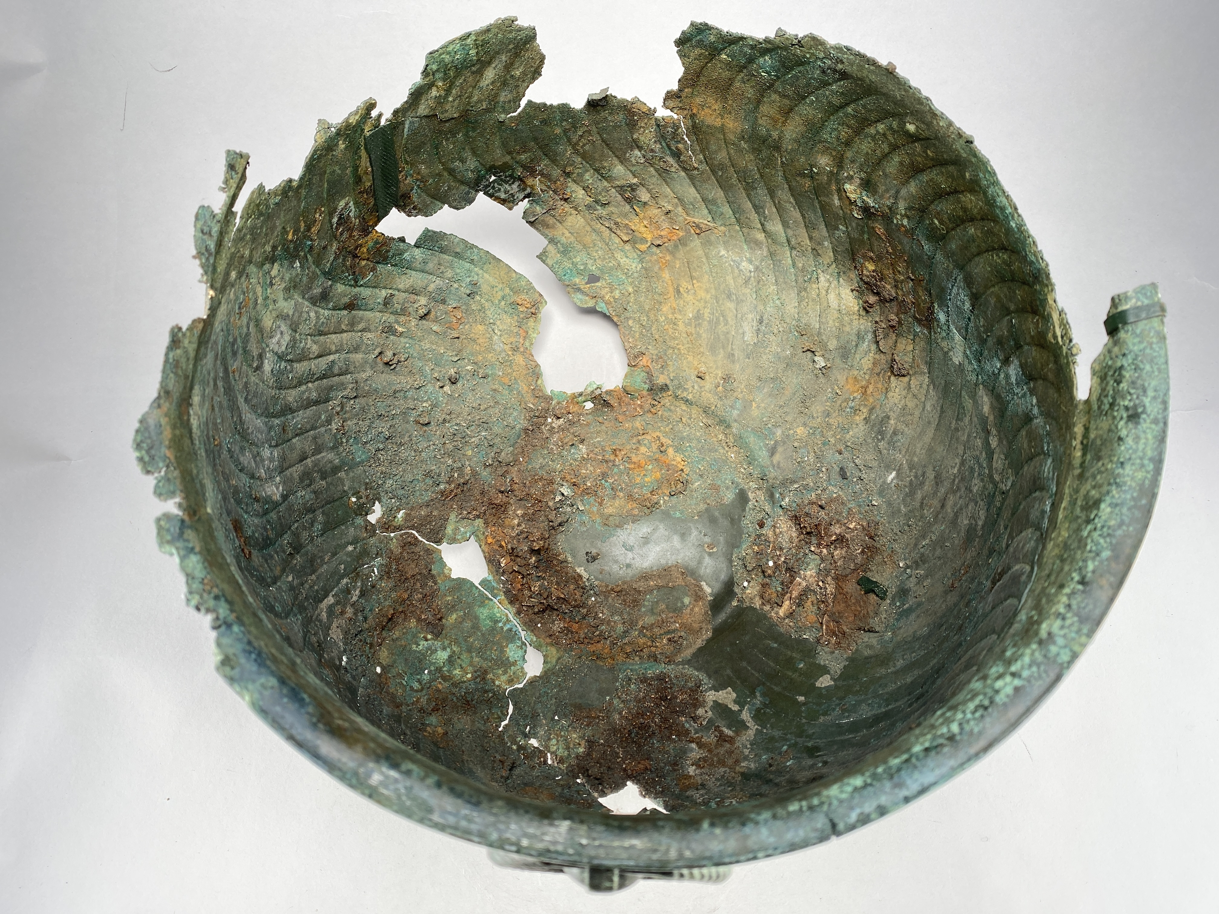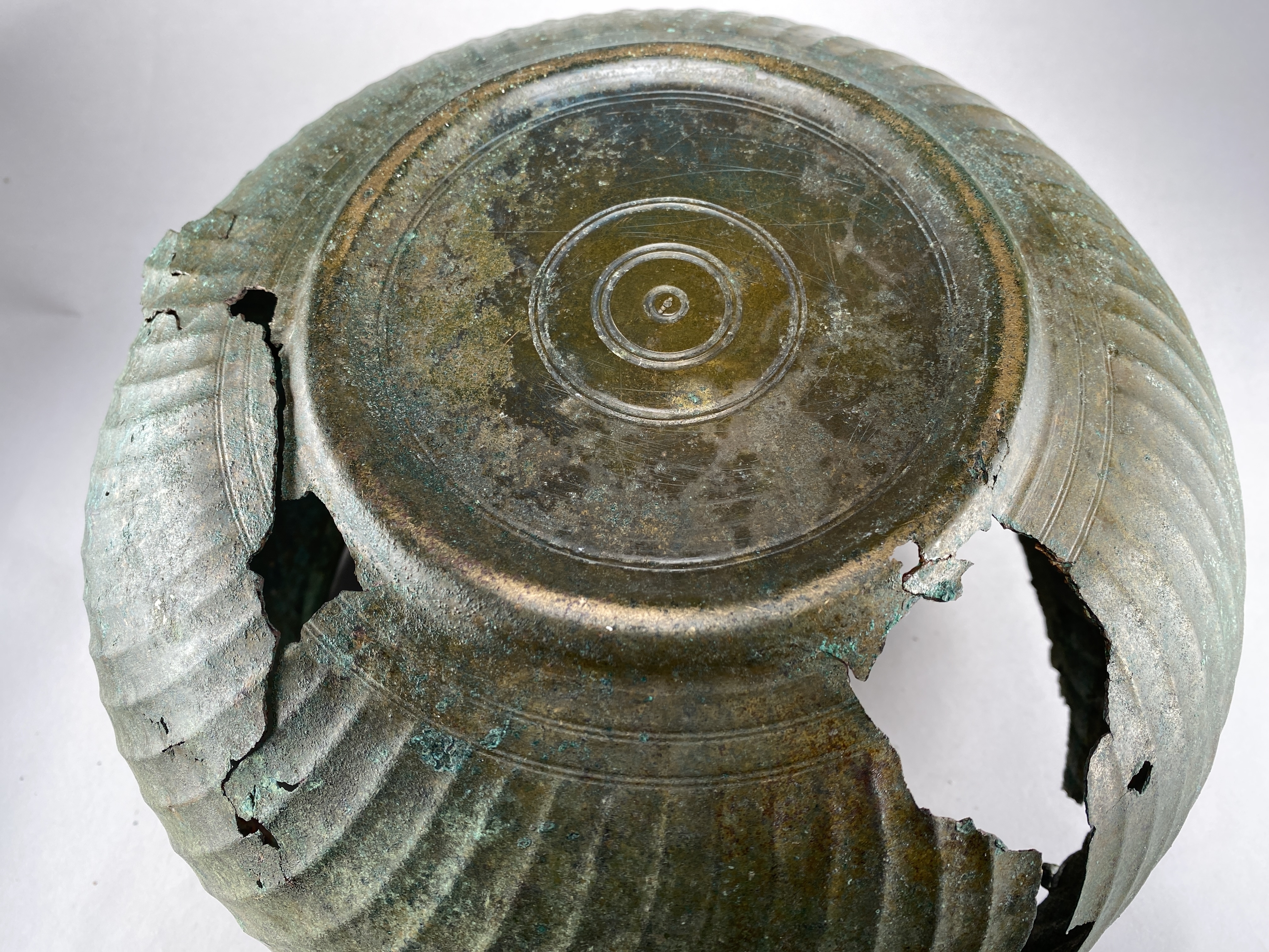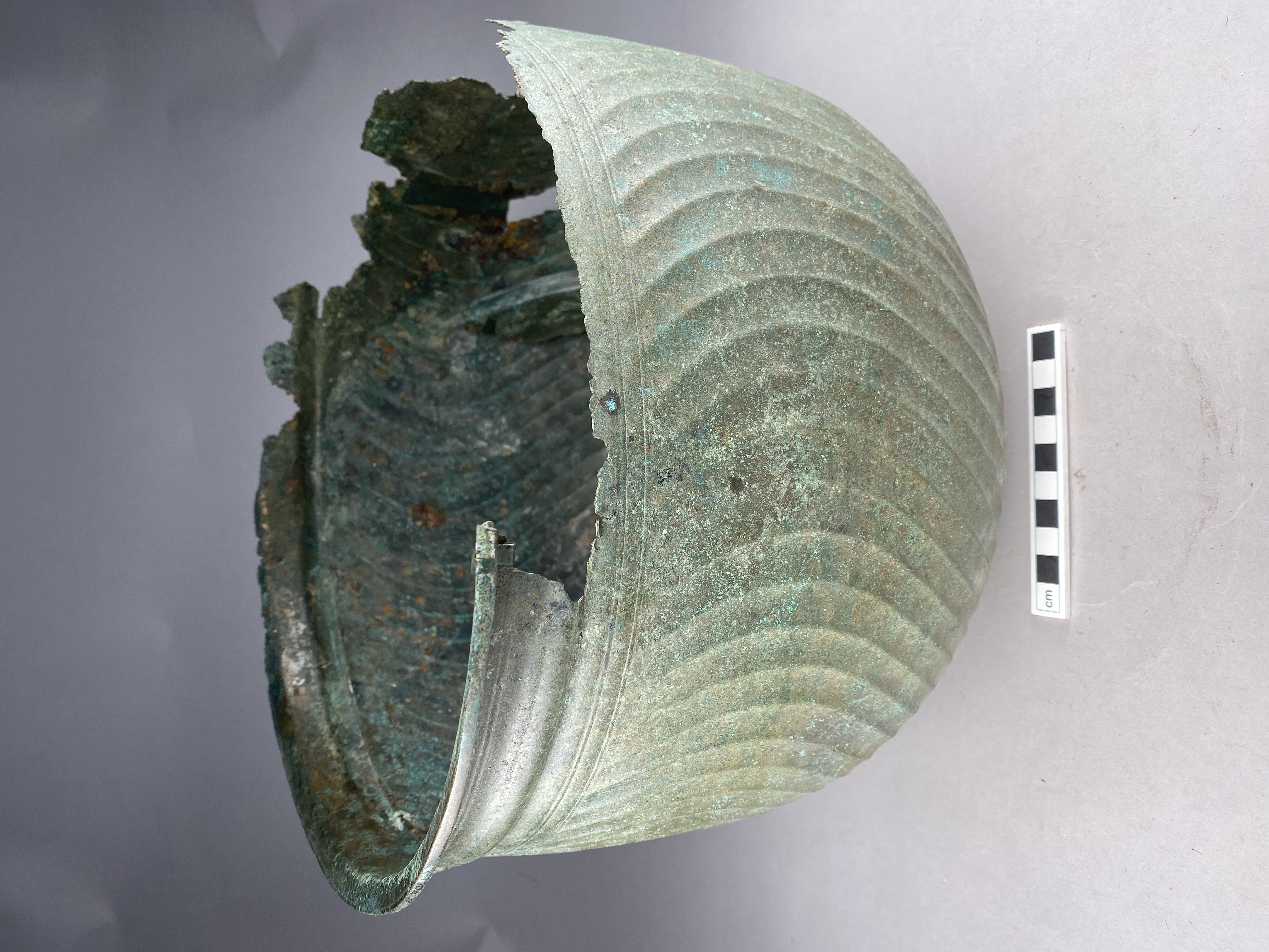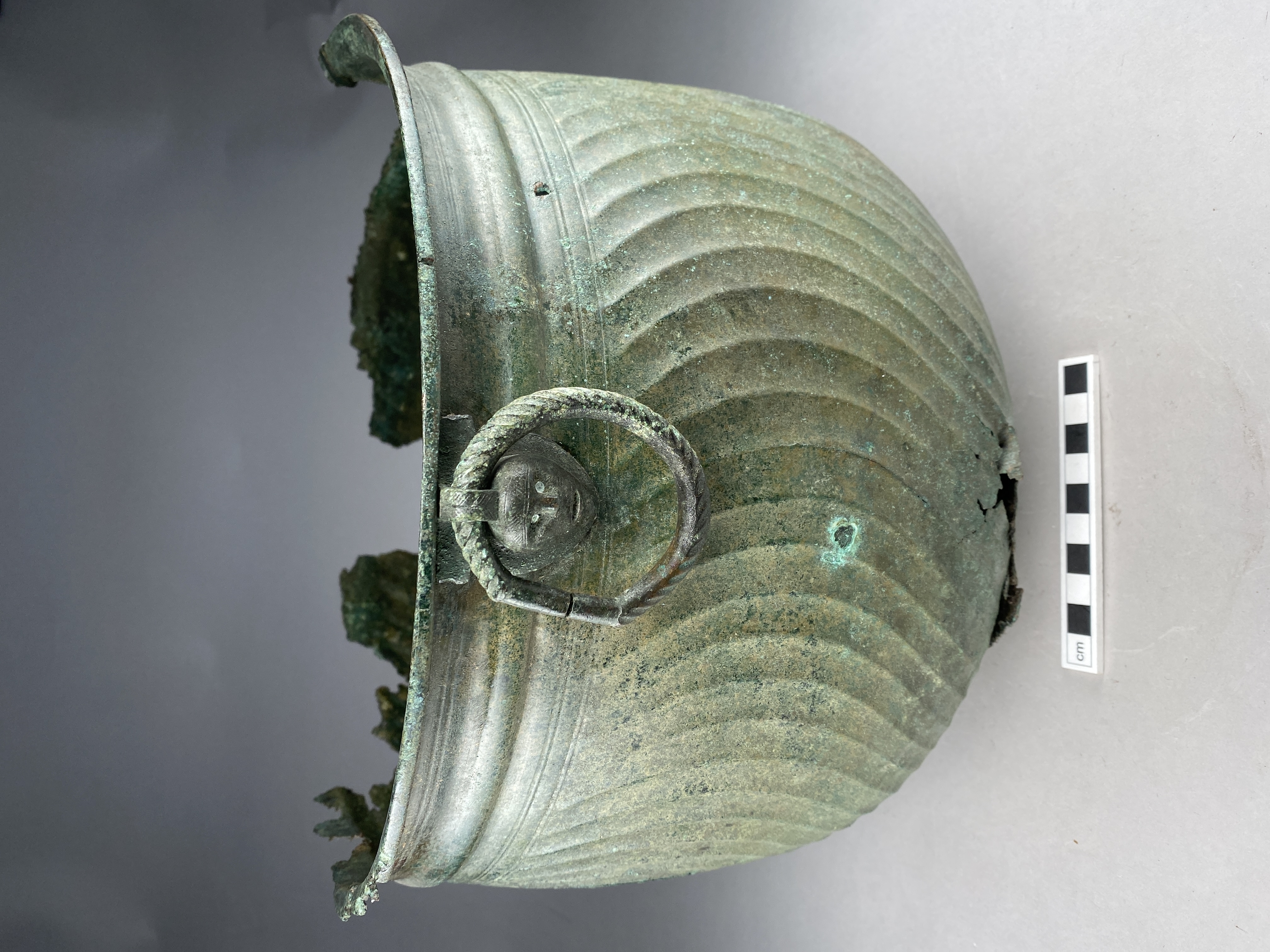 Kannelerat kärl av brons, del av dryckesservis. Buken dekorerad med rundade kannelurer. Under mynningen har det suttit två handtag, varav det ena sitter kvar in situ. Handtagens fästen är i form av ansikten sedda en face med en bärring. Mynningspartiet är dekorerad med vågräta ränder och en vulst. Mynningskanten är utvikt. Kärlet har en liten fot. På undersidan av botten finns dekor av koncentriska cirklar. Eggers typ E46. Dateringen ligger i äldre romersk järnålder: B2.
