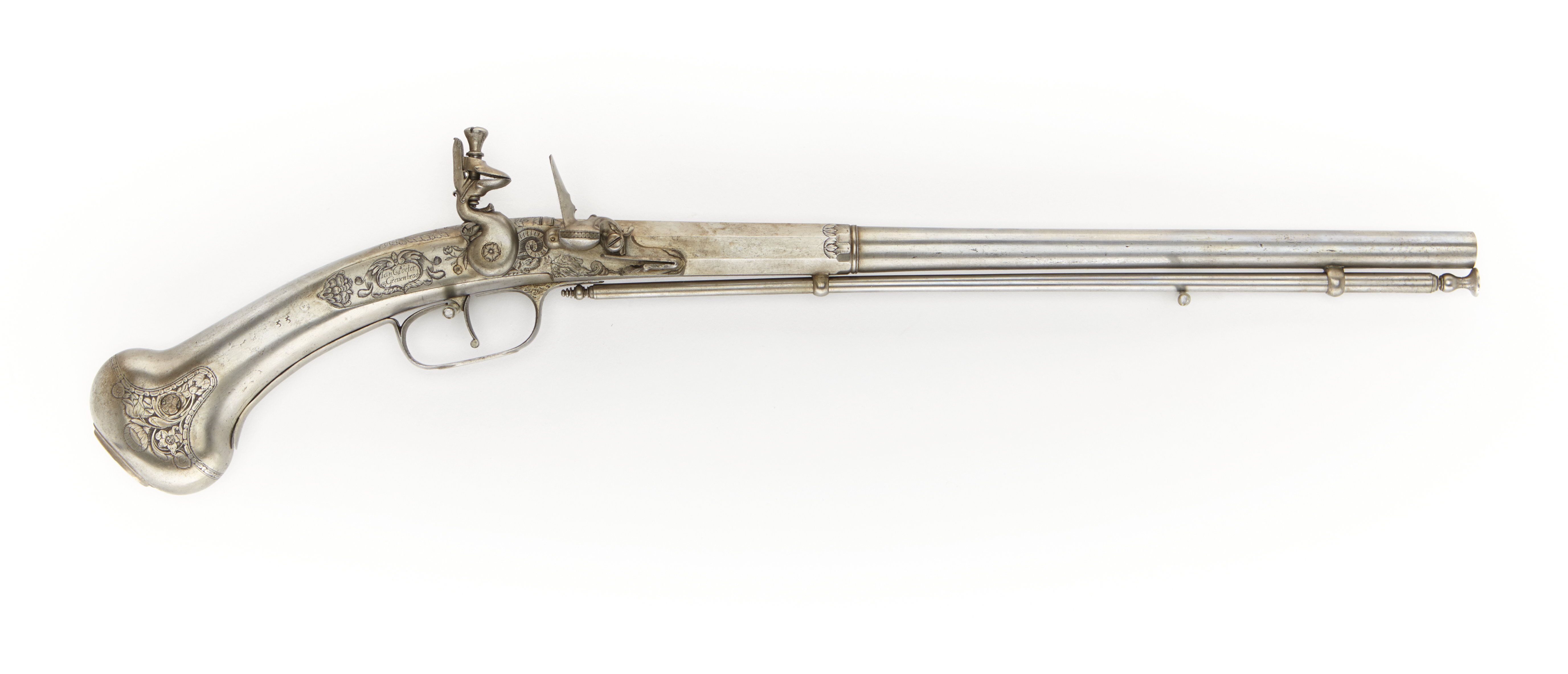 Rund över kammaren åttkantig, slätborrad pipa av stål, i ett stycke med kolven. På kammaren något graverad med blombårder samt antikiserande krigarhuvud i medaljong. Två rörkor på pipans undersida. Flintlås. Låsbleck av fransk typ, plant infällt i kolven. S - formig hane. På bröstet liten lock. Lös överkäke. Låsblecket signerat "Ian Cloeter- a Grevenbroch" (Stöckel p. 1643 - ca 1700). Graverad dekor med blomrankor samt mytologisk havsfigur skjutande pil på drake. Kolv av stål. Kolvens bakre del platt och utvidgad. Graverad dekor markerar kolvkappa med rundade, korta flikar. Centrumplatta med graverad sköldhållande ängel. På kolvhalsen graverat monogram: "C. F. V. A." under ärkehertigkrona. Fransk varbygel med på undersidan graverad kentauer lyftande ett lamm. Märkt: 55 bakom låsblecket, stanstyp 5376.