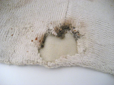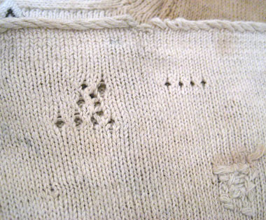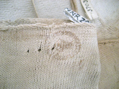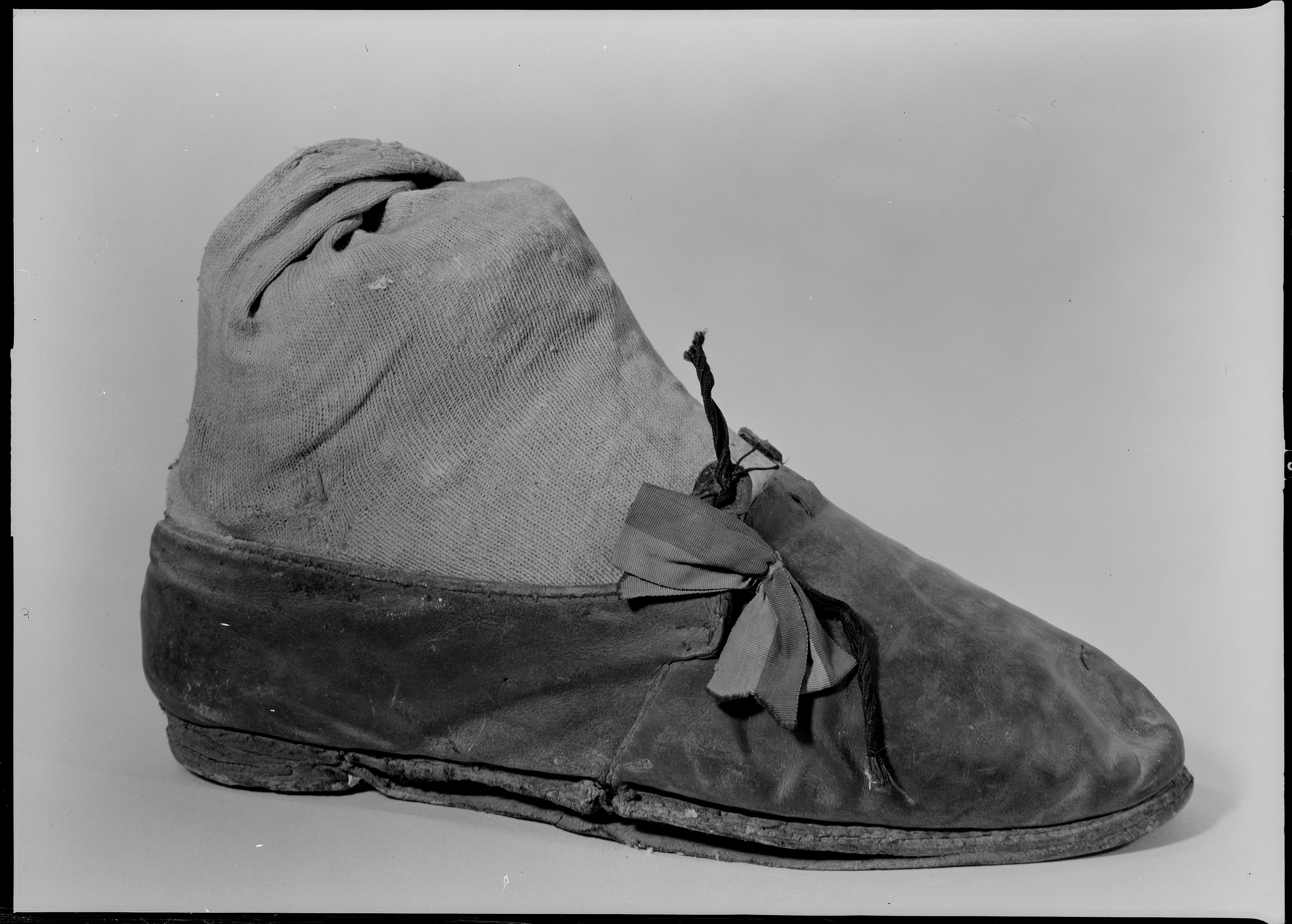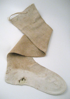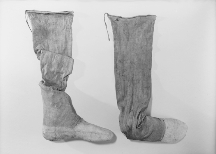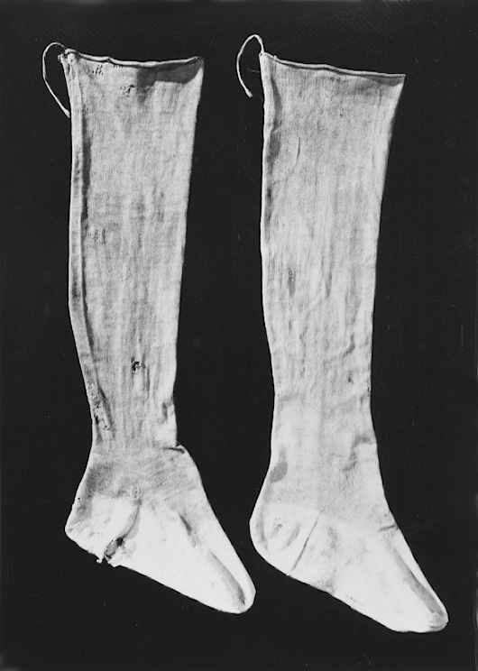 Strumpan är formstickad och har en söm mitt bak som löper ner under hela foten. Hälsöm samt tåsöm. Längst upp i sömmen, mitt bak är ett 145 mm långt, och 9 mm brett bomullsband fäst. 17 mm från överkanten finns tre grupper med hål i konststickning; 27 mm till höger om mittsömmen finns åtta hål, 15 mm till höger om detta finns ytterligare fyra, horisontella hål. 45 mm till vänster om mittsömmen bak finns tre horisontella hål. Mellan detta hålparti och mittsömmen bak finns en stämpel i form av en liggande oval, 17 mm hög, 27 mm bred, med otydlig symbol.