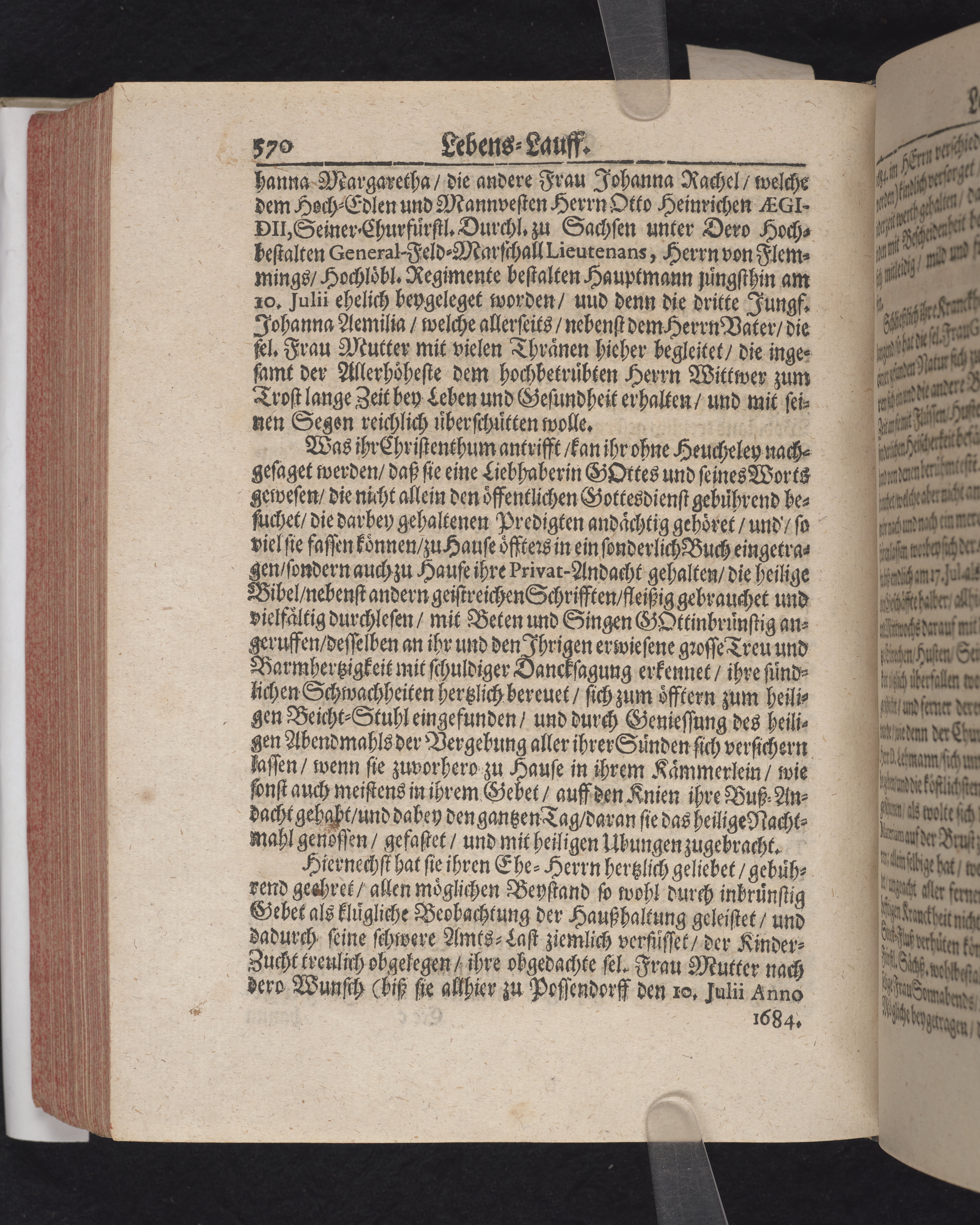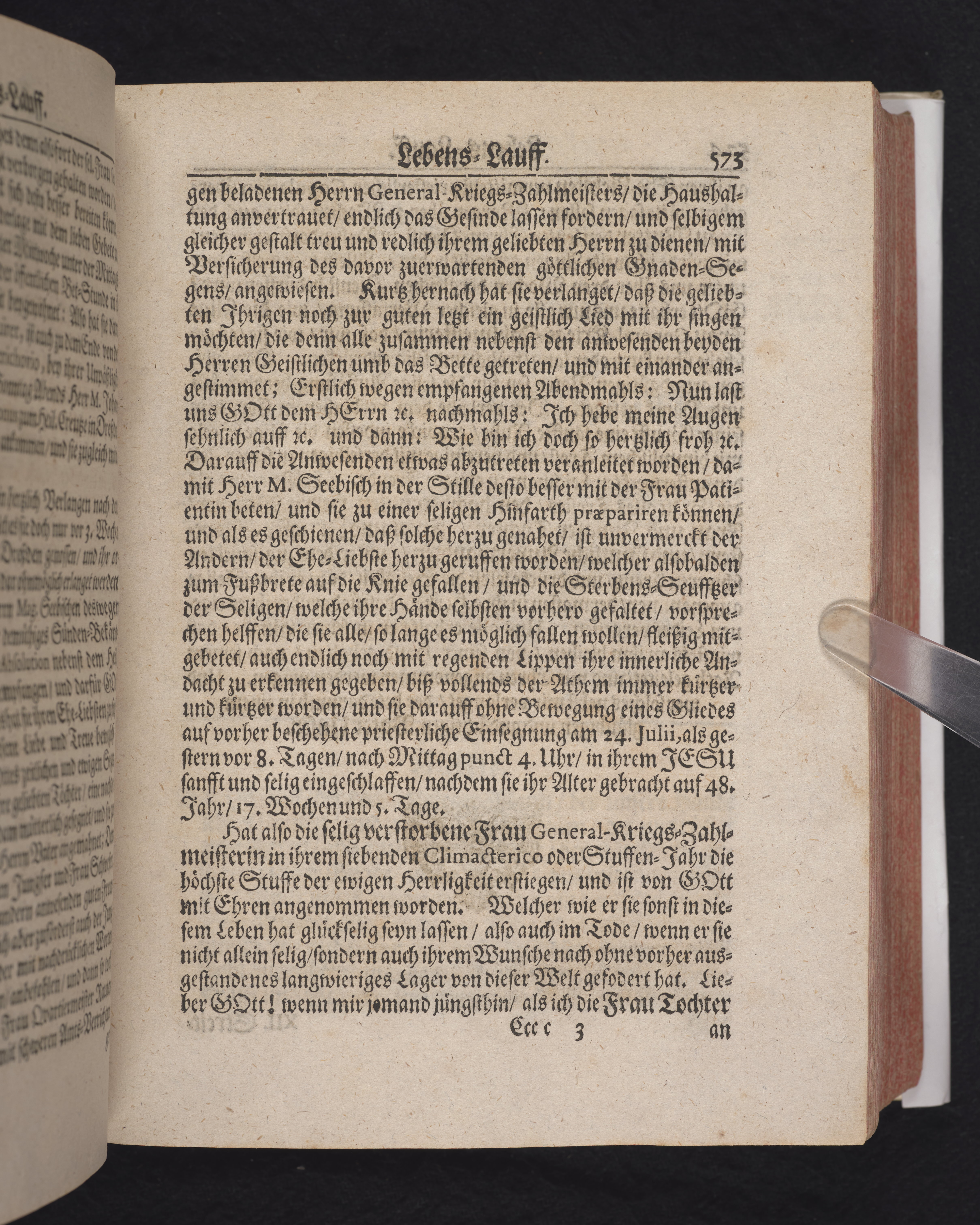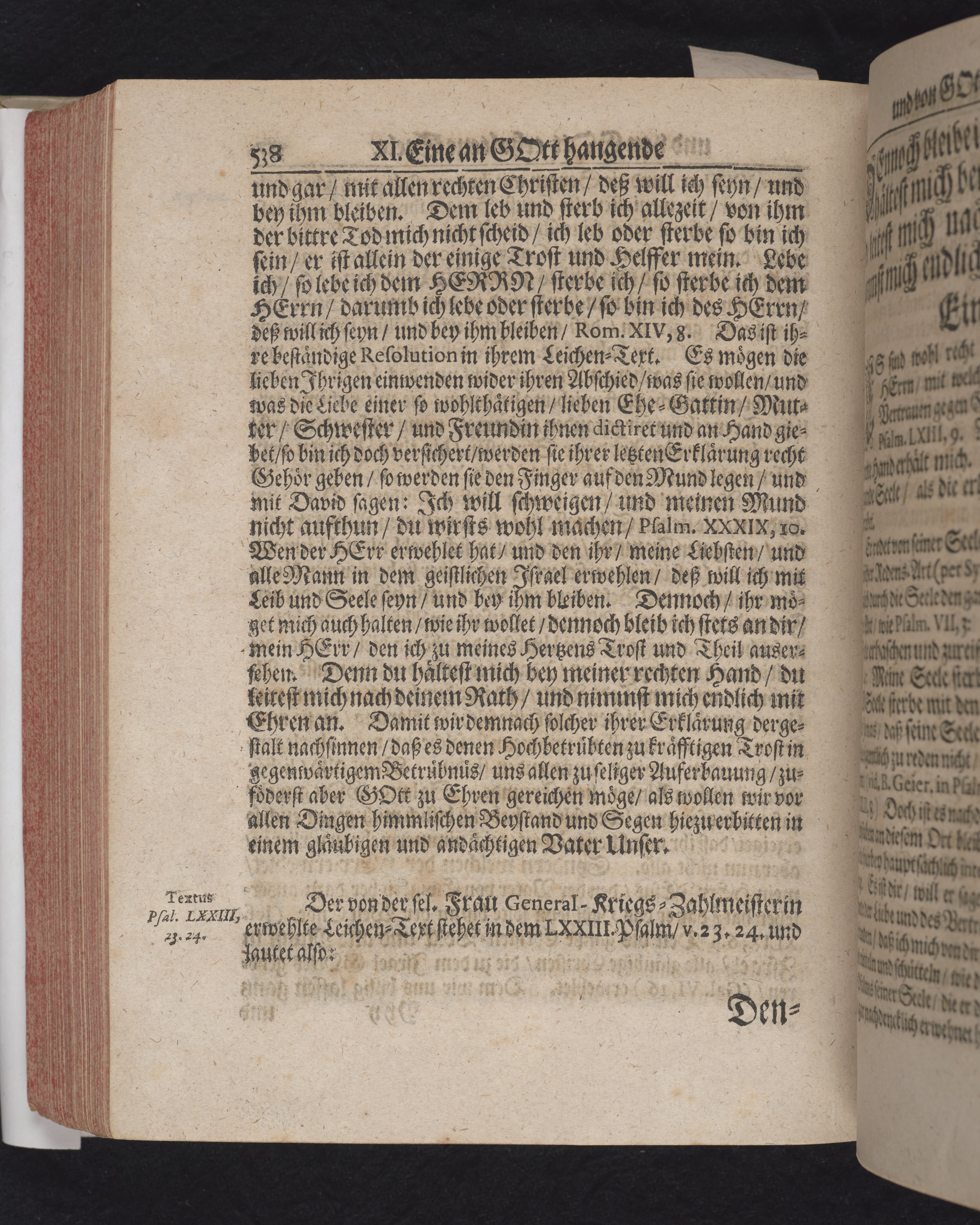 Ingår i en utgiven samling med 28 likpredikningar av Samuel Benedikt Carpzov: Grünende Gebeine, oder Leich-Predigten... Tryckt innehållsförteckning och register. Handskriven innehållsförteckning över de 28 likpredikningarna med bläck på främre försättsbladet (recto och verso).