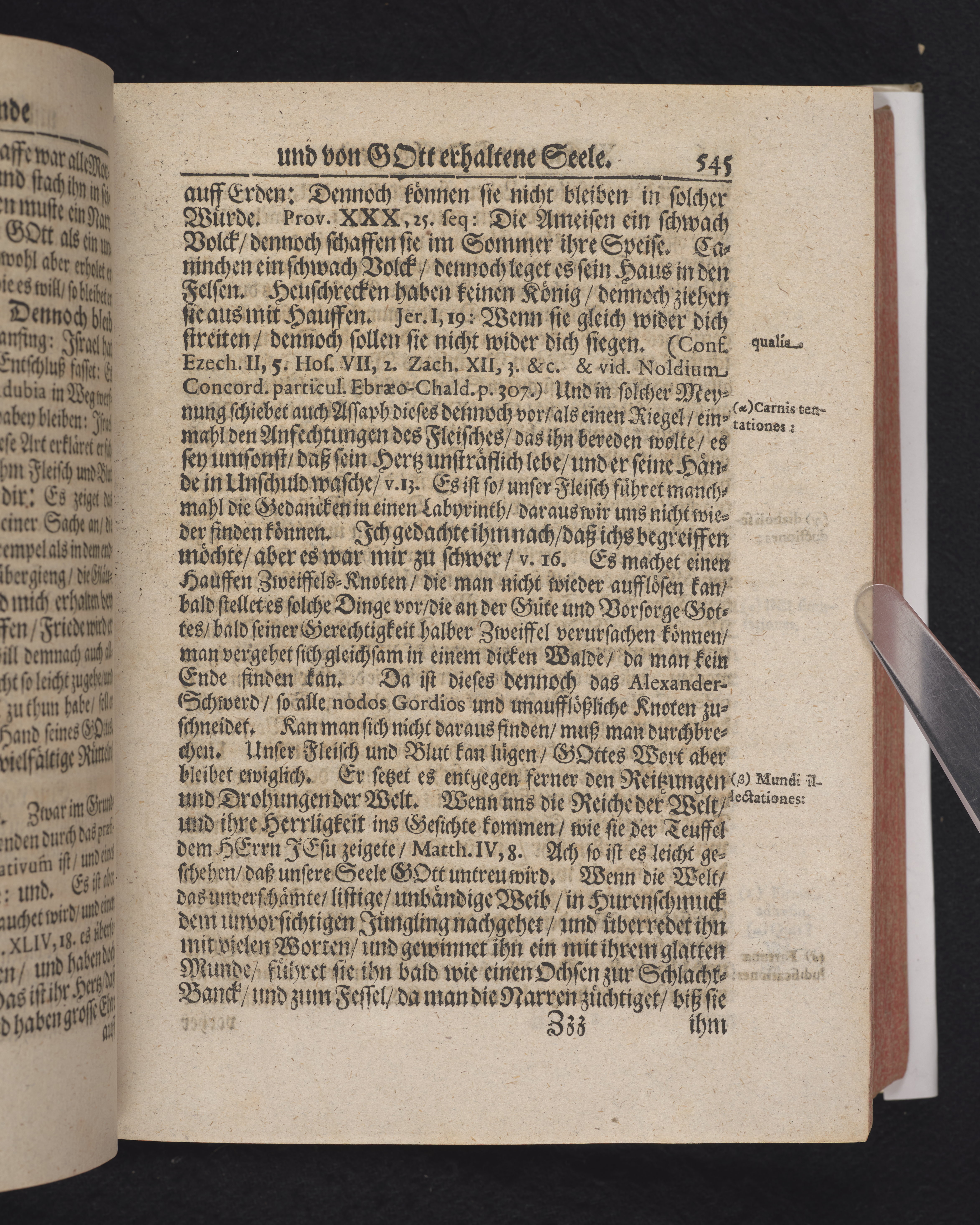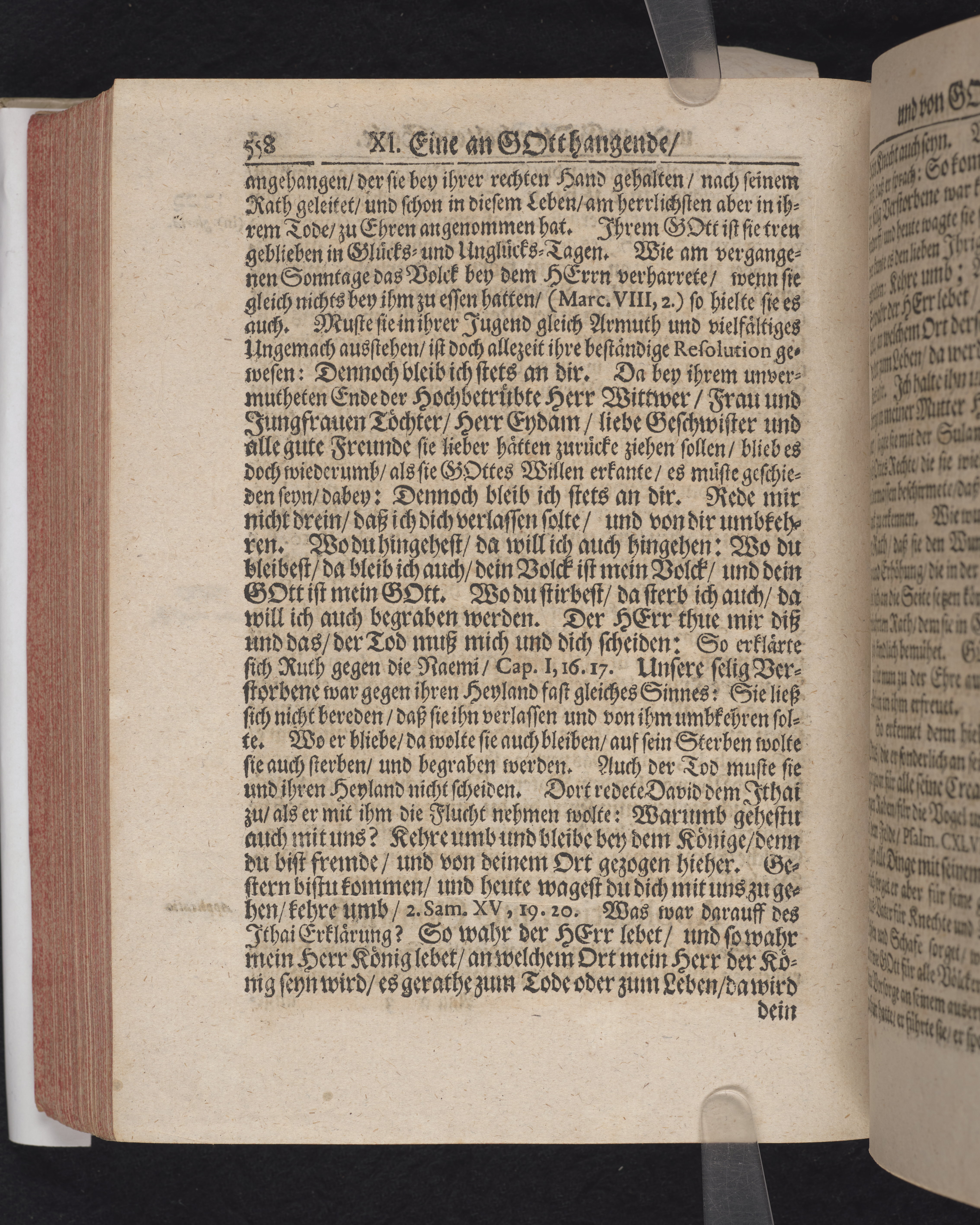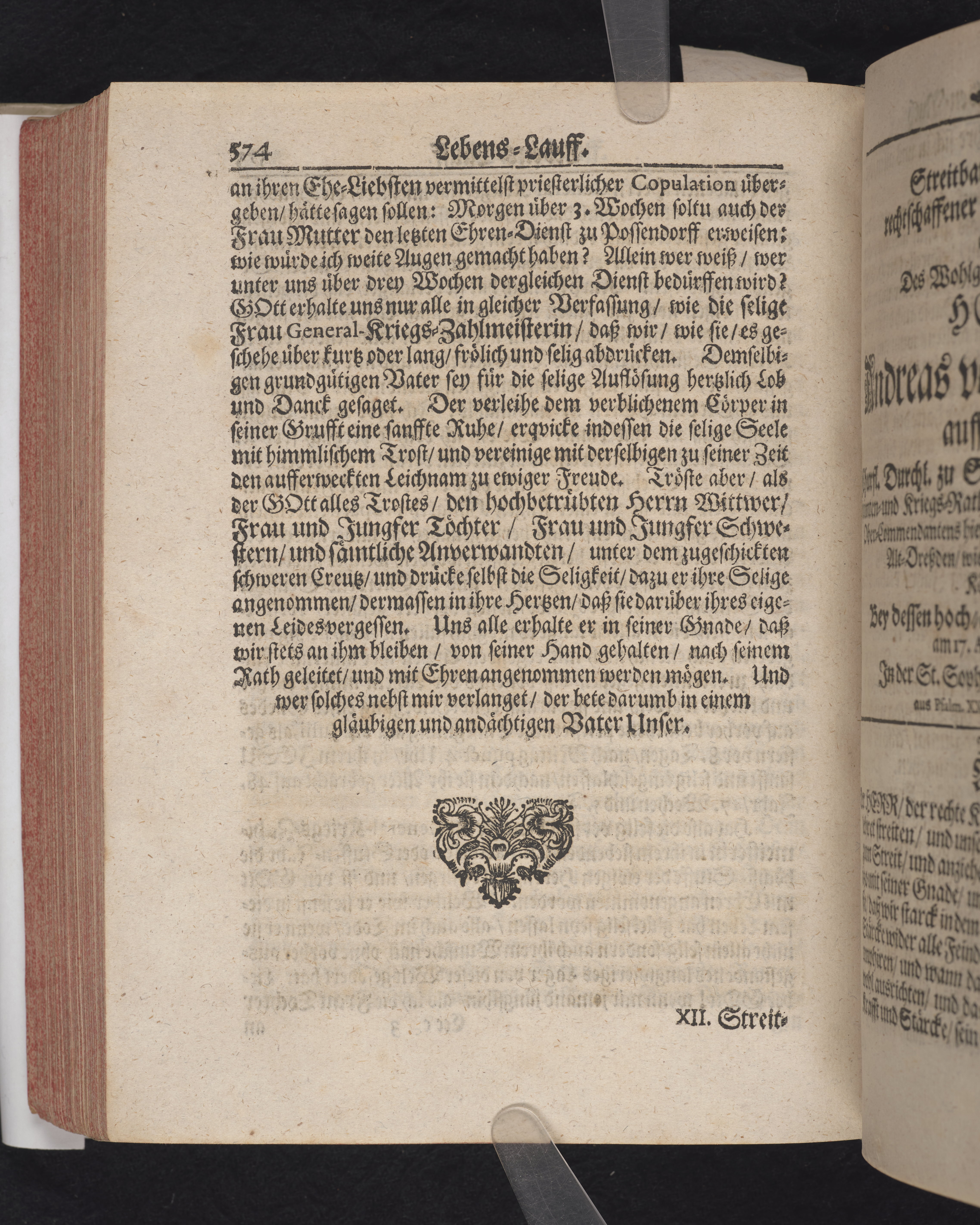 Ingår i en utgiven samling med 28 likpredikningar av Samuel Benedikt Carpzov: Grünende Gebeine, oder Leich-Predigten... Tryckt innehållsförteckning och register. Handskriven innehållsförteckning över de 28 likpredikningarna med bläck på främre försättsbladet (recto och verso).