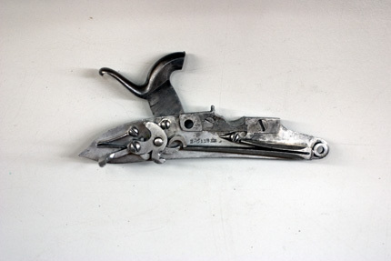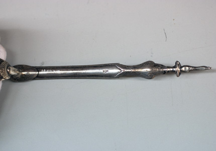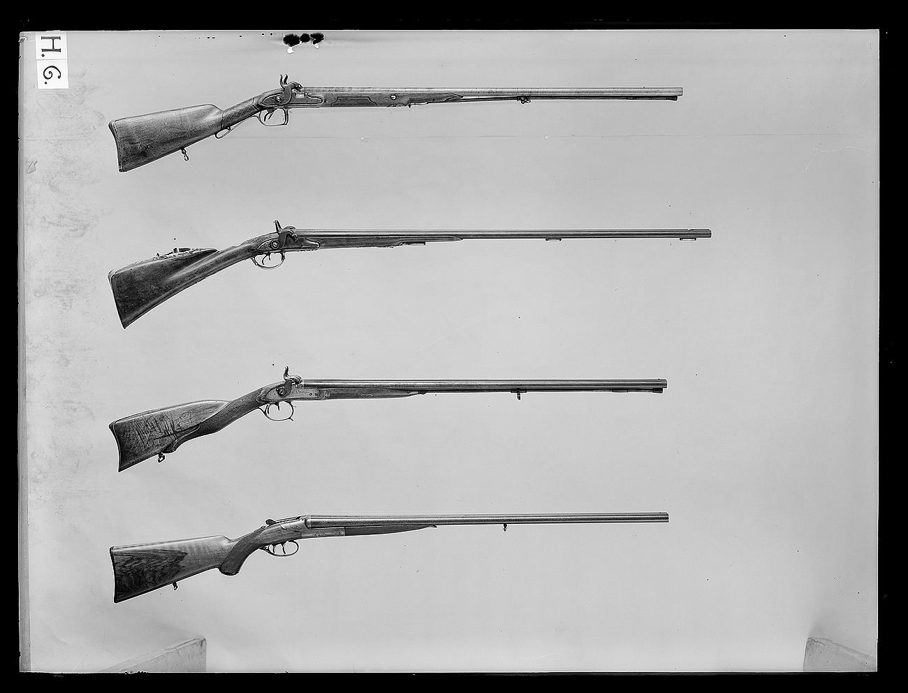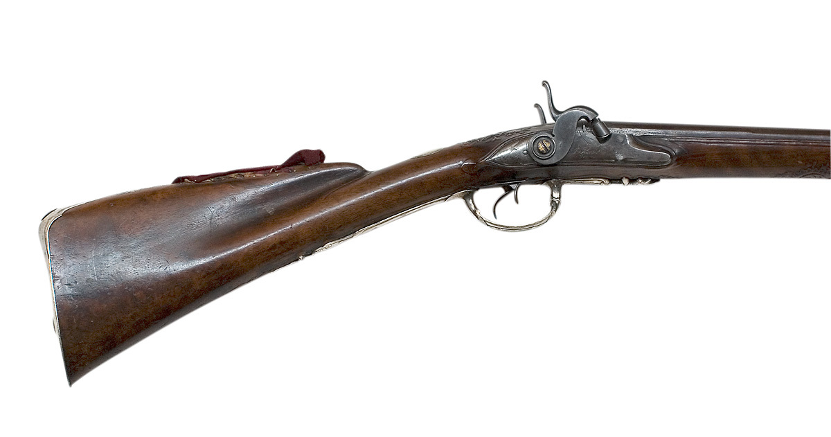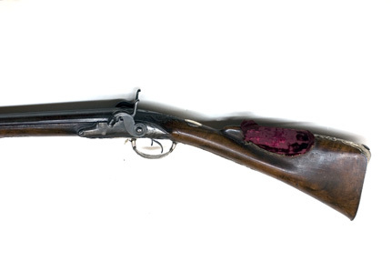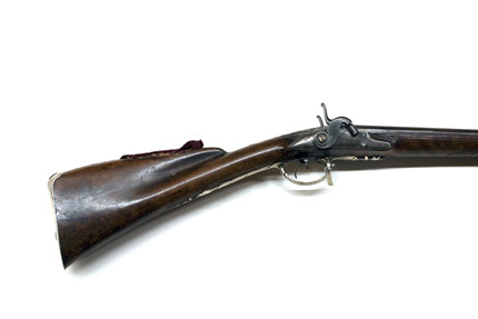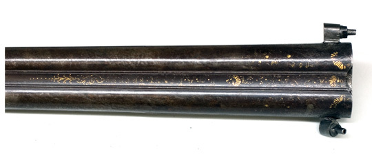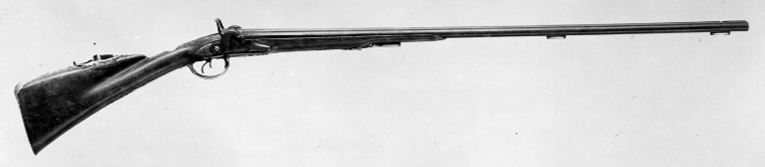 Rund, slätborrad brunerad dubbelpipa av stål. På kamrarna nästan helt utsliten dekor av påslaget guld, på spången mycket otydlig guldtext: " F & A PENEL FRERES." På sidorna inskruvade nästan lodräta cylindrar med tändhattsnipplar. Svansskruvarna saknas. På v. pipas undersida otydlig, stämpel:" FP" samt graverat(?) "Bertea Dumares", på h. pipa: "TORDU". På pipans undersida klack med hål för laddstock och gänga. Två rörkor av silver. Riktmedel: Baskylblad med brett skålat sikte. Spolformigt korn av silver, omgivet av påslagen stråldekor av guld. Fästning: Pipan ursprungligen fäst med baskylhakar samt en skruv igenom spetsrörka och framstock i klacken på pipans undersida. Baskyl av gråanlöpt stål med bakåt avsmalnande, rundat blad, graverad kantlinje och blad på bakspetsen. Två flintlås ändrade till slaglås. Välvda låsbleck med något försänkta bakspetsar, konturerad fals. Graverade signaturer: "F & A Penel // Freres." (AP ligatur). Kraftiga platta hanar med ringvulster runt hanskruven, h. skruvhuvud med bladdekor mot punsad och förgylld bakgrund, v. skruvhuvud kraftigt välvt. Igensatta hål efter eldstålsaxel och- fjäder. Ovanför slagfjädrarna stämplat: "B. GILIER". Fästning: Två låsskruvar från v. sida. Konturerat avtryckarbleck med graverad kantlinje. Dubbla avtryckare. Halvstock av valnöt med fint snidad rokokodekor runt baskylbladet och vid spetsrörka och varbygel, kraftigt markerad fals, smal kolvnäsa. På kolvryggens sida rester av kudde med tagelstoppning klädd med röd sammet. Beslag av silver, bakplåt-kolvkappa med konturerad och ciselerad flik på kolvryggen, på spetsen bladdekor i relief, vid hälen graverat ett lejon. Vid tån graverat: N:o 16 samt stämpel hjorthuvud. På insidan rektangulär mässingstunga med hål för fäststift, bakplåten fäst med två stålskruvar samt ett tvärgående stålstift genom kolven. Oval tumplåt med slät kantning, stämpel hjorthuvud, tumplåten fäst med skruv under varbygelns bakre arm. Rund spetsrörka med kraftigt konturerad spets med reliefdekor, ett hjorthuvud, fas med hornen omgivande hålet för pipans fästskruv, på insidan väderkvarnsliknande stämpel. Varbygel av silver med bred, bandformig bygel, runda stolpar, reliefdekor med mitt- och kantlister, snäckliknande dekor vid stolparna. Främre armen platt med brett fasade kanter, avslutning likande urna med symmetriskt blad, bakre armen lång, smal, välvd med kantlister, symmetrisk spets, på bakre armens insida väderkvarnsstämpeln. På insidan av framstolpen en mässingstunga med hål för fäststift, på insidan av bakre armen en mässingshake, varbygeln fäst med haken i stålstift i urtag i kolven samt stålstift genom kolven från låsurtag till sidbleck.