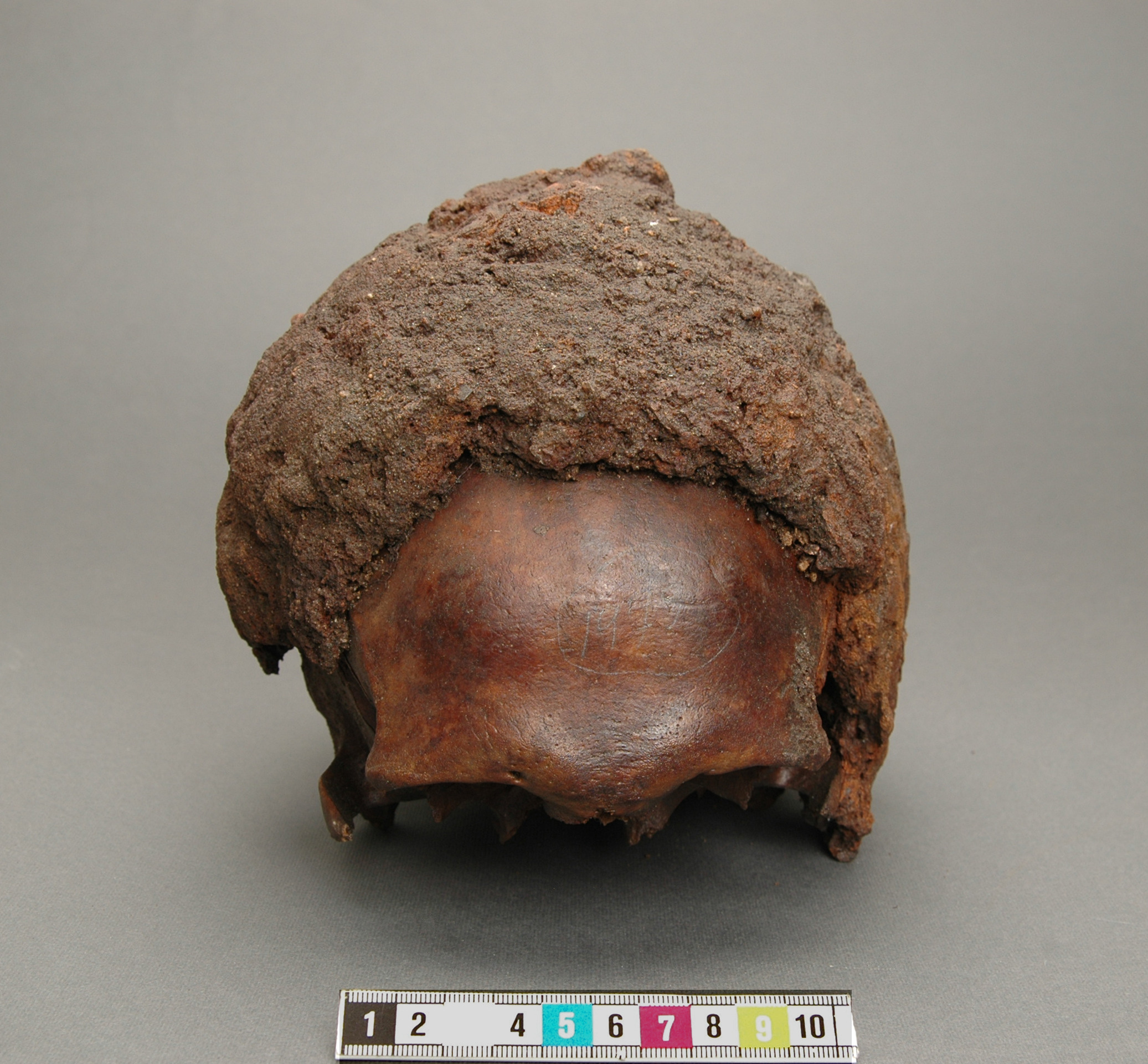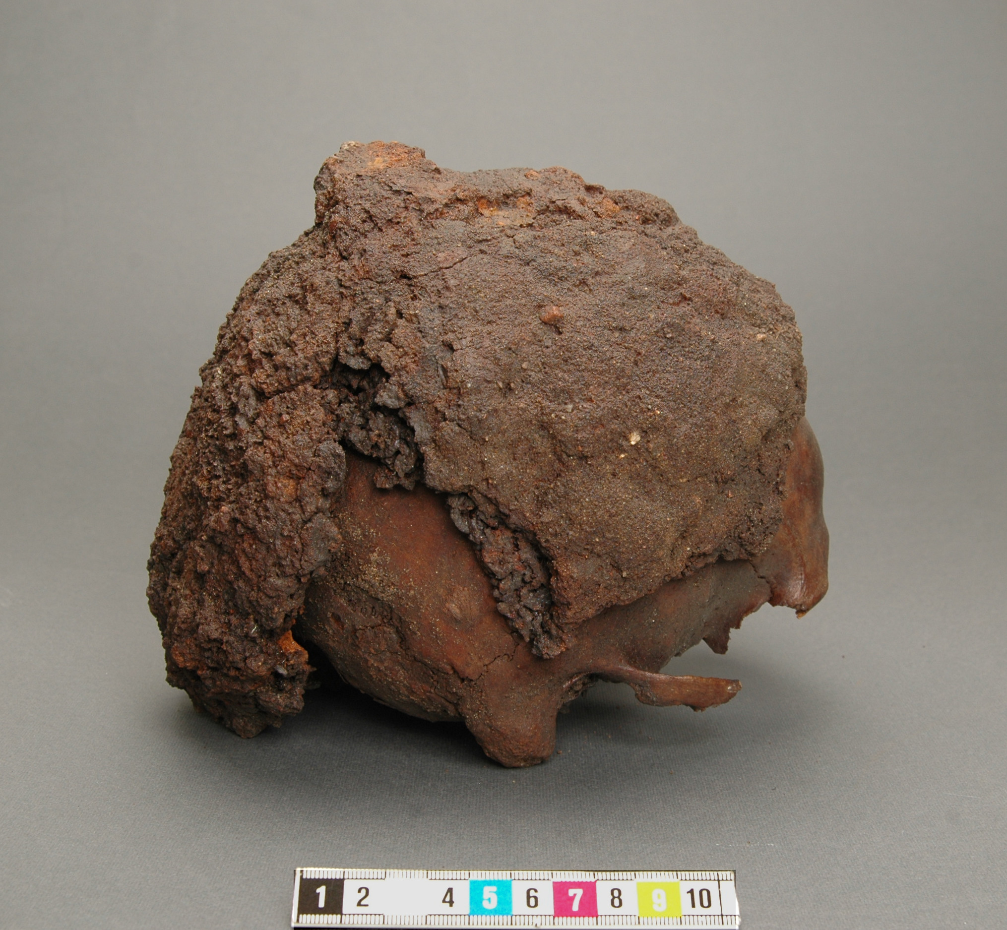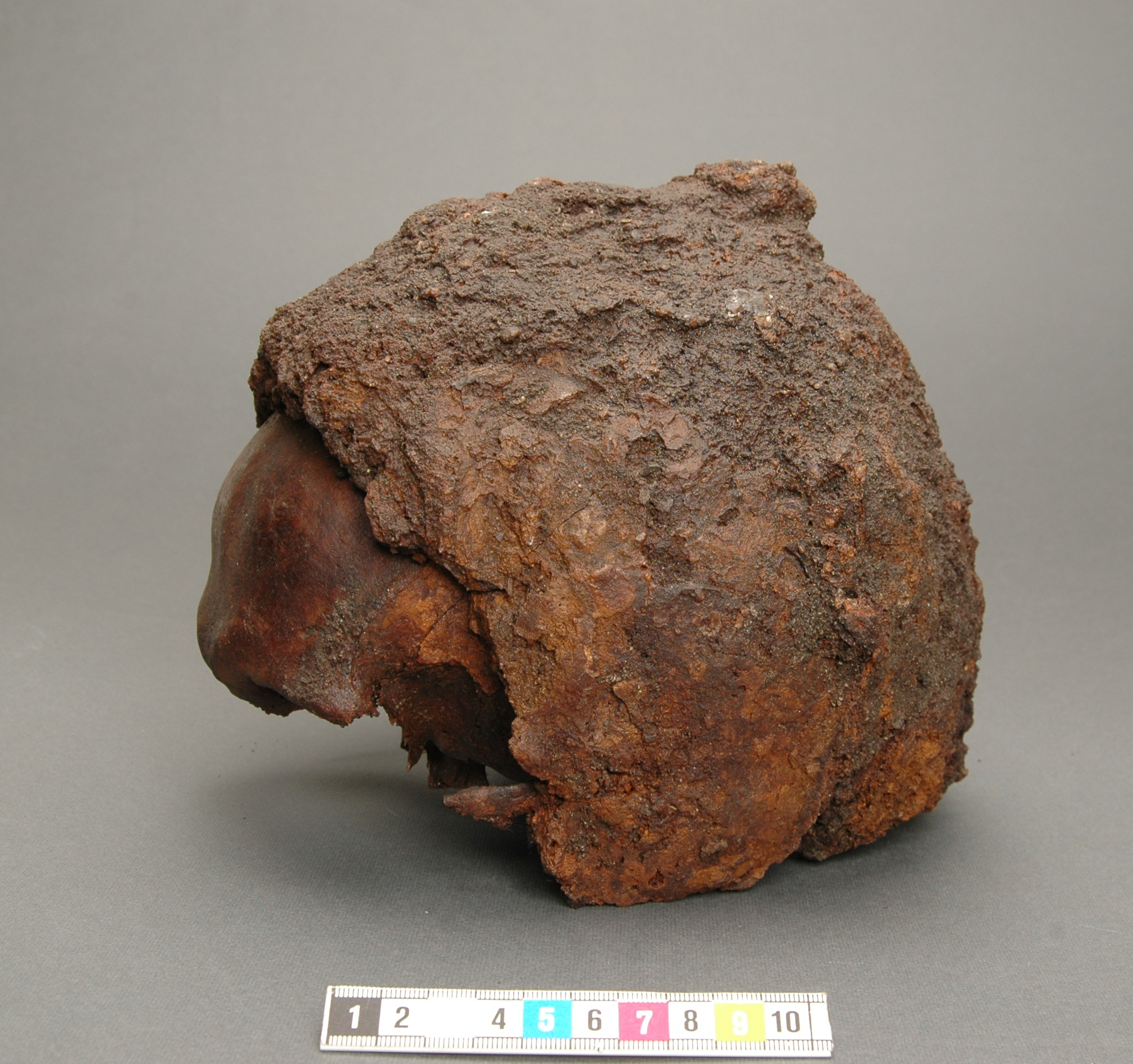 Huvan omsluter ett trasigt kranium. Omkring 150 små ringbrynjefragment.