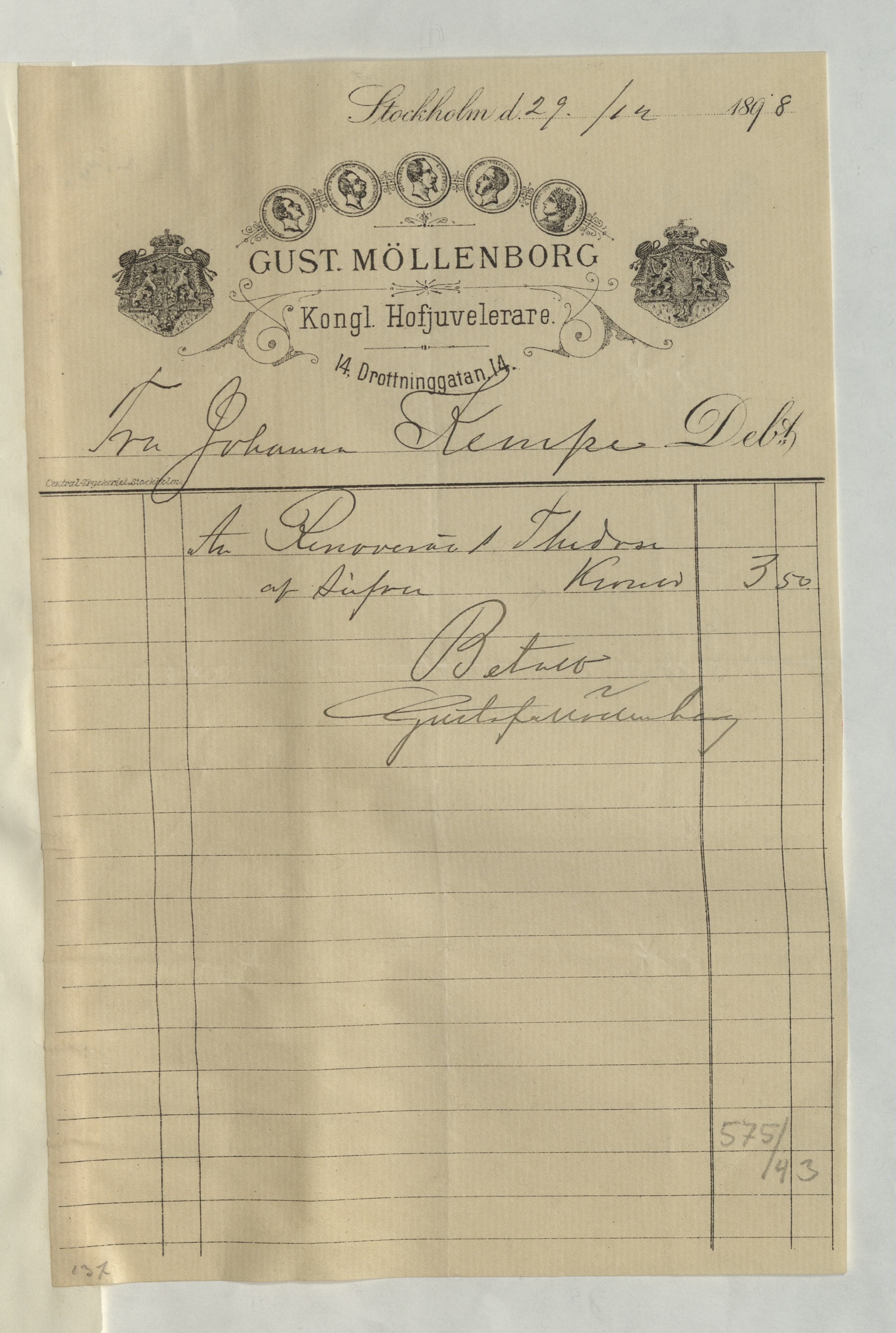 Kvitto från Gustaf Möllenborg, Juvelerare, 1898