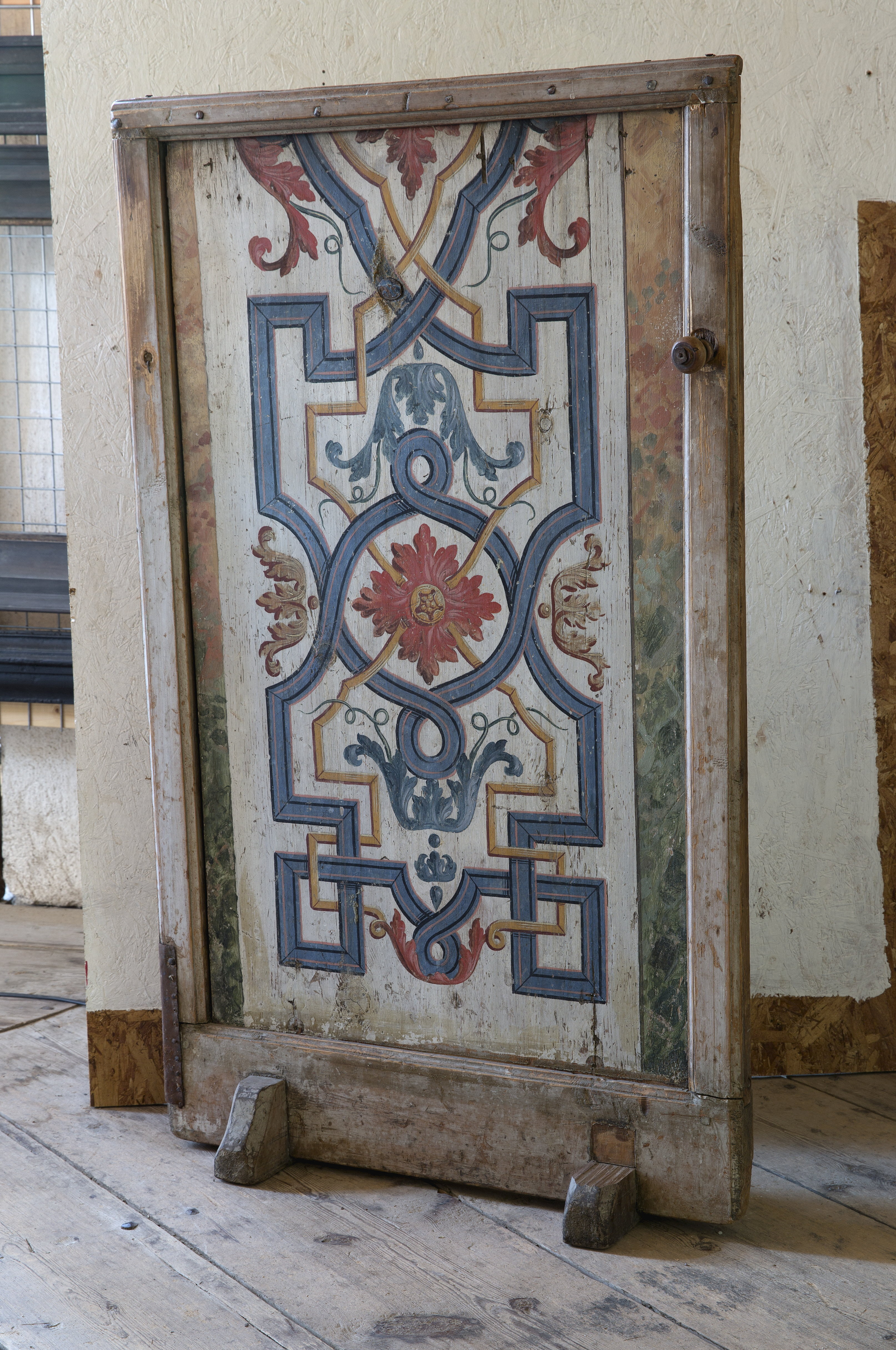 Profilerad ram med handtagsknopp på höger sida , längst ner till vänster påspikad järnplåt. Två korta , tvärställda fötter. Målad i i blått, gult, rött m. fl. färger mot vit botten. Möjligen från Salsta. Troligen målad 1700-1720. Sekundärt använd eldskärm. Ursprungligen fönstersmygpanel eller nattlucka.