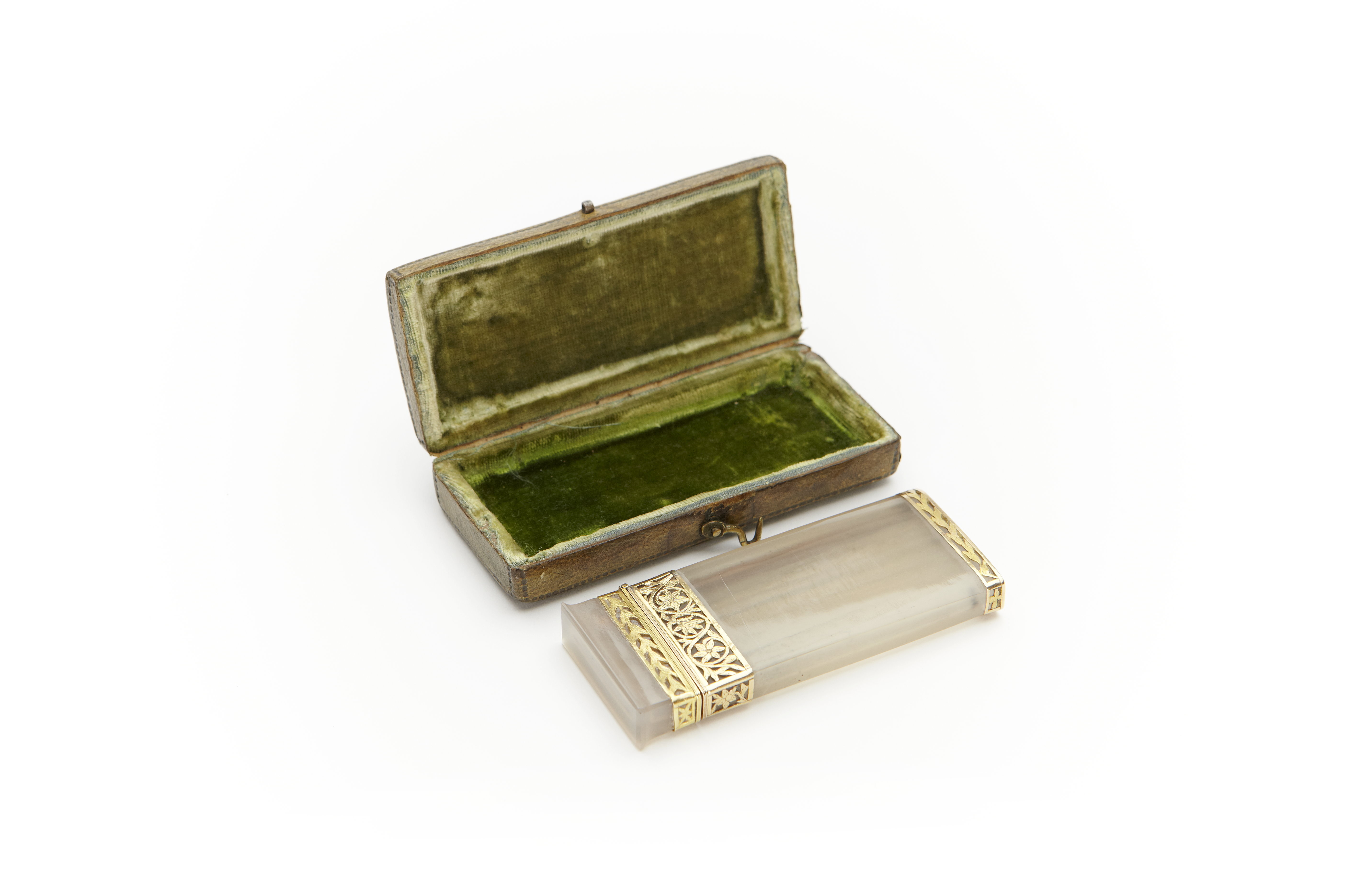 Pennfodral med lock, allt av agat, montering av genombrutet guld.