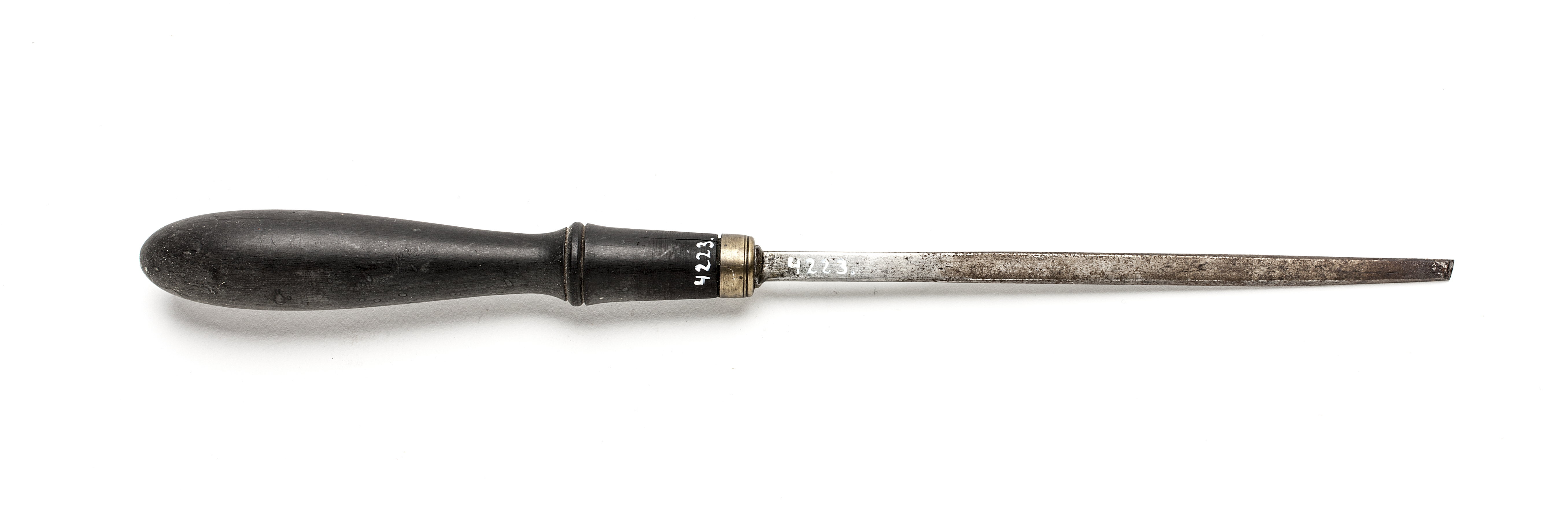 Klinga med rektangulär genomskärning. Sned egg, något slipad från ovansidan. Svarvat skaft av ebenholts med en vulst. Mässingsring.
