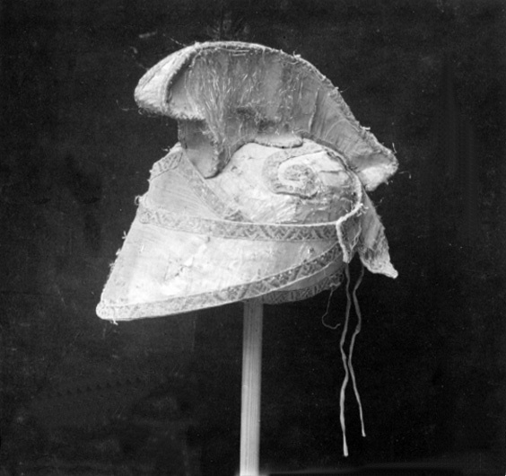 Hjälm i "romersk" stil; stomme av kartong klädd med svagt grönskimmrande silvertyg; foder av linnelärft; framtill en skärm; baktill ett nackskydd; både skärm och nackskydd lösa; fram- och sidostycken i en del, framtill i en spets uppåt; på hjälmens kulle en kam; skärm, nackskydd, sidor och kam prydd med guldgalon (13 mm bred); upptil på kronan är bandet format till en volut; baktill på insidan två spänntampar av smalt band; foder av fyra delar; i fodret märkt D No 5. Yttertyget kraftigt nött och trasigt; fodret starkt smutsat och trasigt.
