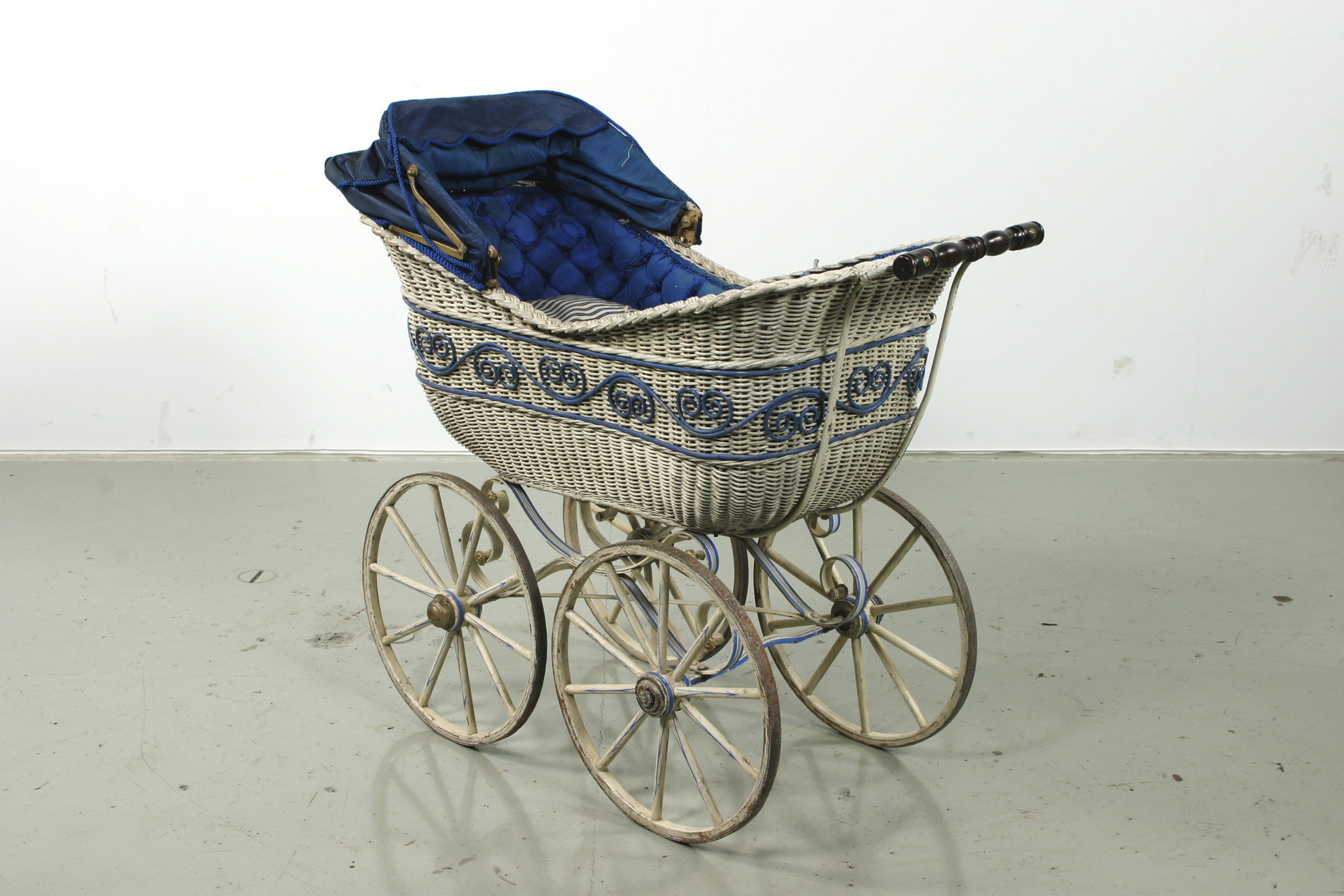 Vagnskorg, liggvagn, av vitmålad rotting med flätad överkant. En blå dekoration i ett vågformigt mönster med voluter i trä på sidan av korgen. Suflett av blått siden kantad av snöre av silkestråd samt med gånjärn av förgylld mässing. Två handtag av mahogny, ett fram och ett bak (332mm). Vagnskorgen vilar på en ställning av vitmålat stål med dekoration av blå ränder. Ställningen vilar på fyra hjul (diam 418mm). Hjulen är av vitmålat trä med tio ekrar med järnskodda hjulskenor. Vagnens innersida är baktill klädd med en kudde av blått siden. Kanterna är klädda med blått siden. I botten ligger två lösa dynor och en kudde av vitt bomullstyg med blå ränder.