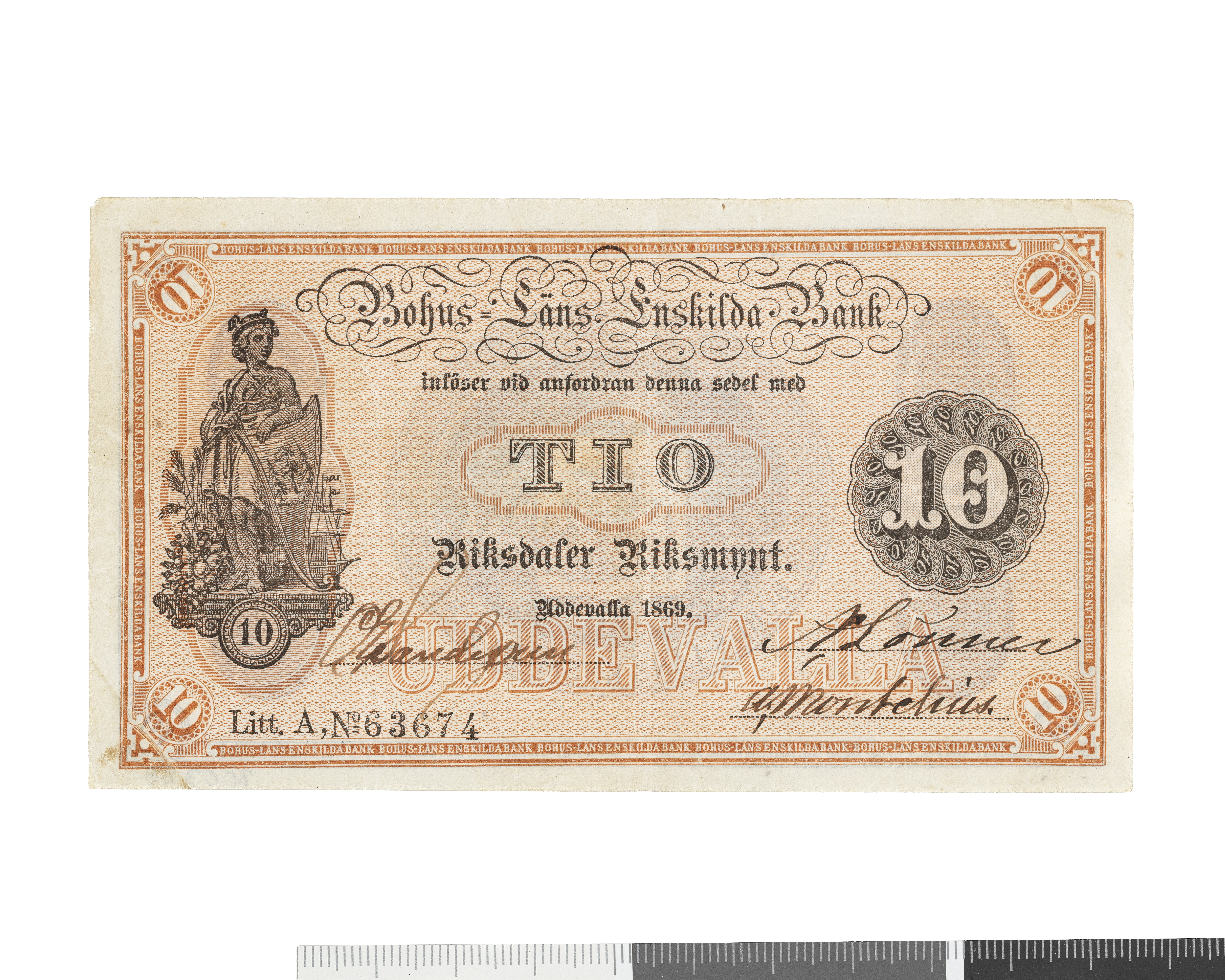 Upphov: Bohusläns Enskilda Bank. Media: Bonnevier, Helena. Ekonomiska museet - Kungliga myntkabinettet/SHM, (PDM) Upphovsrätten till detta verk har gått ut och är därmed fritt att använda på alla sätt. Ange gärna upphovsperson om denne är känd.