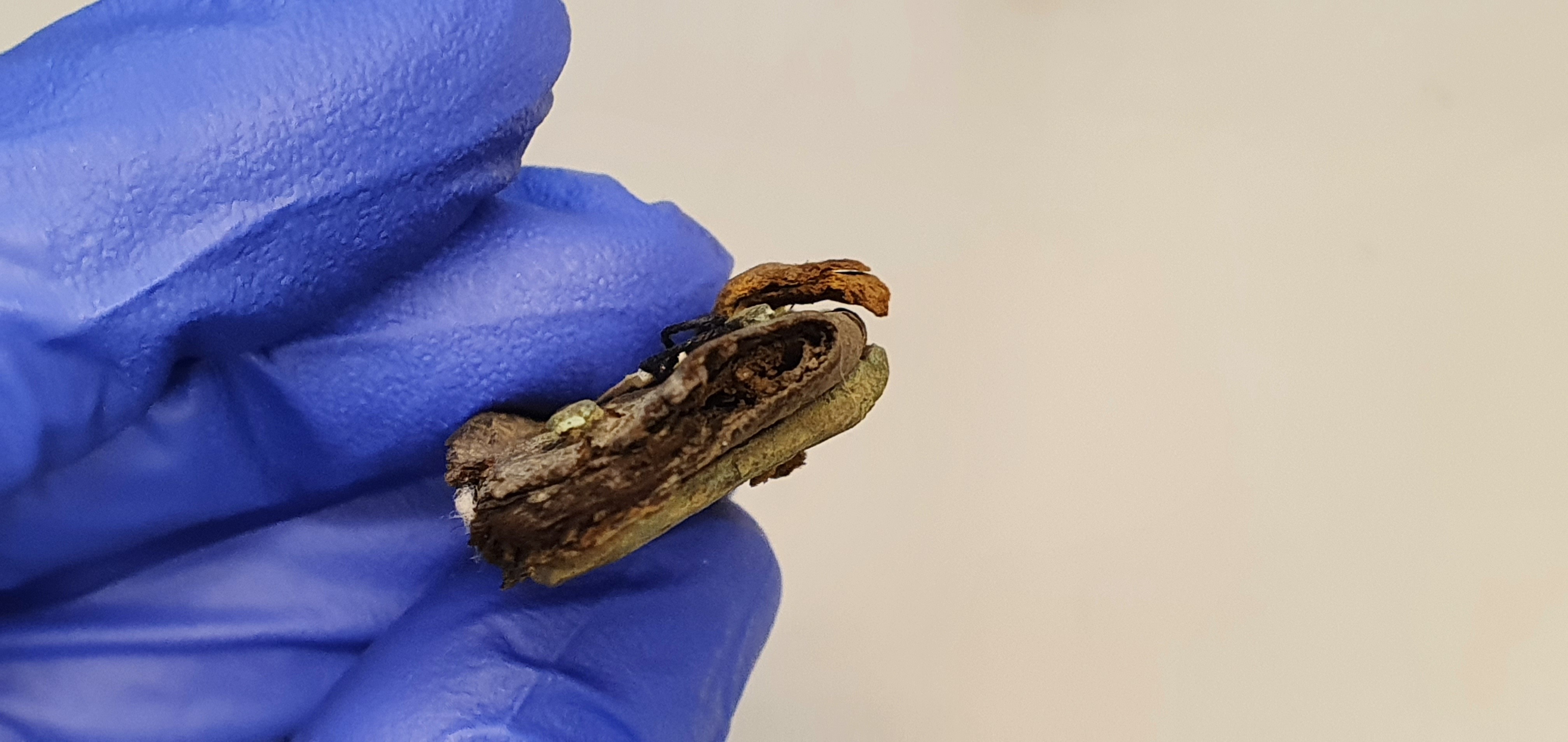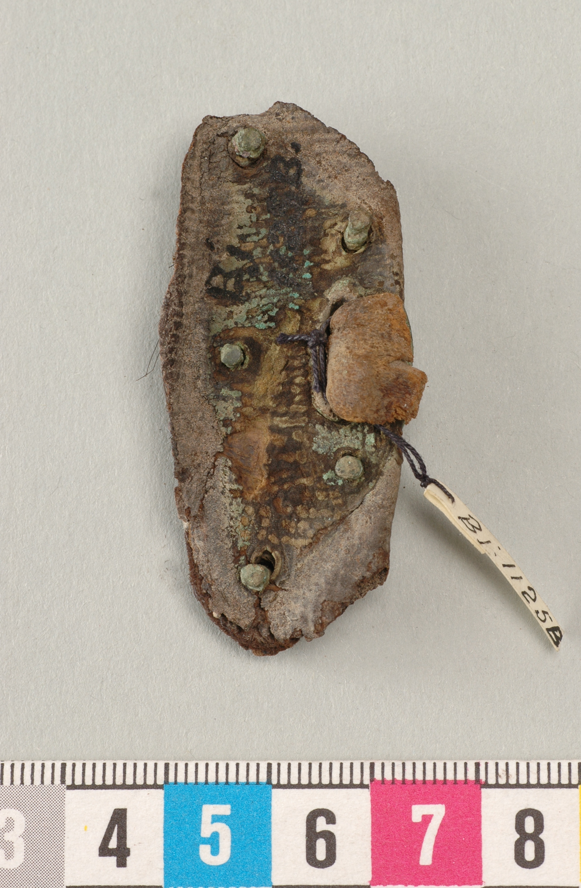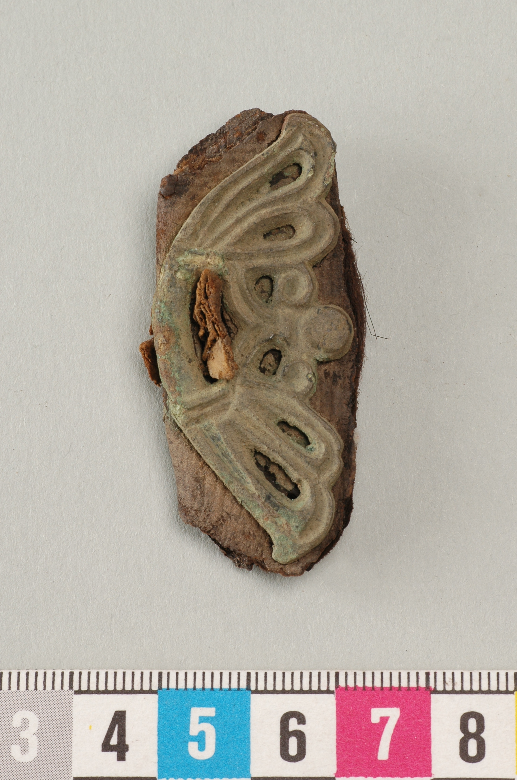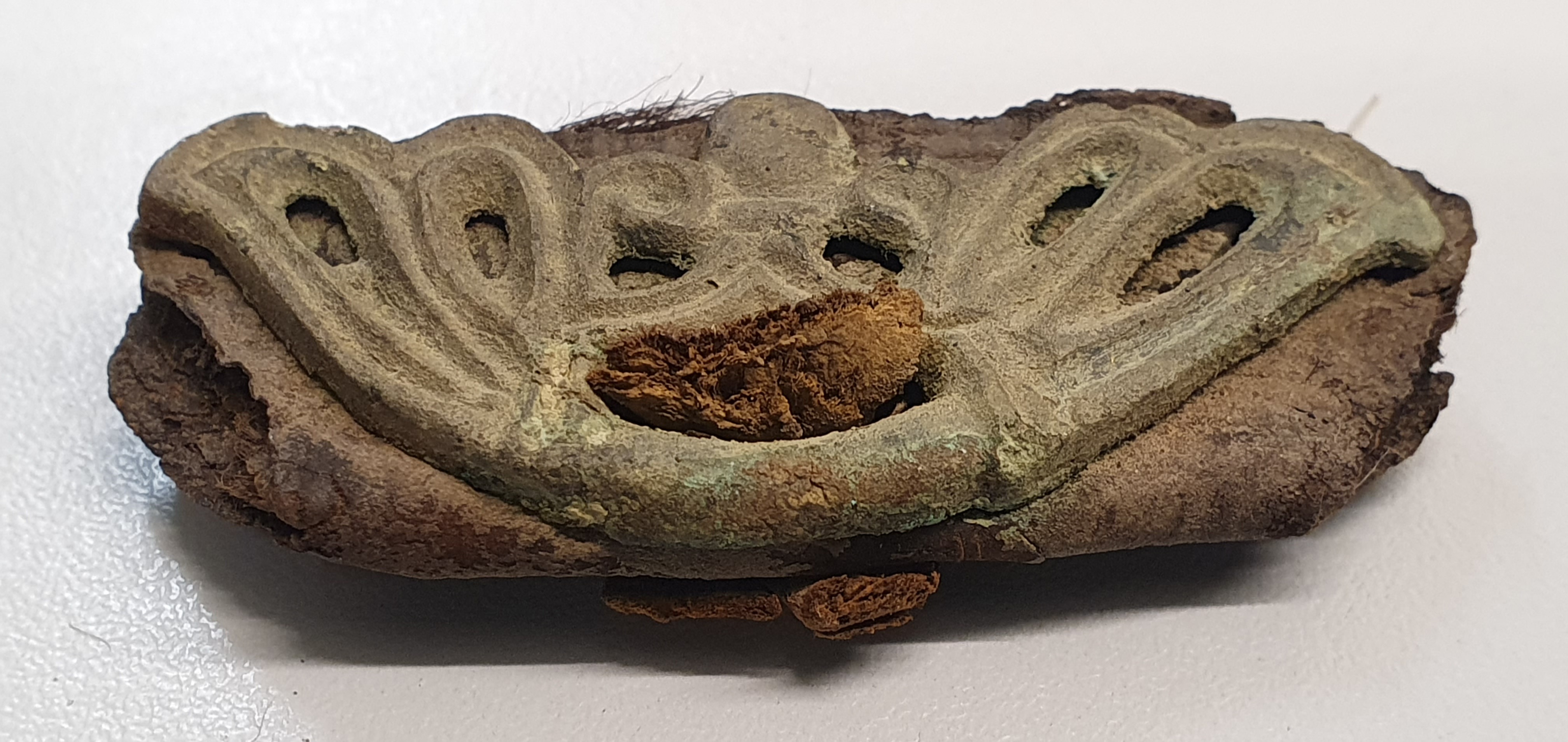 Del av ett bågkoger av östlig typ. I korrosionen finns bevarade hår från skinnet.