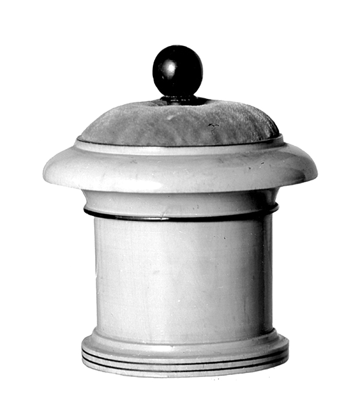 NÅLASK med nåldyna. Av buxbom. Cylindrisk, med skruvlock. Svarvad och polerad. Nedtill kring asken en starkt utstående list med kälformig översida, kring ytterkanten två inlagda smala ränder i svart. Lock lågt, med starkt ustående kant med kälformig undersida och stavformig översida; kring nedre kanten en smal stav i svart. Ovanpå locket en kupig rund dyna, klädd med röd silkessammet, i dynans mitt en sfärisk knopp av ebenholts, fastgängad i locket. Inuti asken en påklistrad vit prislapp med blå kantbård, på lappen fabrikationsnummer m. m. Höjd: 7,3 cm; utan lock, höjd: 3,8 cm; diameter: 4,8 cm. Lock, höjd: 3,9 cm, diameter: 6,4 cm. Gåva till Johanna Kempe på 1840-talet.