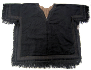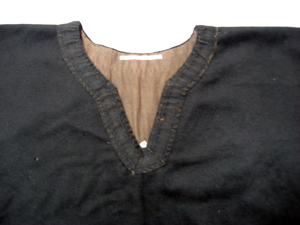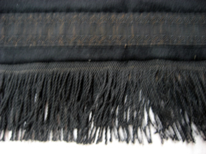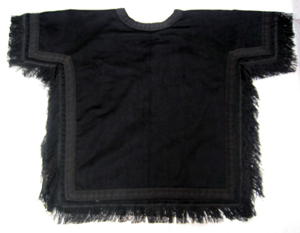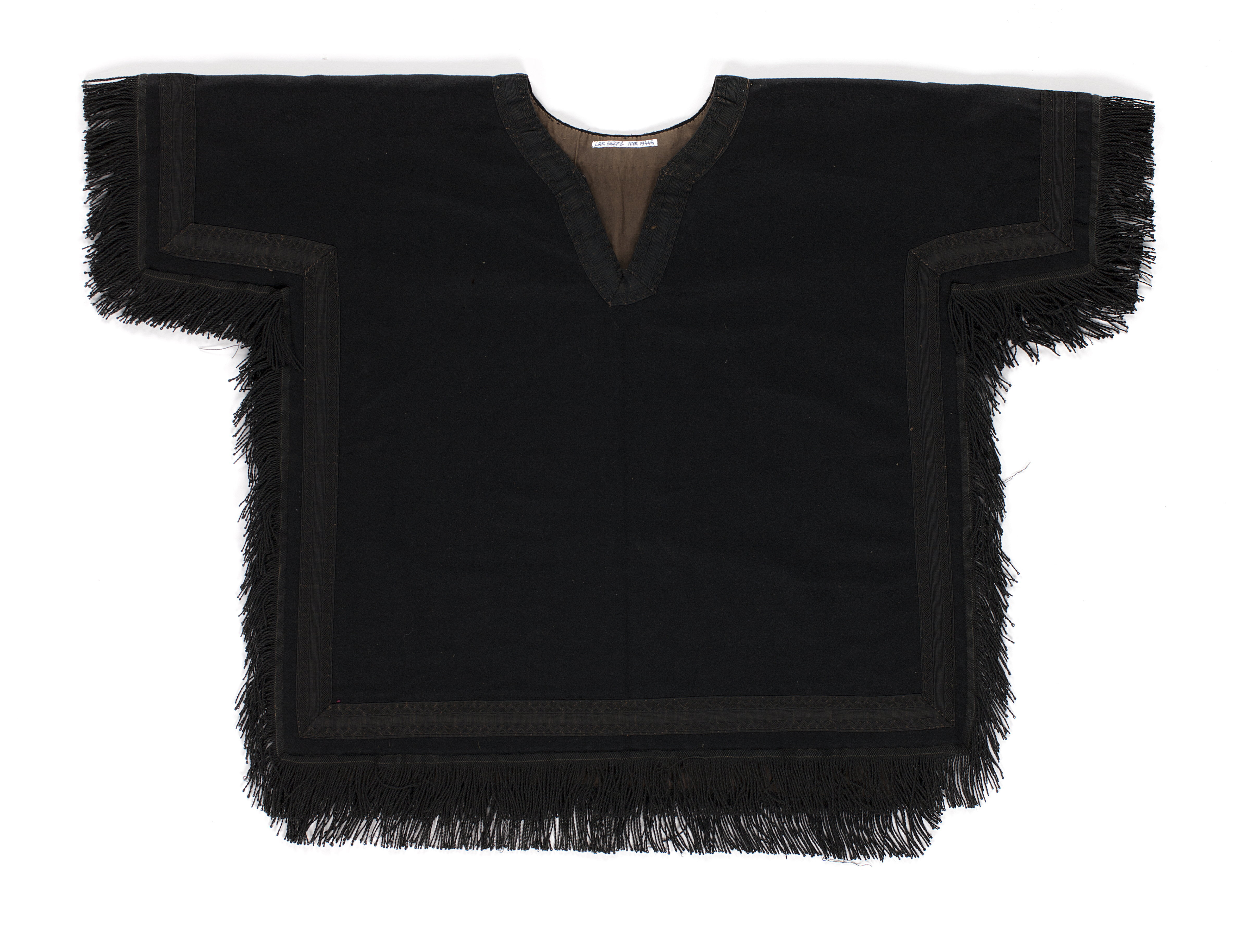 Kåpa av svart kläde sydd ur ett stycke. Kåpan är vid och öppen i sidorna samt med korta vida ärmar, öppna nedtill. Halsringningen är rundat och mitt fram förekommer ett halssprund. Kåpan garneras runtom av svart, vävt silkeband. Ytterst kantas den av en lång tät frans, l. 65 mm, av svart tvinnad silketråd med en smal vävd franskant. Kåpan är på insidan fodrad med svart linnebatist.