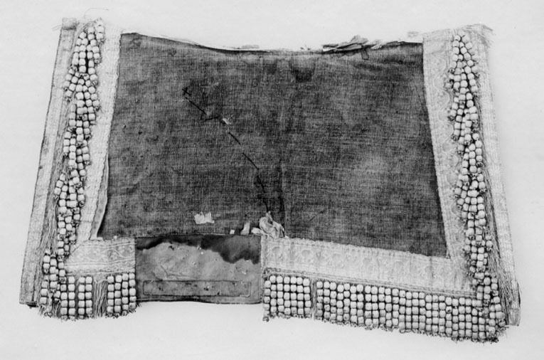 Fyrsidigt schabrak, från början klätt med ljusblå sammet. Av sammeten är fragmentariska rester bevarade, speciellt i tre av hörnen i en tvärgående linje. Sammeten är monterad på grovt, oblekt linne med inslag av hampa. Ett stycke ljusbrun saffian, 220 x 120 mm, sitter på vardera långsidan 200 mm innanför schabrakets främre kant. Nedtill på dessa läderstycken sitter en fastsydd remsa, 190 x 250 mm, i samma material. Schabraket kantas av två rader guldgaloner, skilda av en frans. Den yttersta galonen sitter omedelbart innanför schabrakets kant och är 25 mm bred. 66 mm innanför ytterkanten sitter en ca 70 mm bred frans av gyllene krepiner och guldtråd. Fransen döljer följaktligen den yttersta galonen. I partiet mellan dessa och fransen är den ursprungliga, ljusblå sammeten bevarad. Den inre galonen, b: 69 mm, börjar omedelbart ovanför fransen.