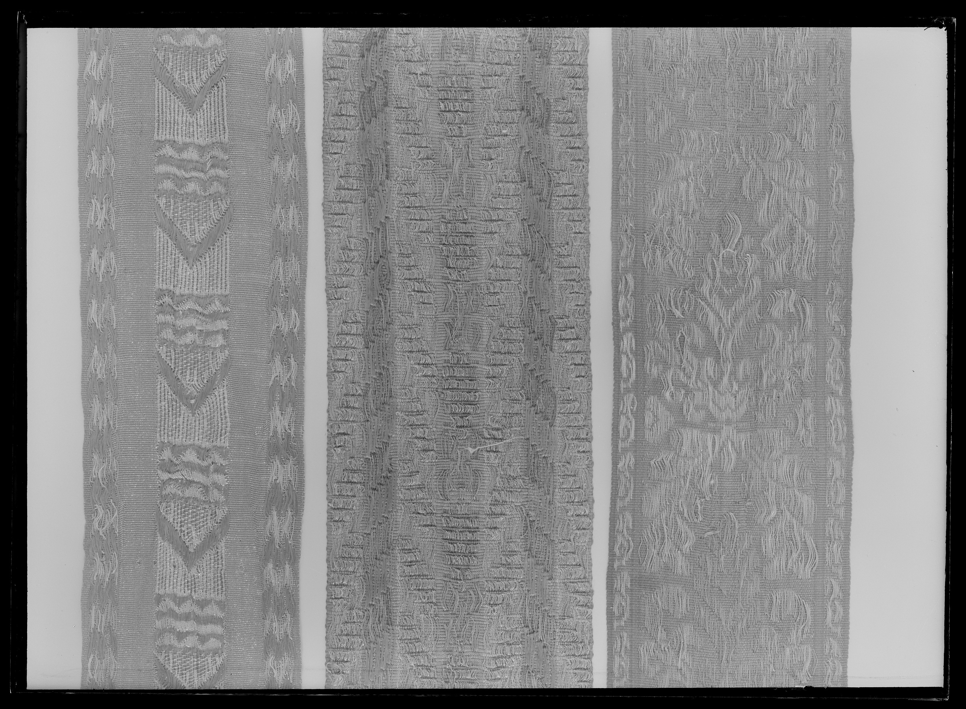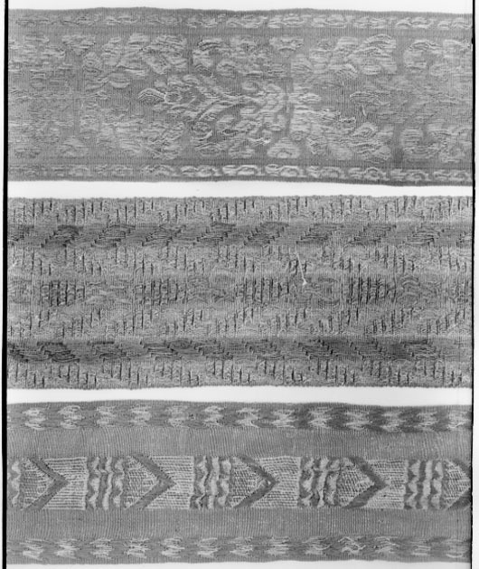 Brett band av rött silke, guld och silvertråd med fransiga kortändar.