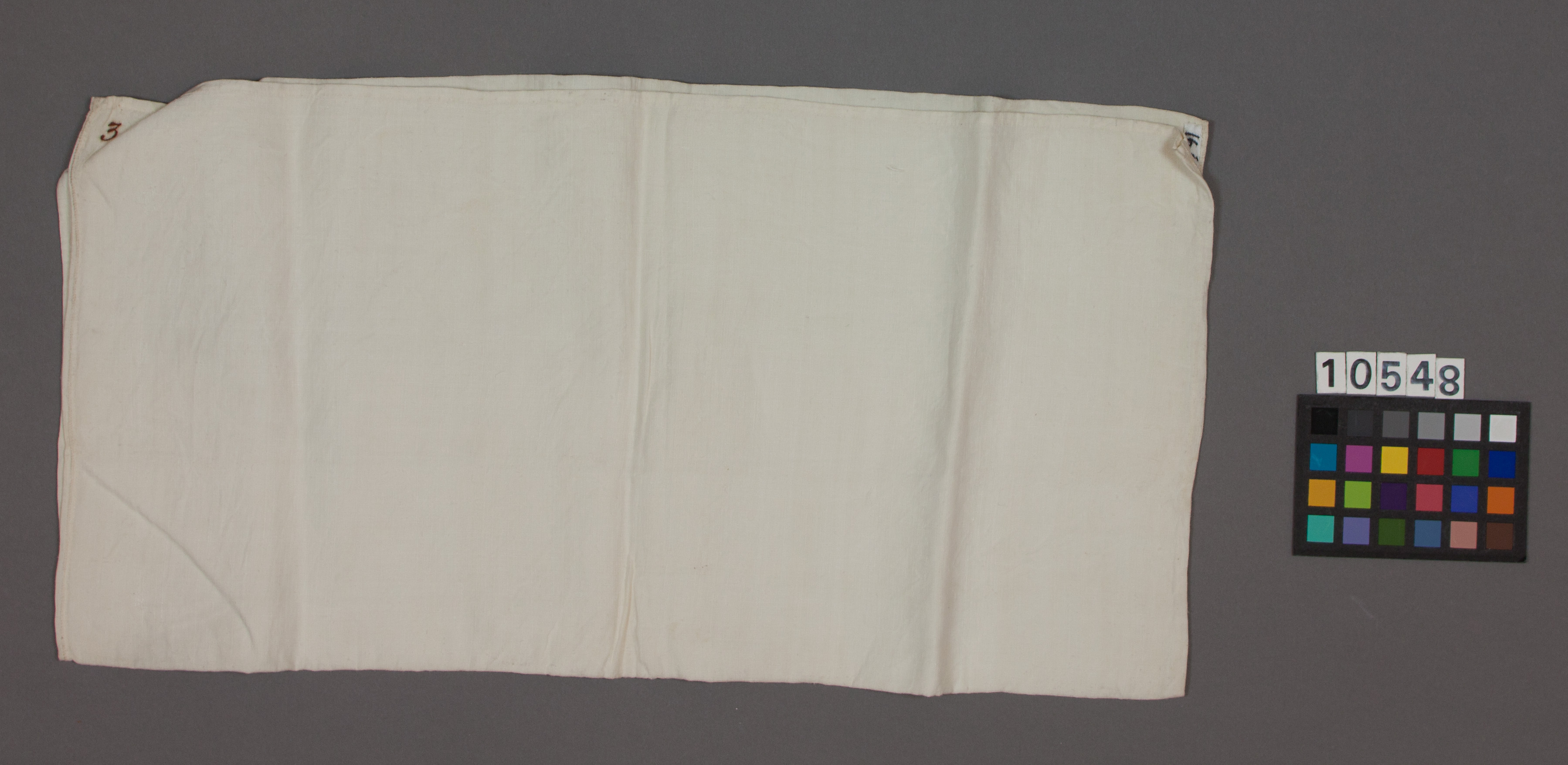 Plagg ingående i en korg med babykläder som använts av Sofia och Oskar (II):s barn. Kvadratiskt örngottsvar av vitt linne med handsydda sömmar. Ena sidan öppen och fållad, i ett hörn med märkbläck "3".
