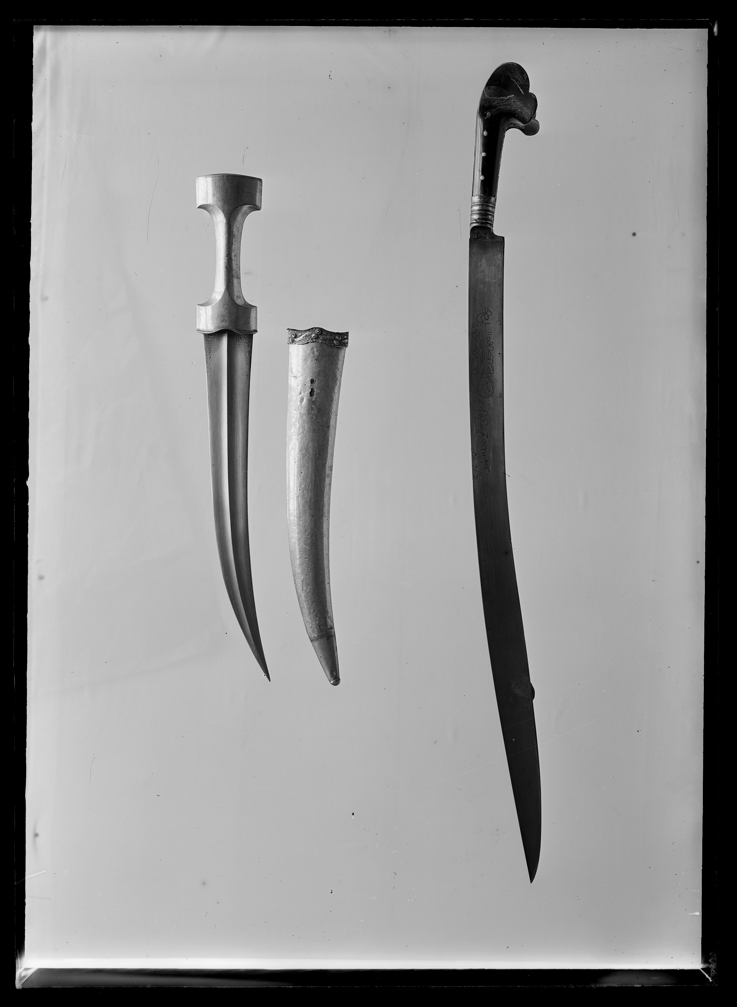 Fäste med spetsovalt tvärsnitt, kraftigt insvängt på mitten där rundat fyrsidigt. Fästet helt klätt med slät silverplåt, runt nederdelen graverad smal ranka med blomornament på ut-och insidans mitt. Klinga böjd, tvåeggad med hög mittås samt skålade mötande skär. Vid basen dekor i form av arabiska skrivtecken i påslaget guld.