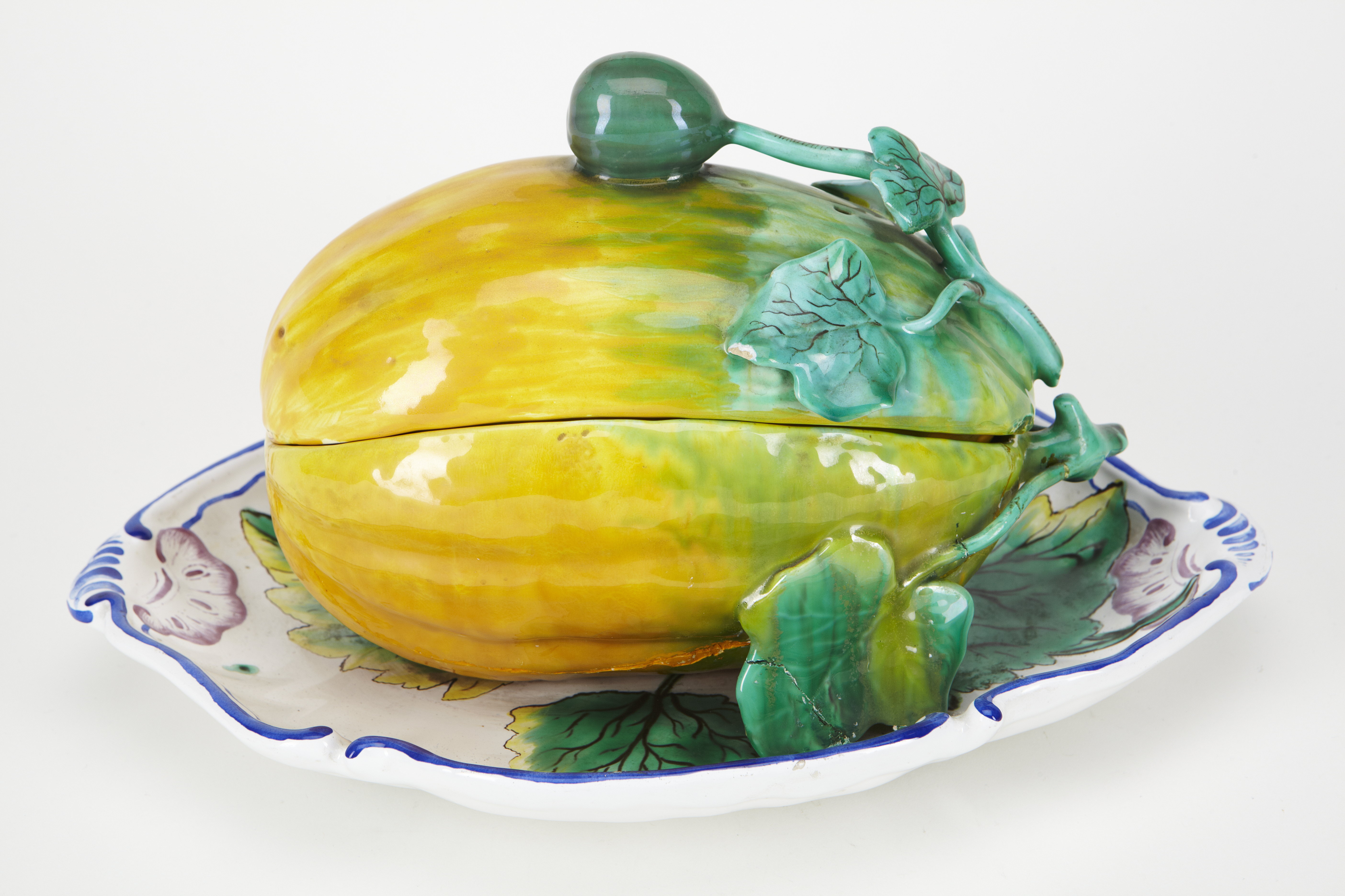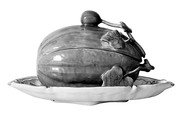 BONBONNIÈRE med lock samt på fast fat. I form av en melon, liggande på ett konturerat avlångt fat. Dekor: I färger på tennglasyr. Godset grågult. Övre delen som lock. Vid ena ändan i fri relief en stjälk med fem blad samt högst upp en knopp (som lockknopp). Melonen brungul utom närmast stjälkfästet, där grön; stjälken jämte blad och knopp i grönt, bladen med nerver i mörkbrunt (den gröna färgen delvis runnen, på de två nedre bladen med ränder i gult). På bottnens utsida en märkning i blått samt på lockets insida. Höjd 16,5 cm, utan lock, höjd 10 cm. Fat, längd 31 cm, bredd 22,2 cm. Då föremålets äkthet ifrågasatts, nedsändes detta 1930 till förste verkmästaren vid Rörstrands Porslinsfabrik, Göteborg, Waldemar Lindström. Ur verkmästares Lindströms svarsskrivelse: " Vad bonbonnièren beträffar, så är den säkert äkta. Märket är precis likt det märke som fanns på en del fat i polycrom, vilka vi hade i vår gamla samling på Rörstrand i Stockholm av gammalt Marieberg." Detta uttalande håller inte Fil. doktor Arvid Baeckström, arkivarie vid Nordiska museet, med om. Han pekar på vissa indicier på pjäsen, så som färgsättningen, signaturen och förbättringar på glasyren och menar att föremålet på grund av dessa väcker tvivel om sin äkthet. (För vidare information se Hallwylska samlingen)